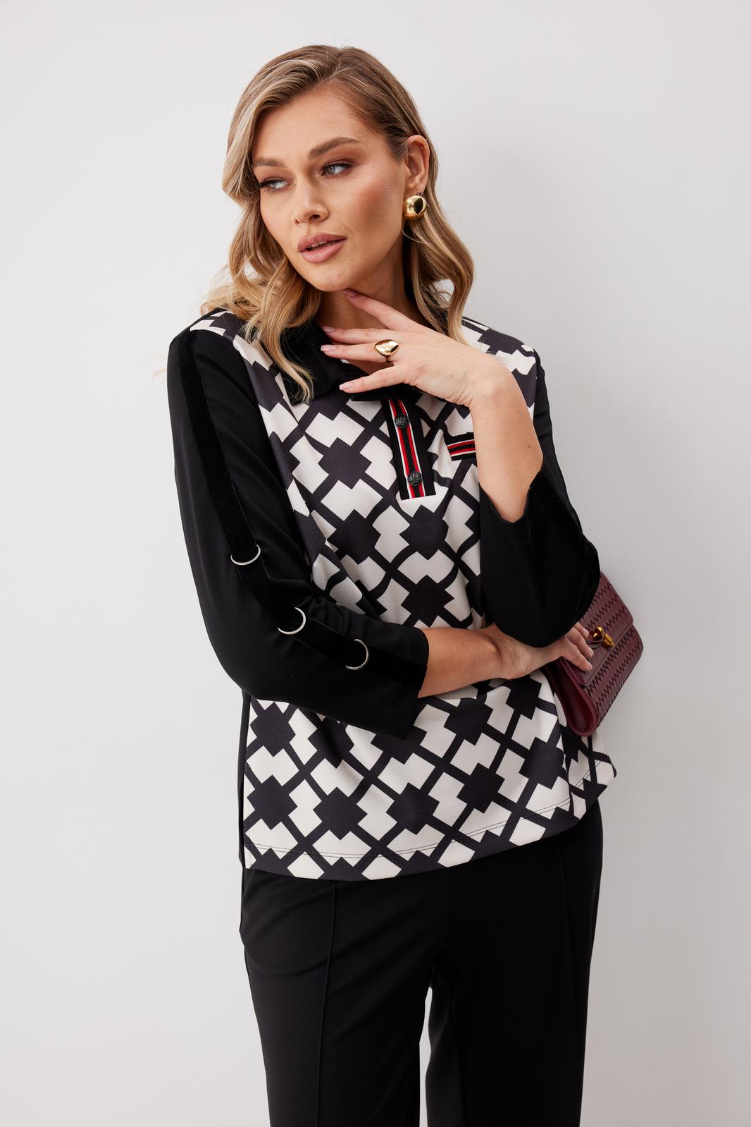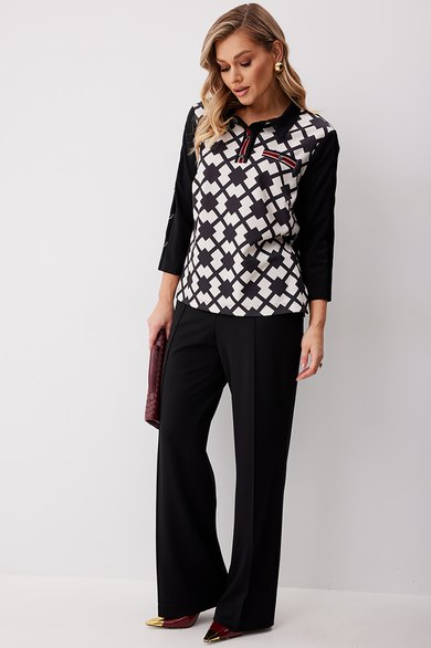Костюм состоящий из блузы с брюками. Блуза по типу «поло» из трикотажной ткани длиной до середины бедра с застежкой до линии груди. Втачные планки обработаны декоративной тесьмой и застегиваются на кнопки. Перед выполнен из ткани с принтом. По левой половинке выполнен карман обманка с листочкой с декоративной тесьмой и кнопкой. Спинка прямая. Горловина обработана втачным воротником. Рукав ¾ прямой одношовный. На рукавах настрочена декоративная бархатная лента, на правом рукаве с тремя полукольцами. Брюки прямого силуэта из трикотажной ткани с поясом на частичной резинке. По передним половинкам брюк застрочены стрелки и выполнены наклонные карманы с отрезным бочком. Верх кармана декорирован бархатной тесьмой. По передним половинкам отстрочен гульфик (имитация). По спинке брюк застрочены вытачки.