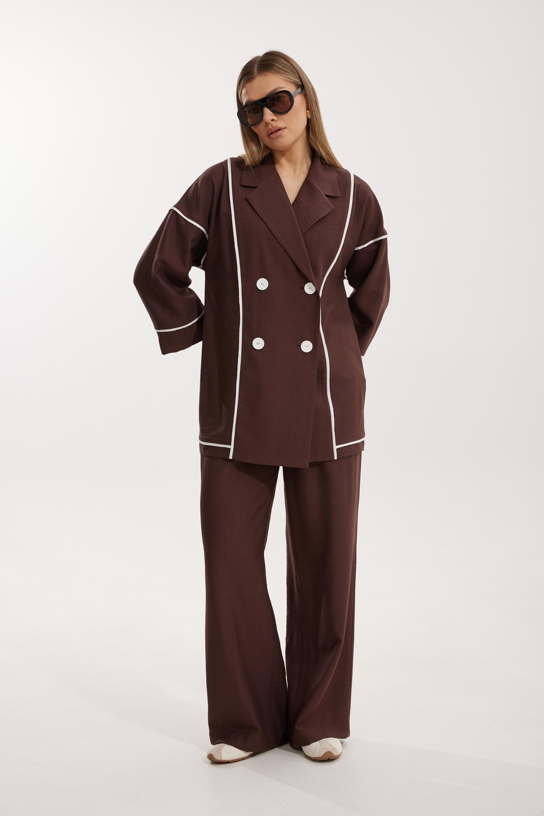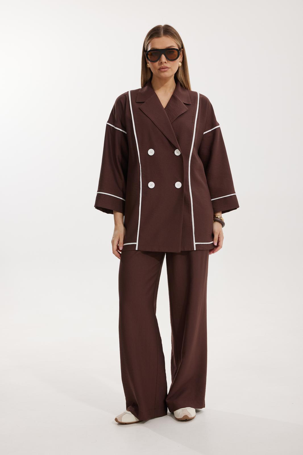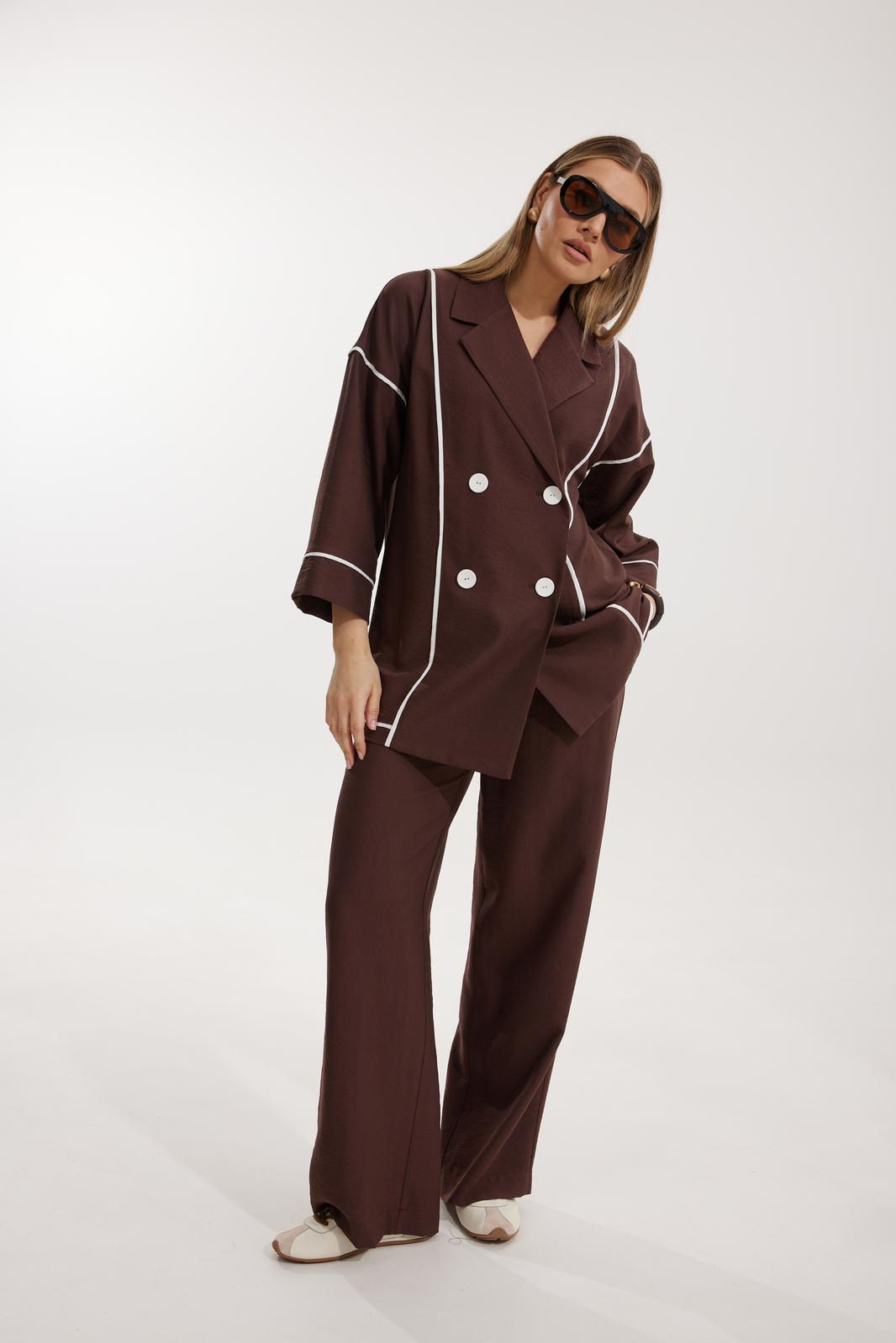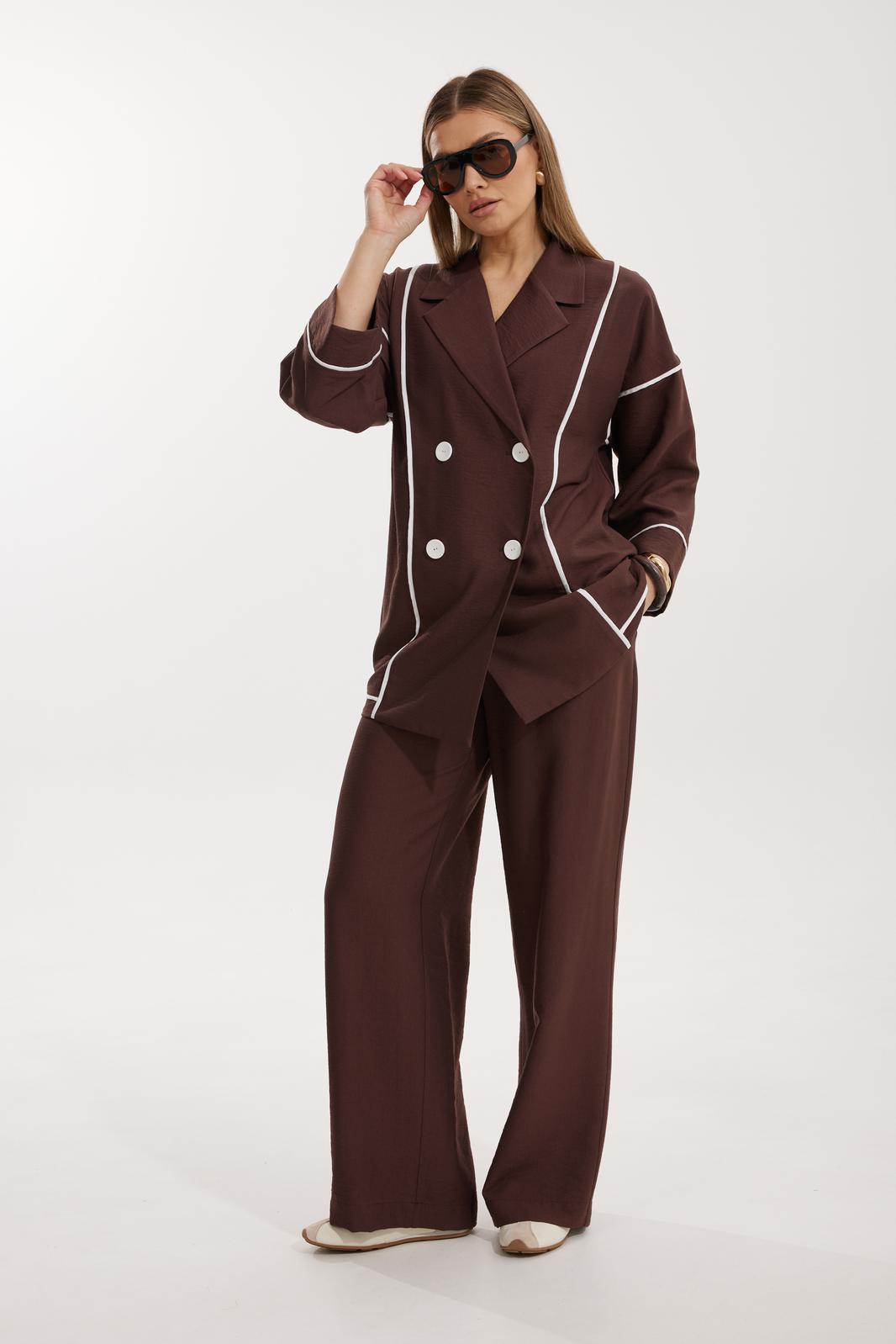 Жакет женский двубортный без подкладки прямого силуэта со спущенной линией плеча длиной за линию бедра. Перед жакета состоит из центральной и боковой части, между ними вставлен контрастного цвета отделочный кант. Спинка состоит из центральной и боковых деталей, в швах располагаются детали канта, контрастного цвета. Рукав втачной одношовный, по низу рукава пришита отрезная манжета, в швах располагается контрастный кант. Горловина обработана отрезным воротником с лацканом. Застежка двубортная на отделочные контрастные пуговицы. Брюки прямого силуэта с карманами в боковом шве и имитацией гульфика. На задних половинках брюк застрочены вытачки. Пояс притачной на резинке со шнуром в цвет отделочного канта.
