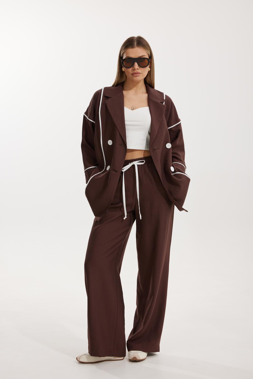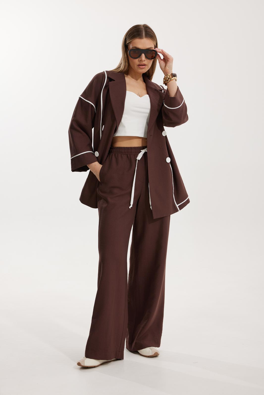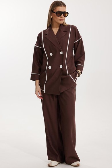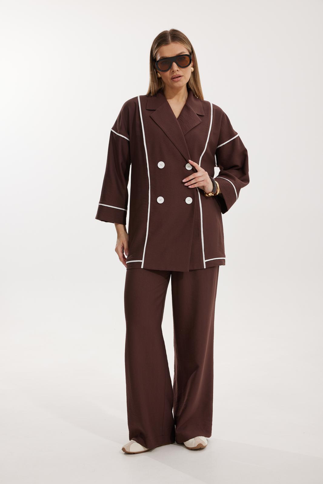 Жакет женский двубортный без подкладки прямого силуэта со спущенной линией плеча длиной за линию бедра. Перед жакета состоит из центральной и боковой части, между ними вставлен контрастного цвета отделочный кант. Спинка состоит из центральной и боковых деталей, в швах располагаются детали канта, контрастного цвета. Рукав втачной одношовный, по низу рукава пришита отрезная манжета, в швах располагается контрастный кант. Горловина обработана отрезным воротником с лацканом. Застежка двубортная на отделочные контрастные пуговицы. Брюки прямого силуэта с карманами в боковом шве и имитацией гульфика. На задних половинках брюк застрочены вытачки. Пояс притачной на резинке со шнуром в цвет отделочного канта.