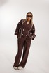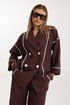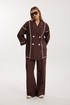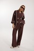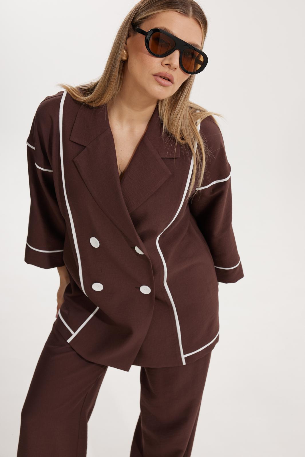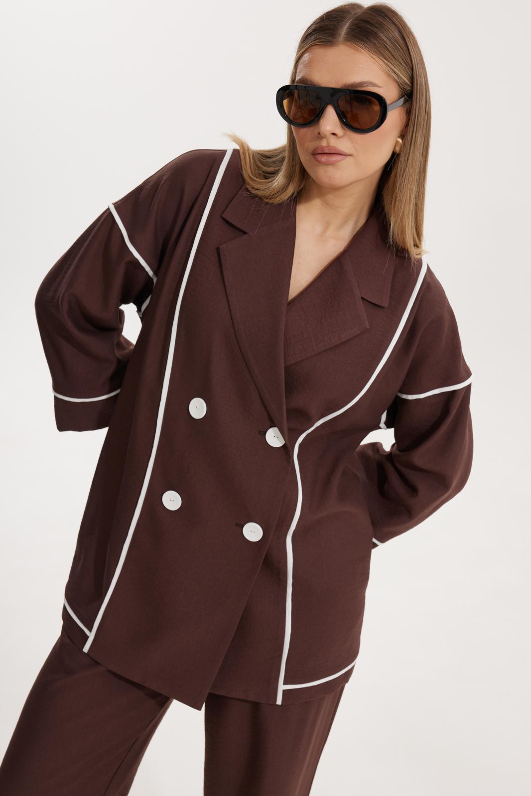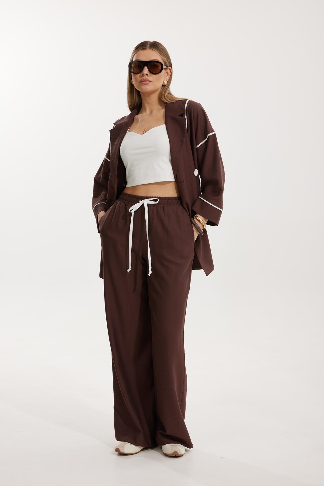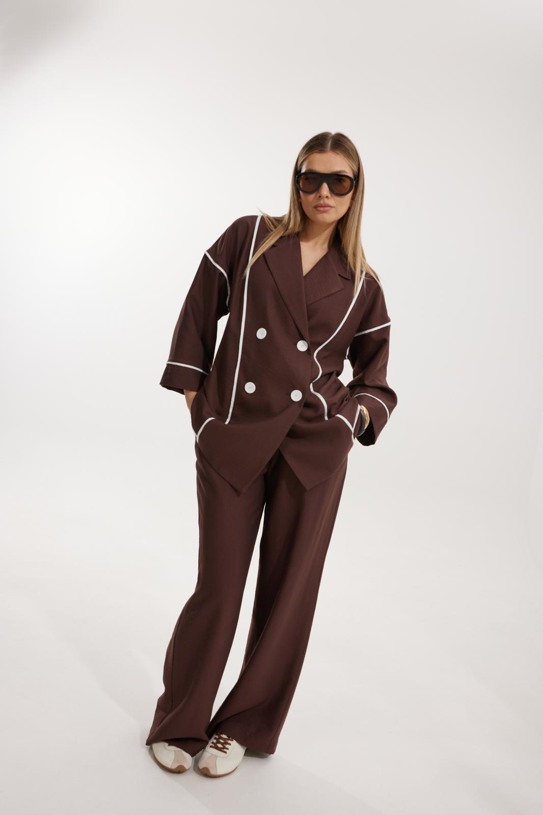 Жакет женский двубортный без подкладки прямого силуэта со спущенной линией плеча длиной за линию бедра. Перед жакета состоит из центральной и боковой части, между ними вставлен контрастного цвета отделочный кант. Спинка состоит из центральной и боковых деталей, в швах располагаются детали канта, контрастного цвета. Рукав втачной одношовный, по низу рукава пришита отрезная манжета, в швах располагается контрастный кант. Горловина обработана отрезным воротником с лацканом. Застежка двубортная на отделочные контрастные пуговицы. Брюки прямого силуэта с карманами в боковом шве и имитацией гульфика. На задних половинках брюк застрочены вытачки. Пояс притачной на резинке со шнуром в цвет отделочного канта.
