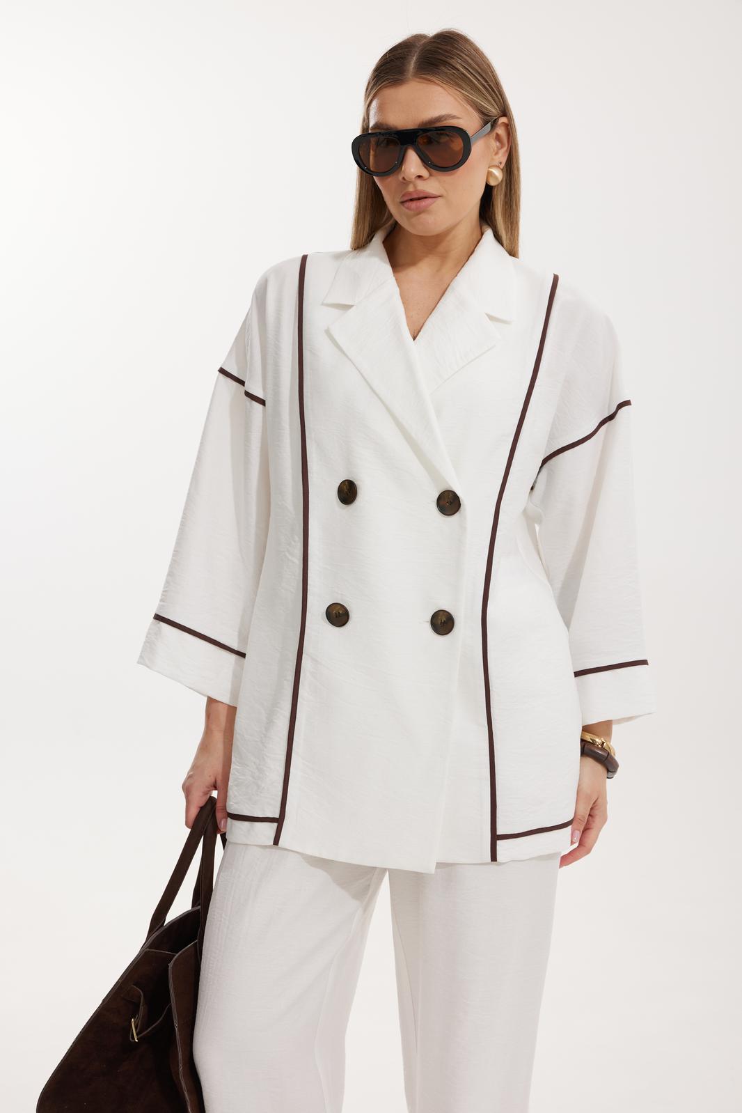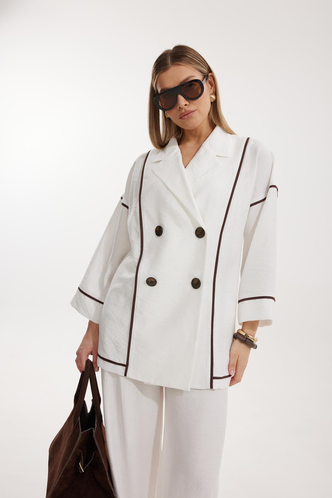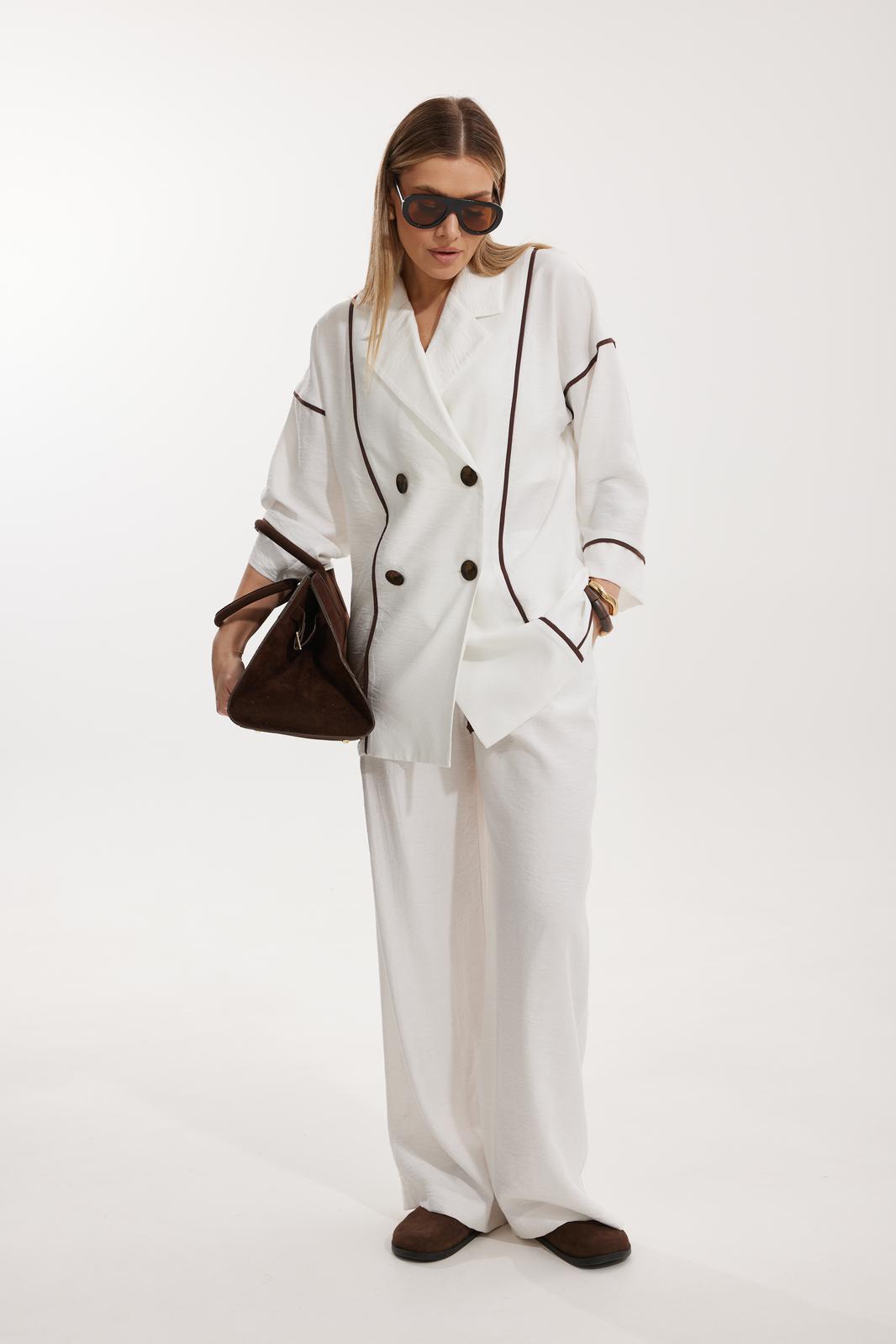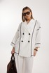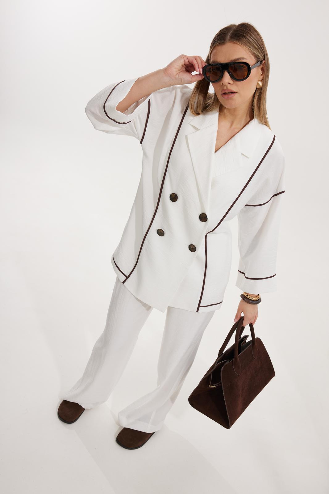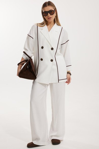 Жакет женский двубортный без подкладки прямого силуэта со спущенной линией плеча длиной за линию бедра. Перед жакета состоит из центральной и боковой части, между ними вставлен контрастного цвета отделочный кант. Спинка состоит из центральной и боковых деталей, в швах располагаются детали канта, контрастного цвета. Рукав втачной одношовный, по низу рукава пришита отрезная манжета, в швах располагается контрастный кант. Горловина обработана отрезным воротником с лацканом. Застежка двубортная на отделочные контрастные пуговицы. Брюки прямого силуэта с карманами в боковом шве и имитацией гульфика. На задних половинках брюк застрочены вытачки. Пояс притачной на резинке со шнуром в цвет отделочного канта.