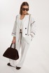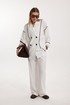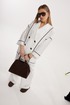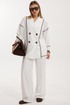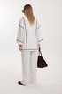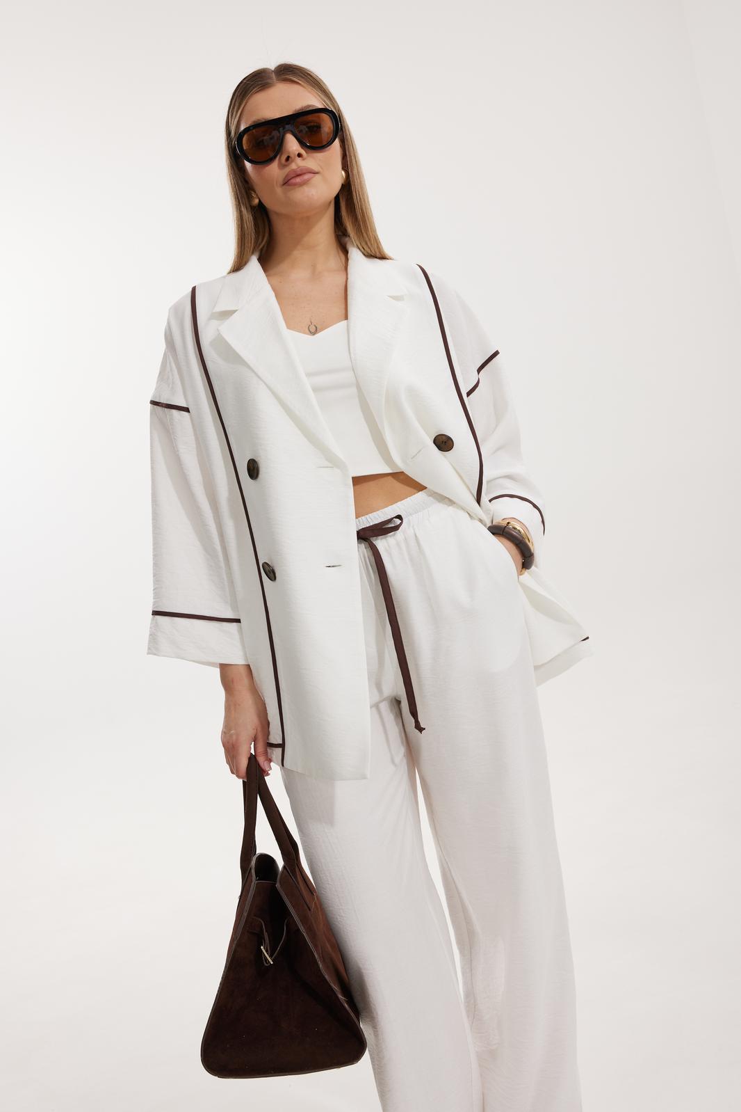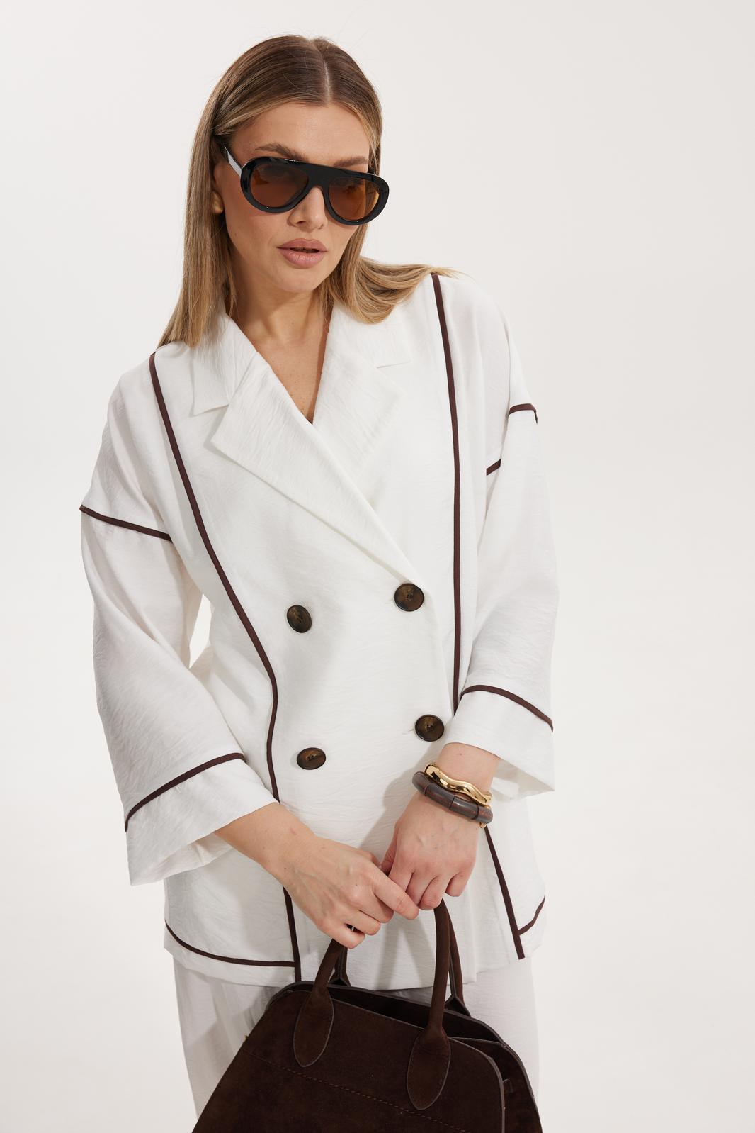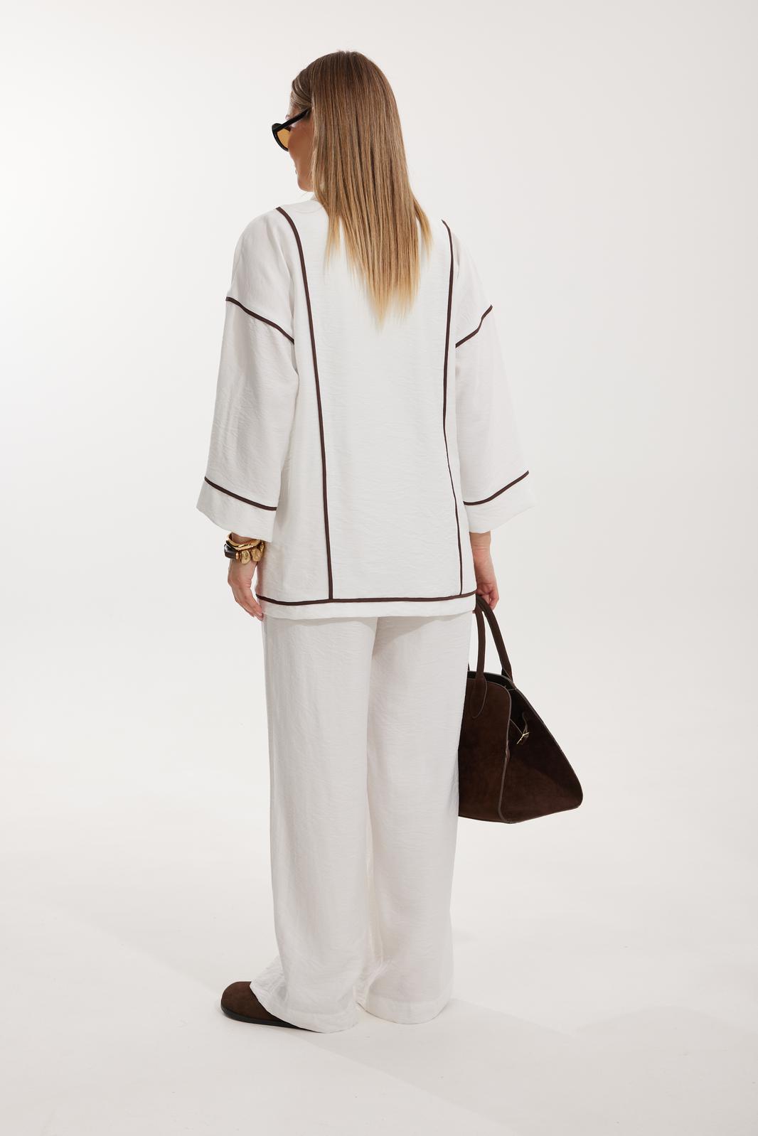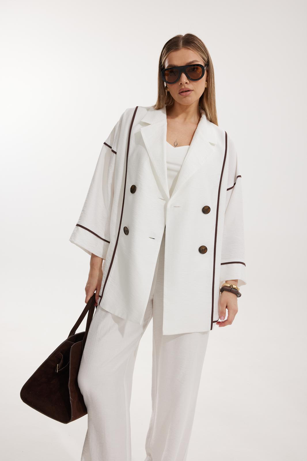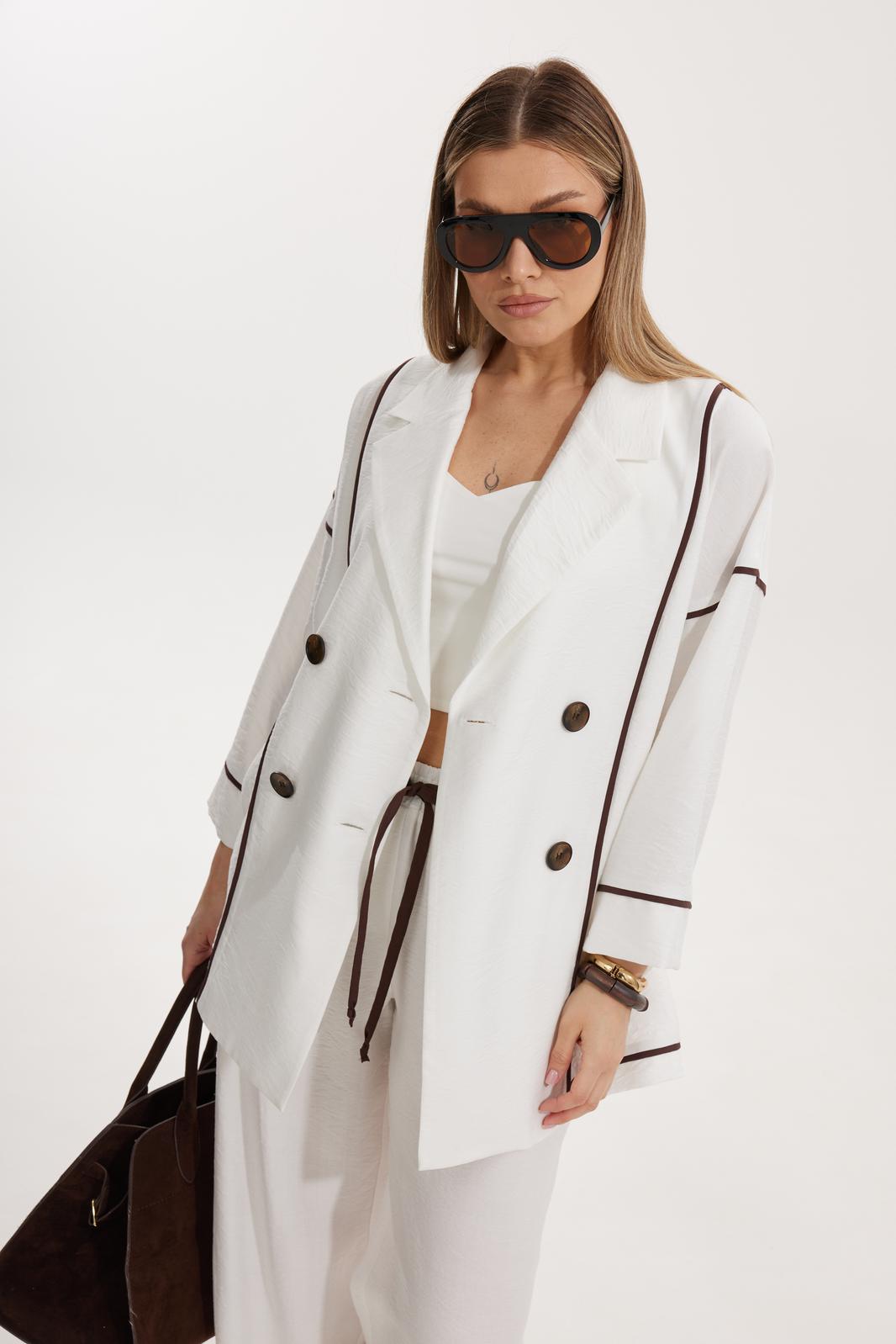 Жакет женский двубортный без подкладки прямого силуэта со спущенной линией плеча длиной за линию бедра. Перед жакета состоит из центральной и боковой части, между ними вставлен контрастного цвета отделочный кант. Спинка состоит из центральной и боковых деталей, в швах располагаются детали канта, контрастного цвета. Рукав втачной одношовный, по низу рукава пришита отрезная манжета, в швах располагается контрастный кант. Горловина обработана отрезным воротником с лацканом. Застежка двубортная на отделочные контрастные пуговицы. Брюки прямого силуэта с карманами в боковом шве и имитацией гульфика. На задних половинках брюк застрочены вытачки. Пояс притачной на резинке со шнуром в цвет отделочного канта.