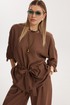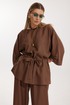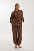 Костюм женский, состоящий из блузы и брюк. Блуза кроя «летучая мышь» длиной за линию бедра. Перед цельный с округлой горловиной. Спинка со средним швом. В районе талии обработана кулиса с широким поясом. По низу рукава по передней части выполнено несколько рядов сборки. Горловина обработана окантовкой. Брюки прямого силуэта с поясом на резинке. По передним половинкам заложены складки и обработаны наклонные карманы с отрезным бочком По низу брюки собраны на резинку. Верхний срез брюк обработан отрезным поясом на частичной резинке.