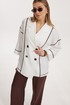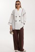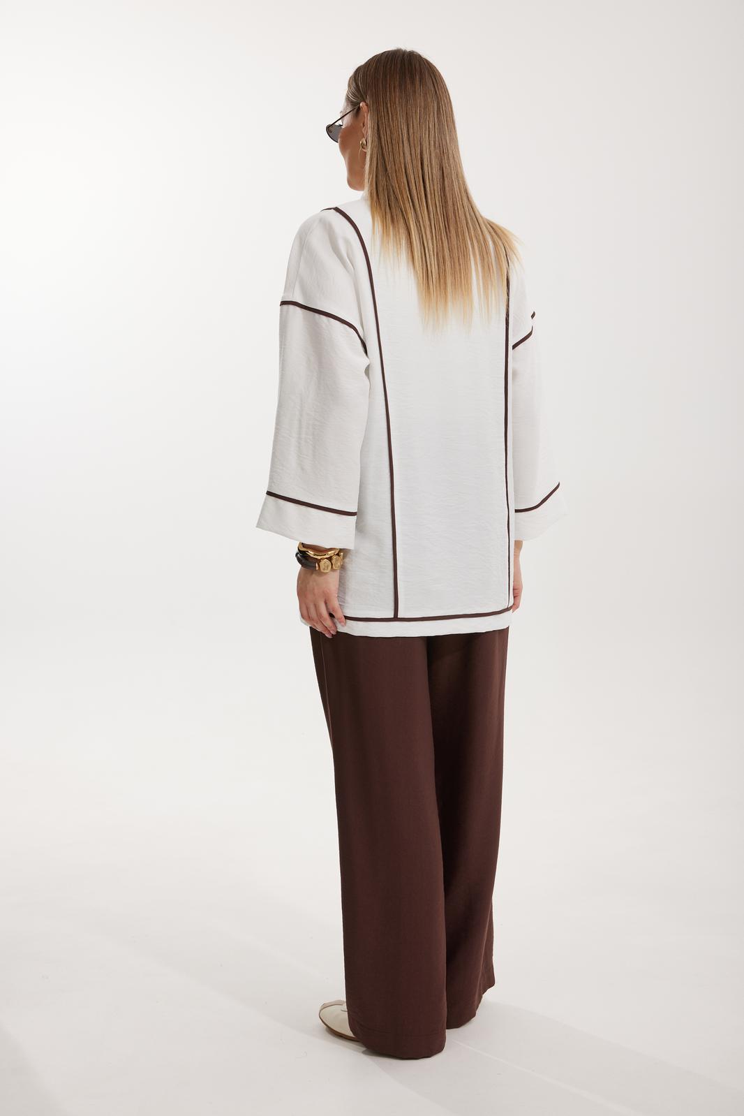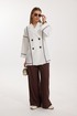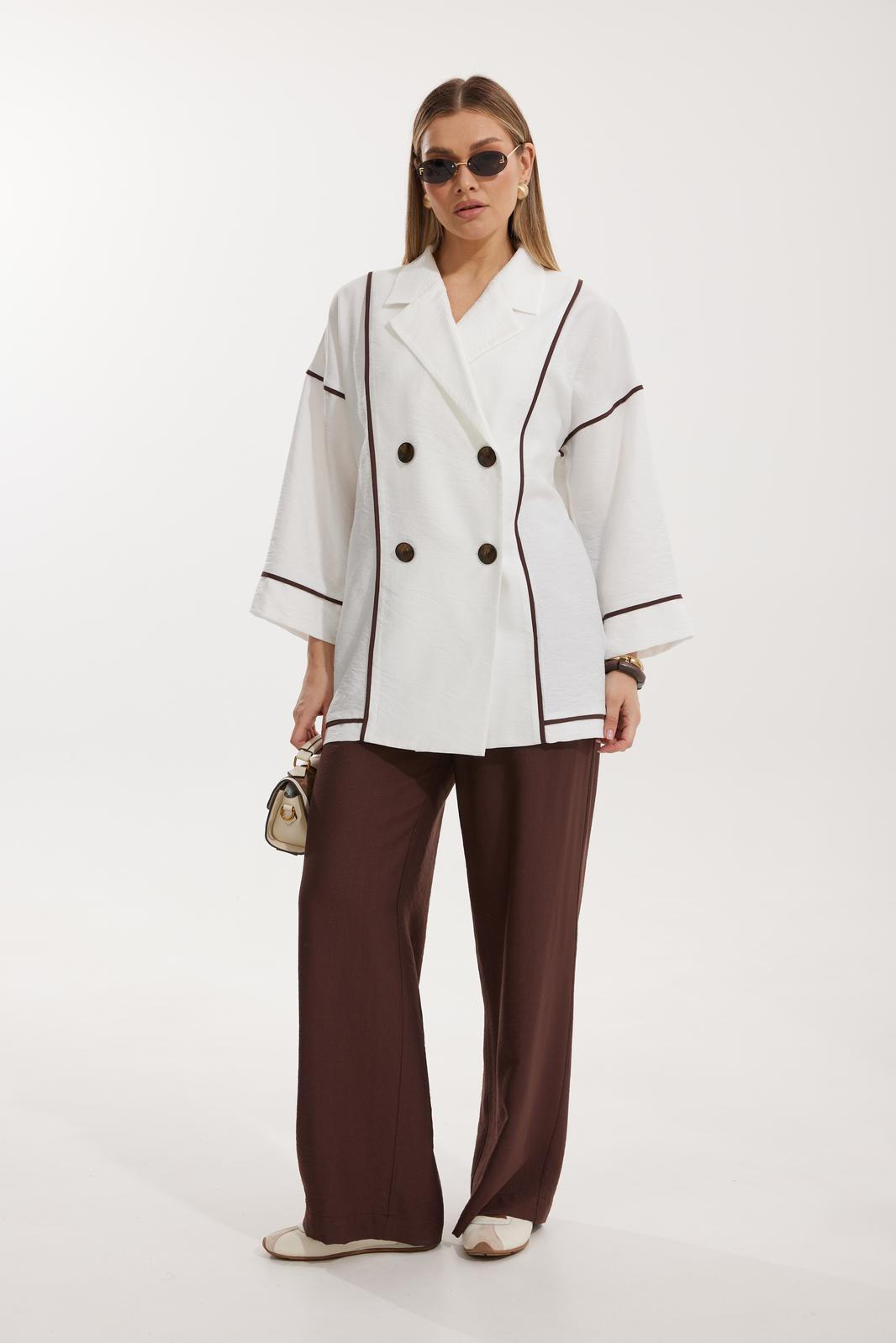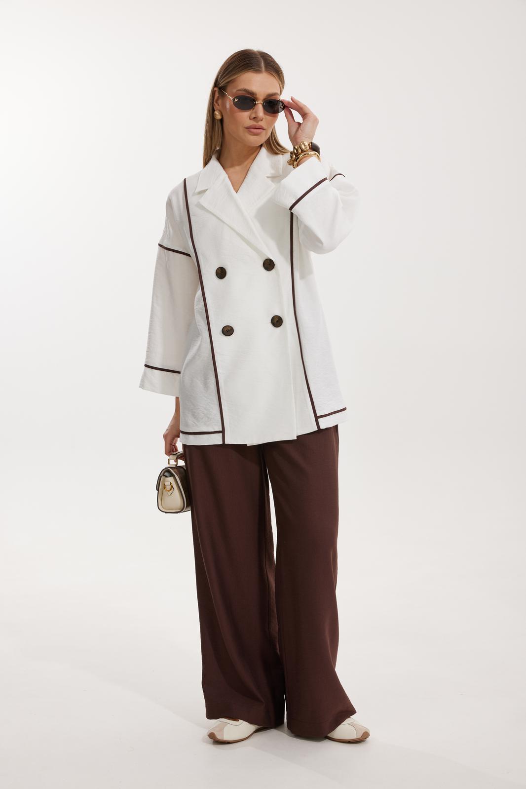 Жакет женский двубортный без подкладки прямого силуэта со спущенной линией плеча длиной за линию бедра. Перед жакета состоит из центральной и боковой части, между ними вставлен отделочный кант контрастного цвета. Спинка состоит из центральной и боковых деталей, в швах располагаются детали канта, контрастного цвета. Рукав втачной одношовный, по низу рукава пришита отрезная манжета, в швах располагается контрастный кант. Горловина обработана отрезным воротником с лацканом. Застежка двубортная на отделочные контрастные пуговицы. Брюки контрастного цвета прямого силуэта с карманами в боковом шве и имитацией гульфика. На задних половинках брюк застрочены вытачки. Пояс притачной на резинке со шнуром в цвет отделочного канта.