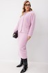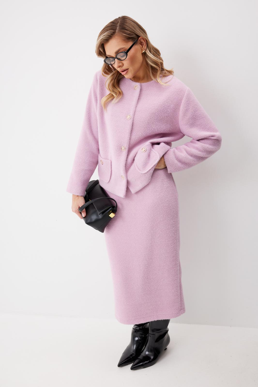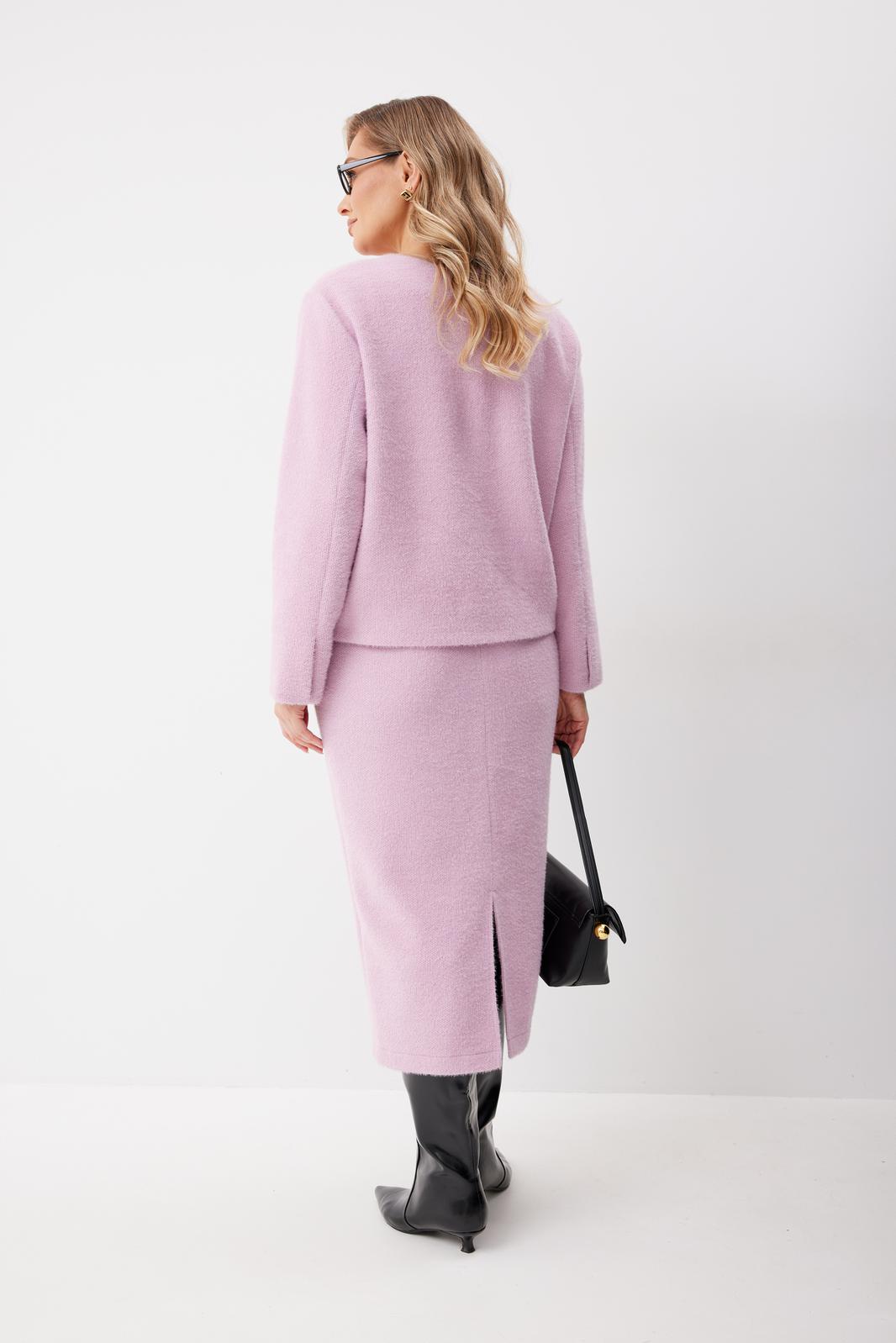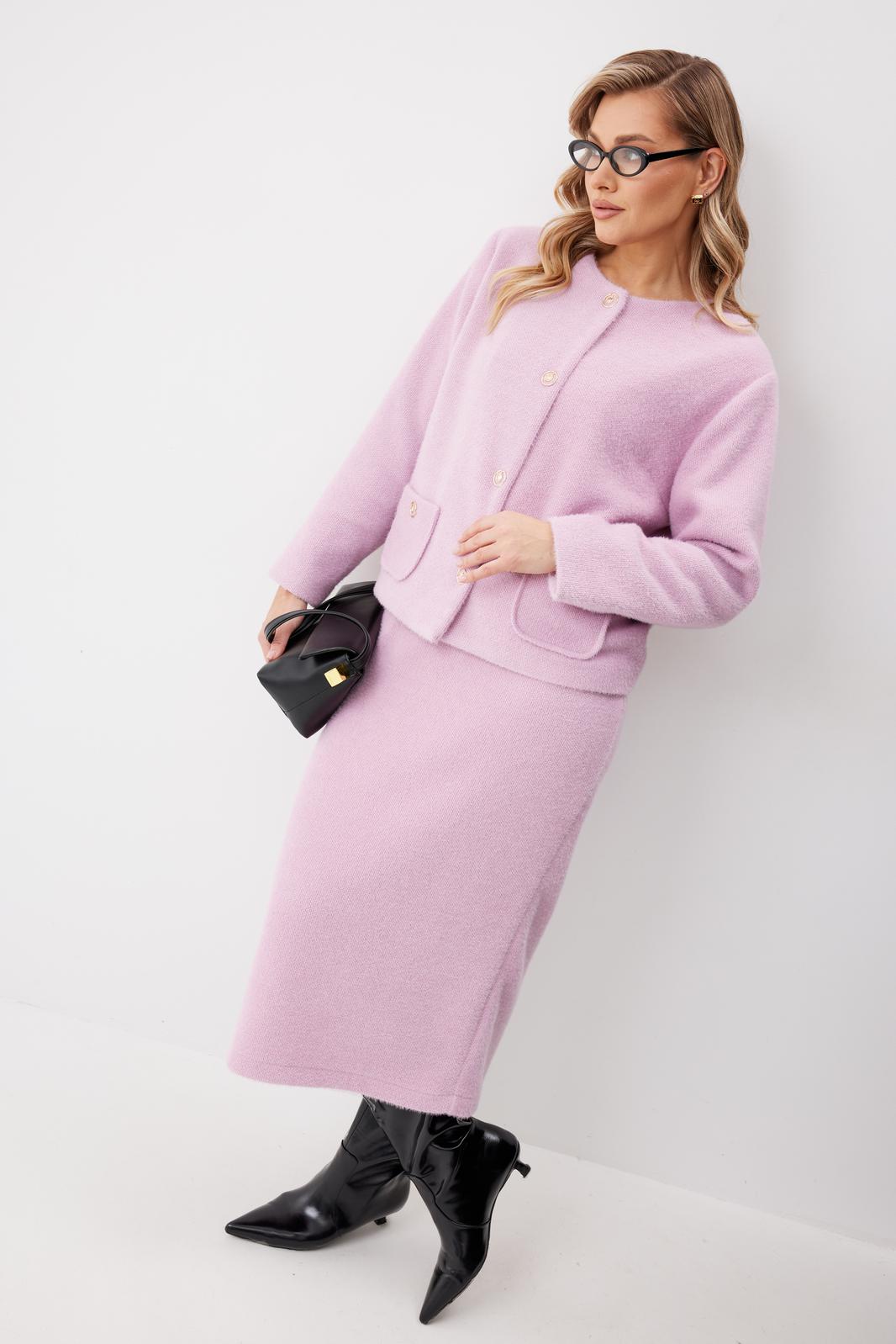 Костюм женский состоящий из жакета и юбки. Жакет женский из трикотажной ткани прямого силуэта на подкладке. На деталях переда настрочены накладные карманы округлой формы застегивающиеся на декоративные кнопки. Спинка прямая. Рукав двухшовный с имитацией шлицы. Горловина округлой формы. Жакет застегивается на декоративные кнопки.