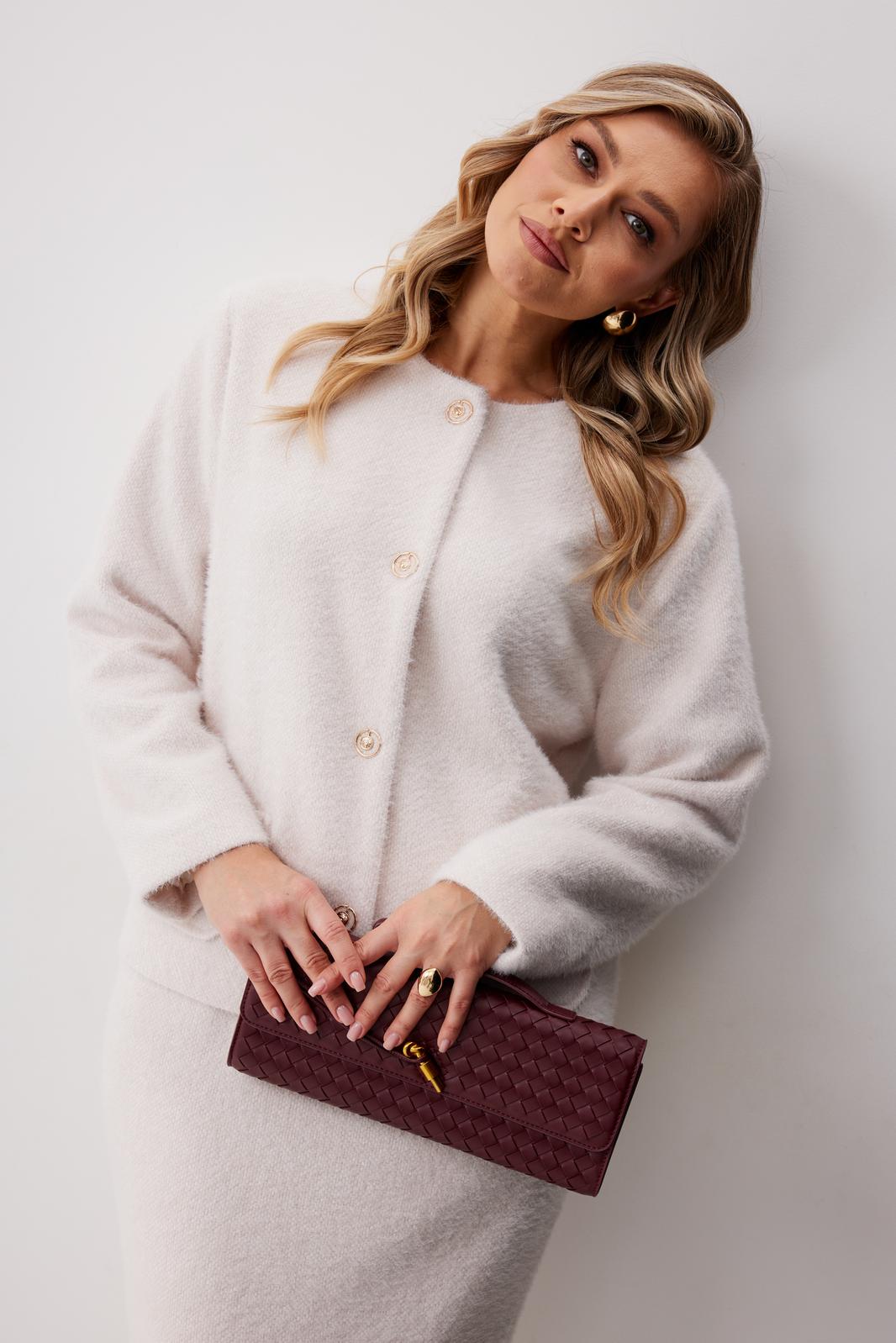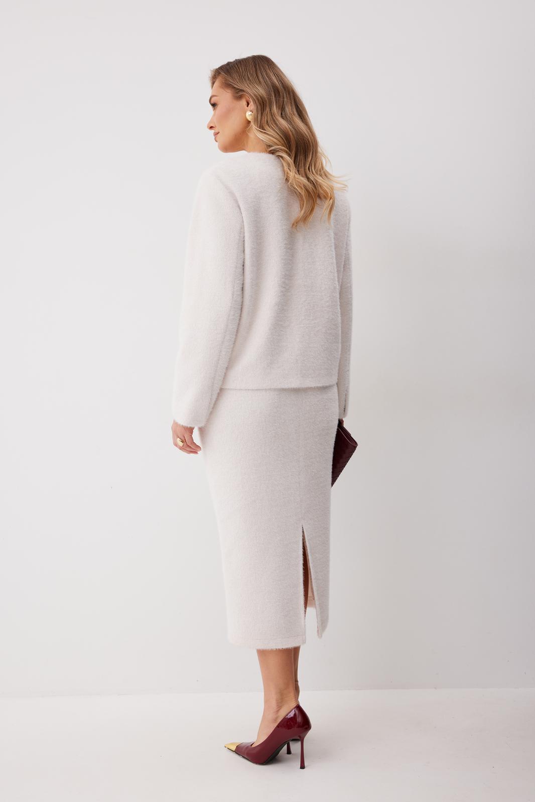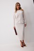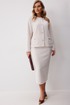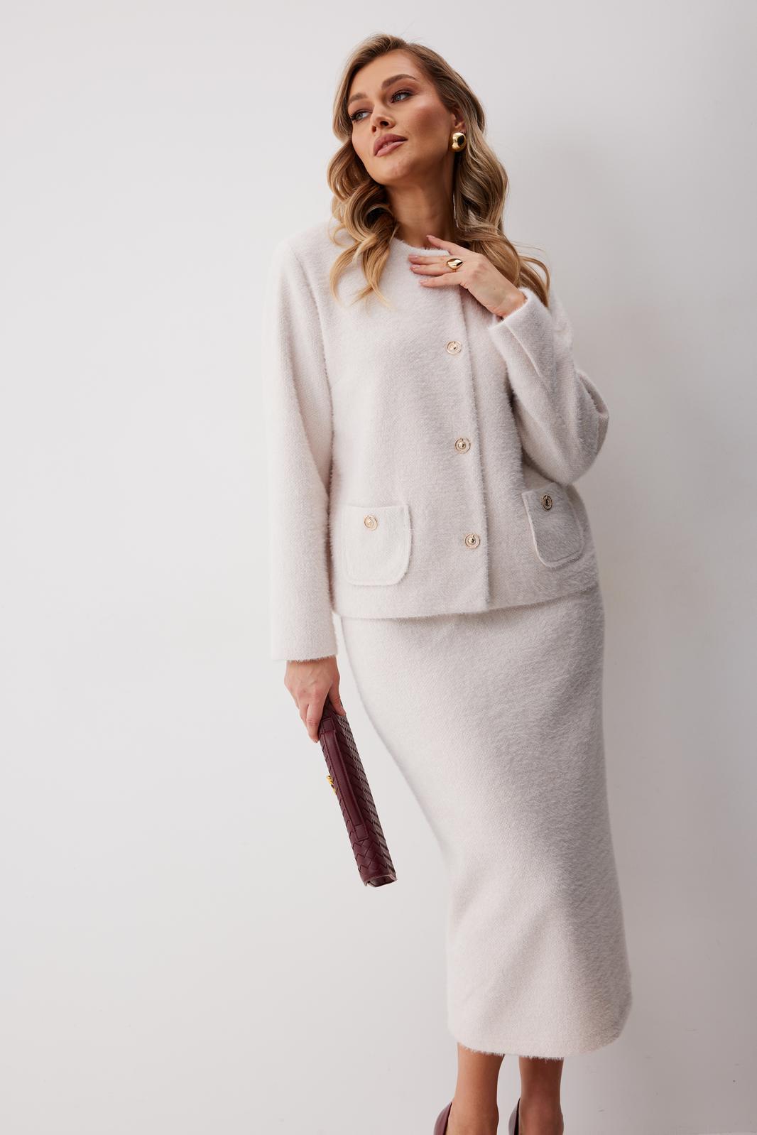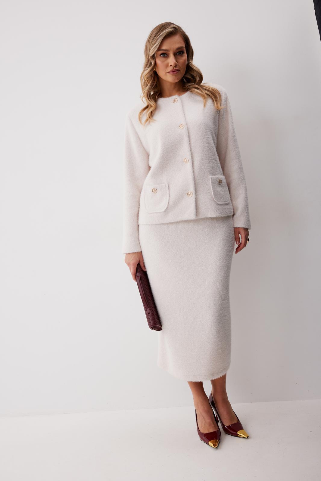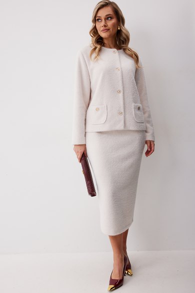 Костюм женский состоящий из жакета и юбки. Жакет женский из трикотажной ткани прямого силуэта на подкладке. На деталях переда настрочены накладные карманы округлой формы застегивающиеся на декоративные кнопки. Спинка прямая. Рукав двухшовный с имитацией шлицы. Горловина округлой формы. Жакет застегивается на декоративные кнопки.