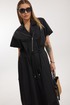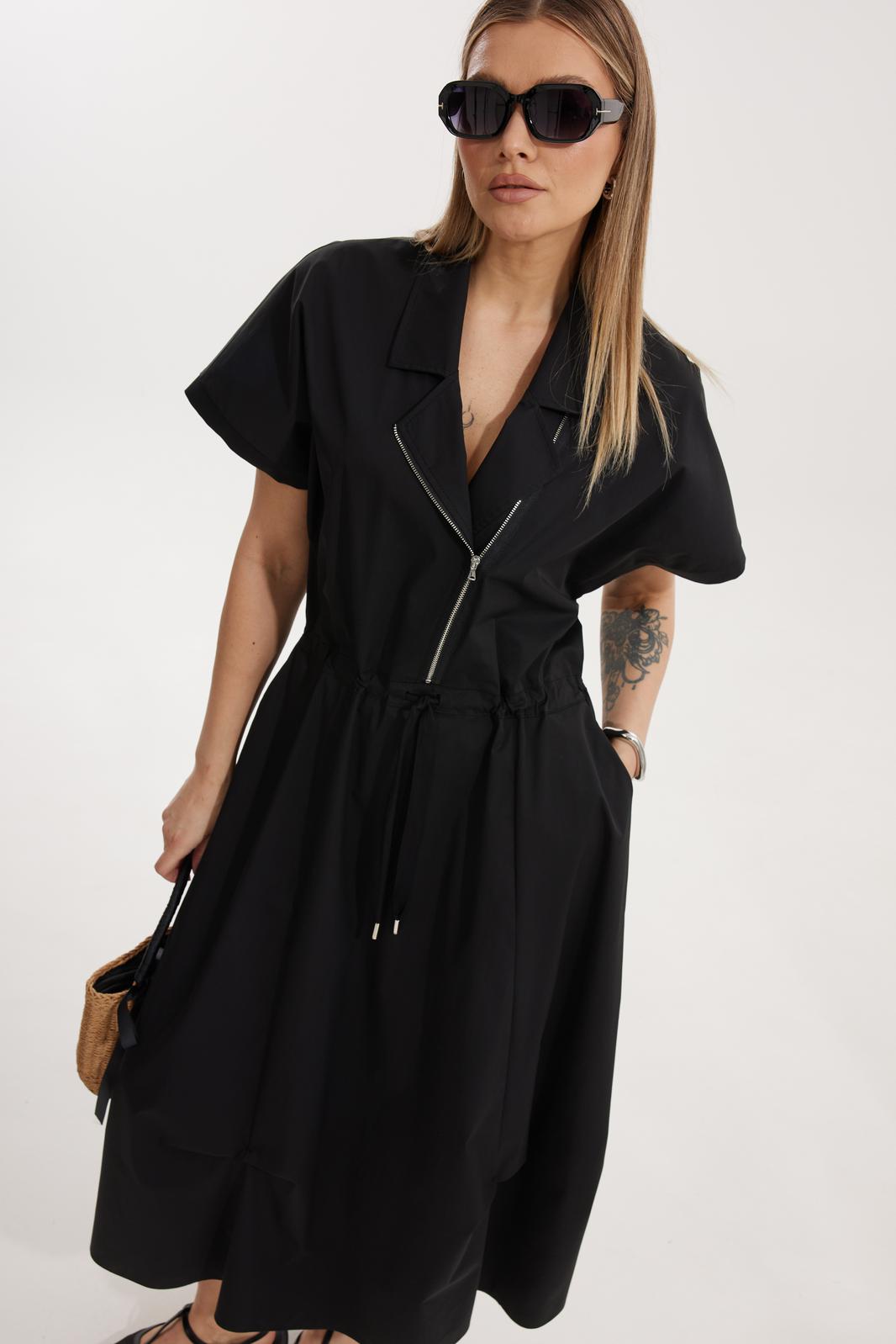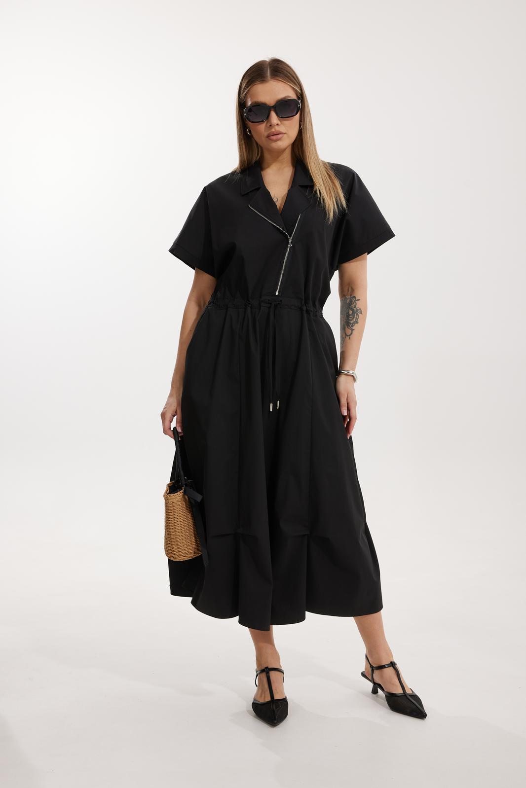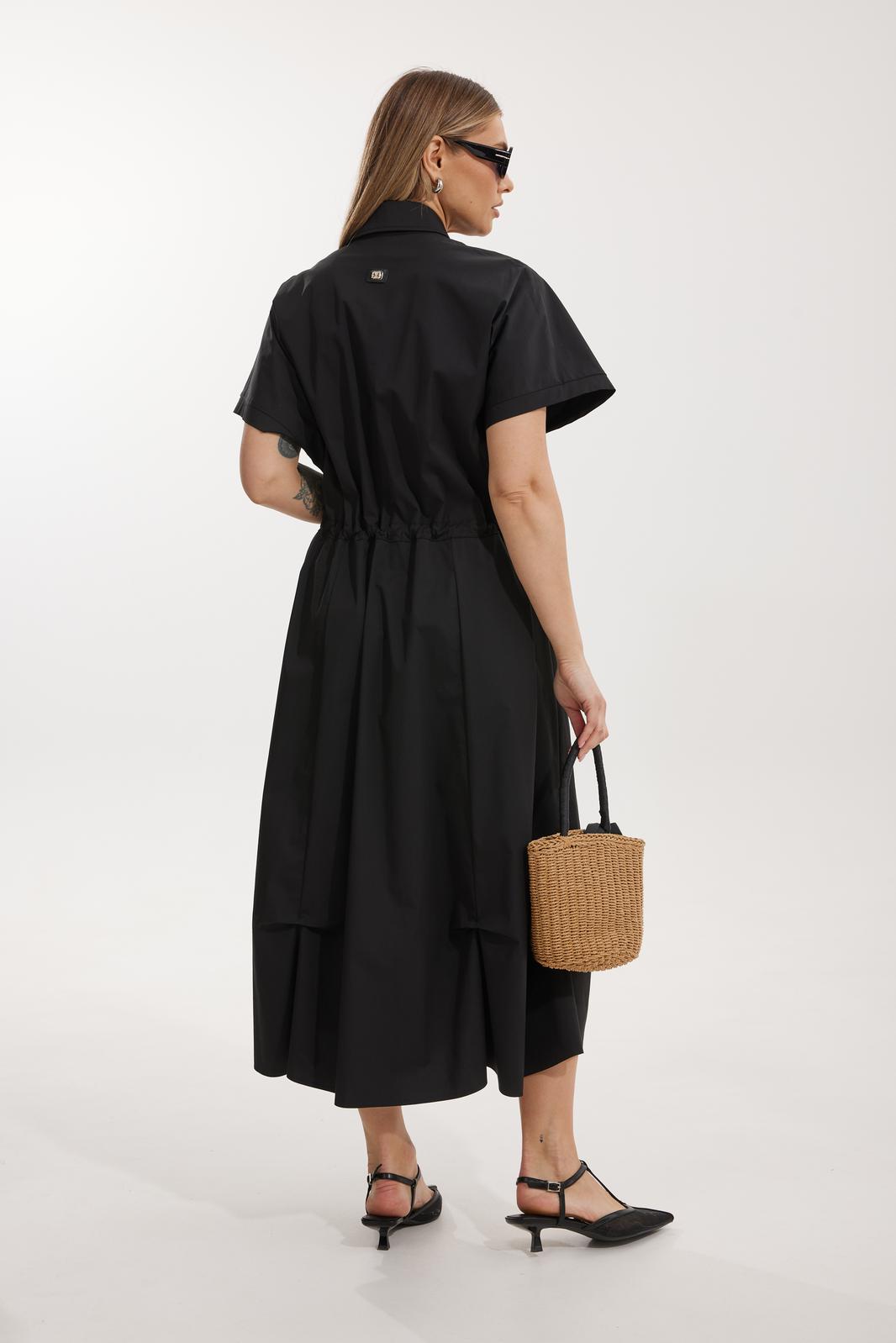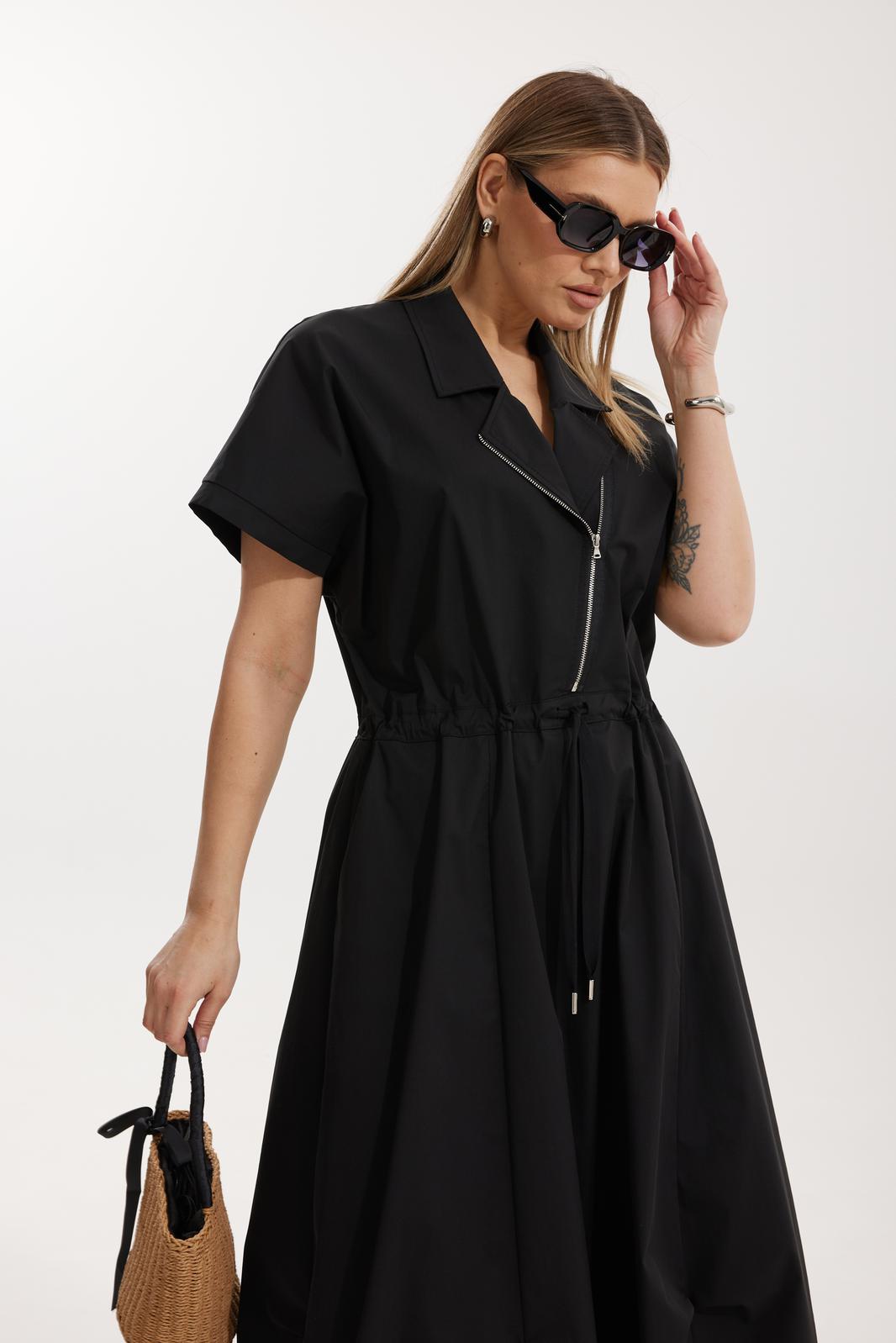 Платье женское полуприлегающего силуэта Отрезное по линии талии со спущенной линией плеча. По переду отрезного лифа платья располагается декоративная застежка-молния. Спинка лифа цельная, отрезная. Горловина обработана отрезным втачным воротником с лацканами пиджачного типа. Отрезная юбка состоит из 6 клиньев и наклонных карманов с отрезным бочком. Лиф и юбка соединены через отрезной пояс, в котором располагается кулиса с контрастным шнуром. По низу юбки застрочены защипы.