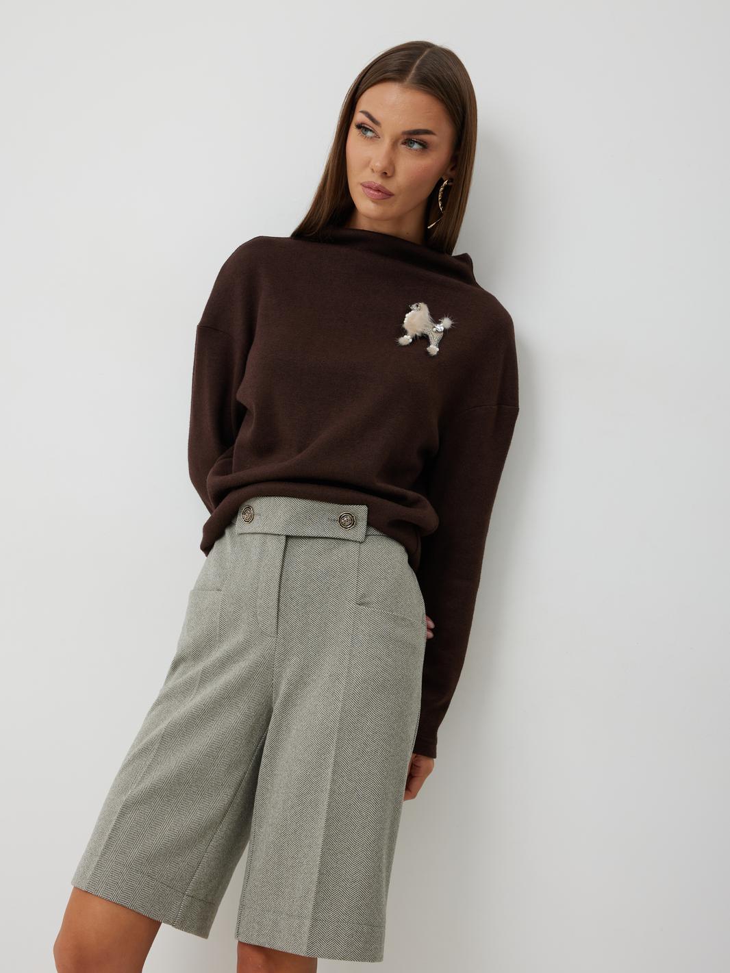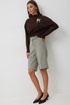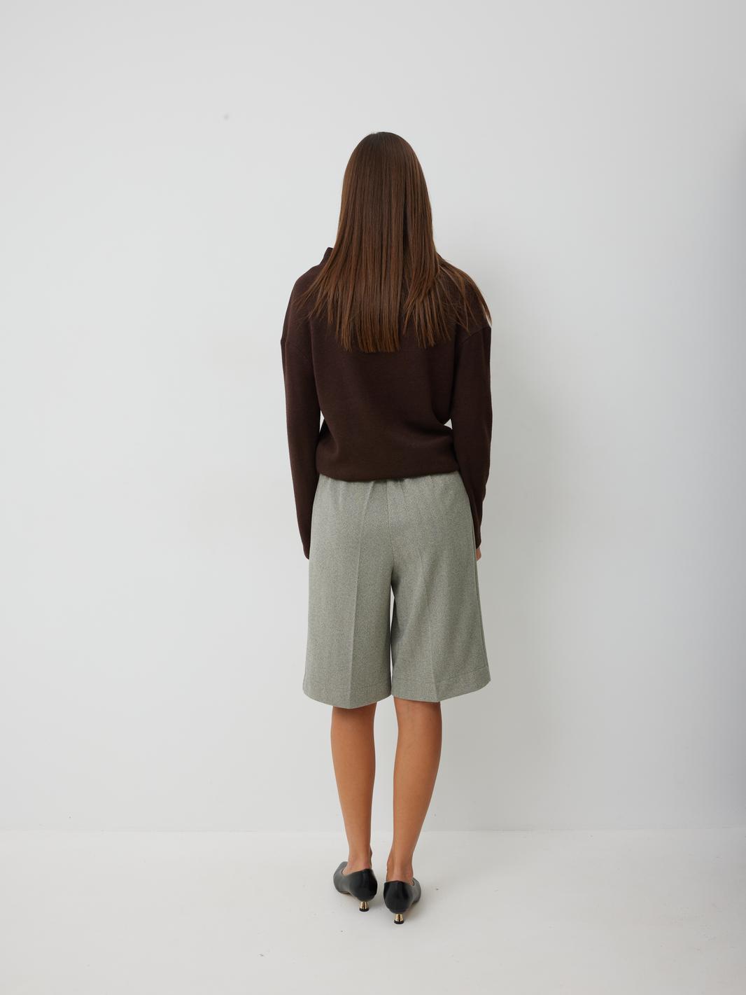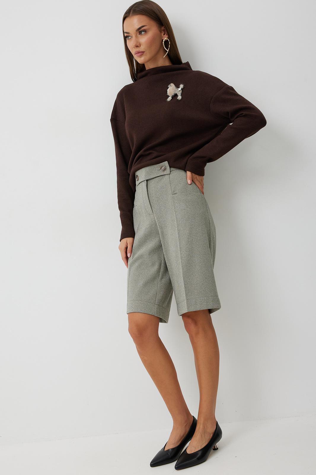 Бермуды женские прямые длиной до колена. На передних половинках обработаны карманы с отрезным фигурным бочком. На передних и задних половинках заутюжены стрелки. На задних половинках обработаны вытачки. Застёжка-молния распологается на передних половинках бермуд, обработана в гульфике. Верхний срез обработан отрезным поясом, по спинке брюк в пояс вставлена резинка. Пояс застегивается с помощью отрезной детали на декоративные пуговицы.