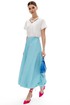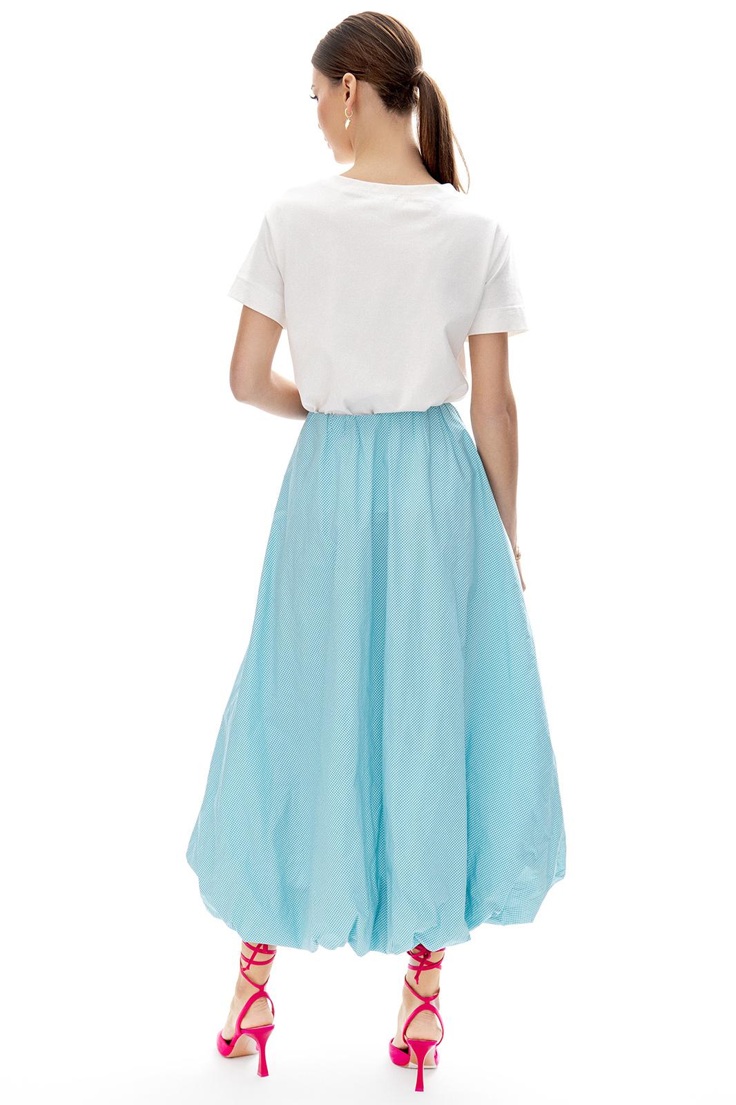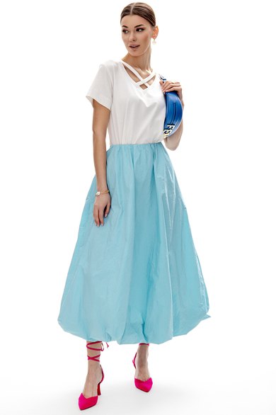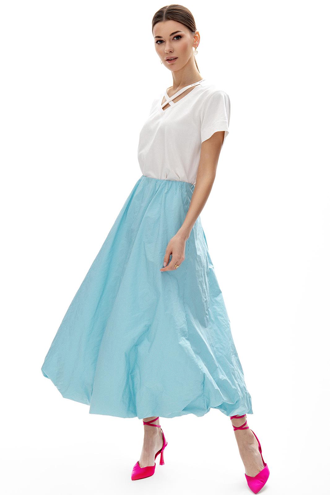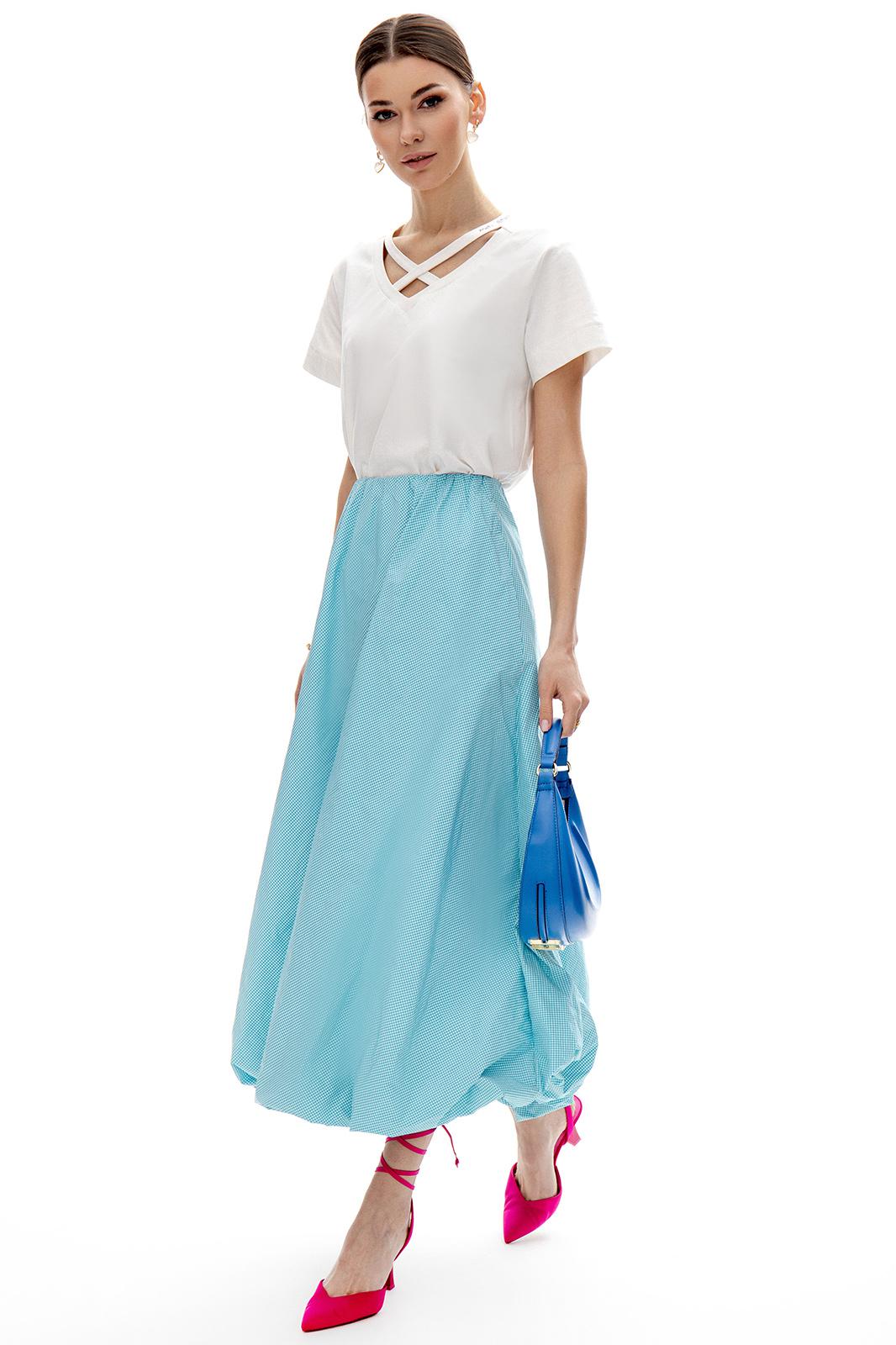 Юбка женская длинная, овального силуэта, на подкладке. Передняя и задняя части цельнокроеные. Низ юбки собран на подкладку, верх на резинке. В боковых швах обработаны карманы. Длина изделия 90 см.
