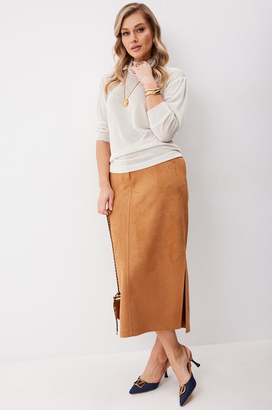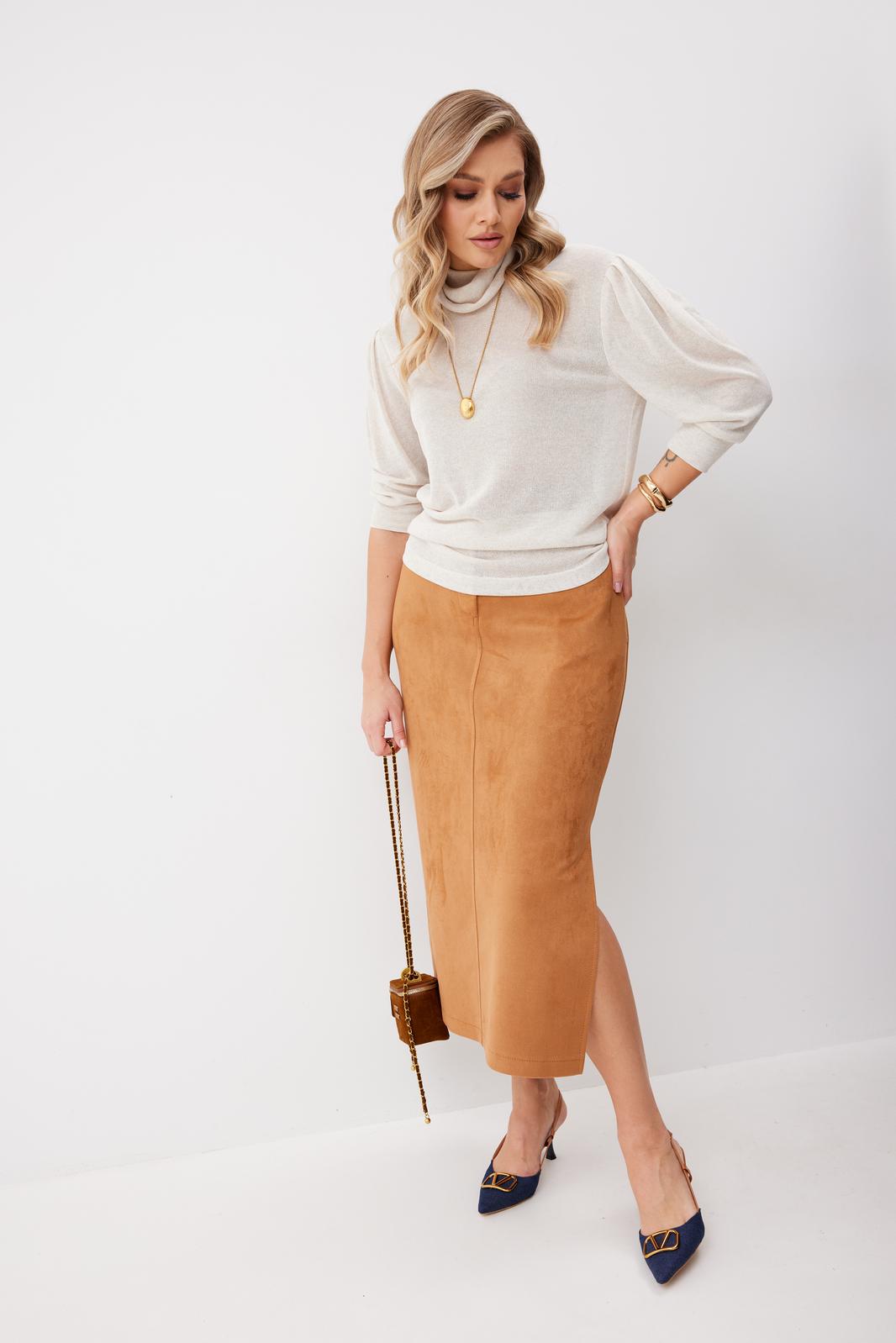 Юбка женская прямого силуэта. Перед со средним швом, в котором обработана застежка на молнию. Задняя половинка юбки со средним швом и кокеткой. В боковых швах обработаны карманы, в левом по низу разрез. Верх обработан притачным поясом (частично на резинке), застегивающимся на кнопку. Декоративные элементы и фурнитура могут отличаться от заявленных на фото. Цвет материала может отличаться по тону в зависимости от настроек вашего монитора!