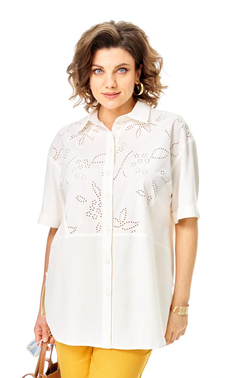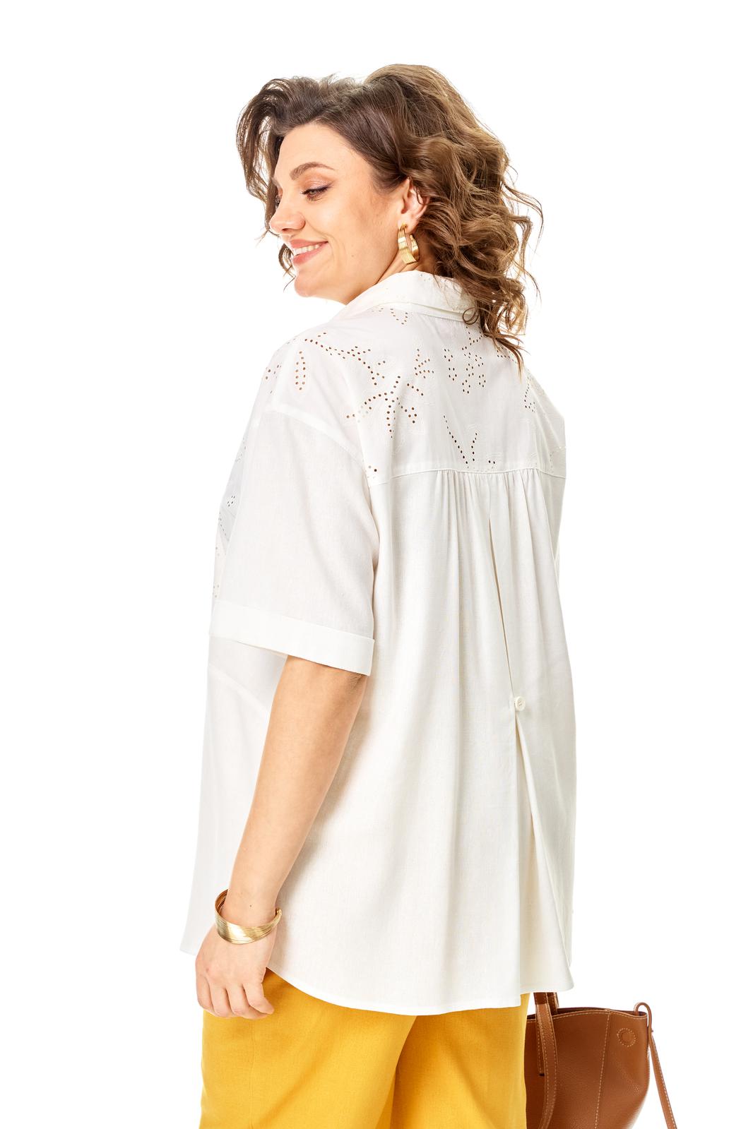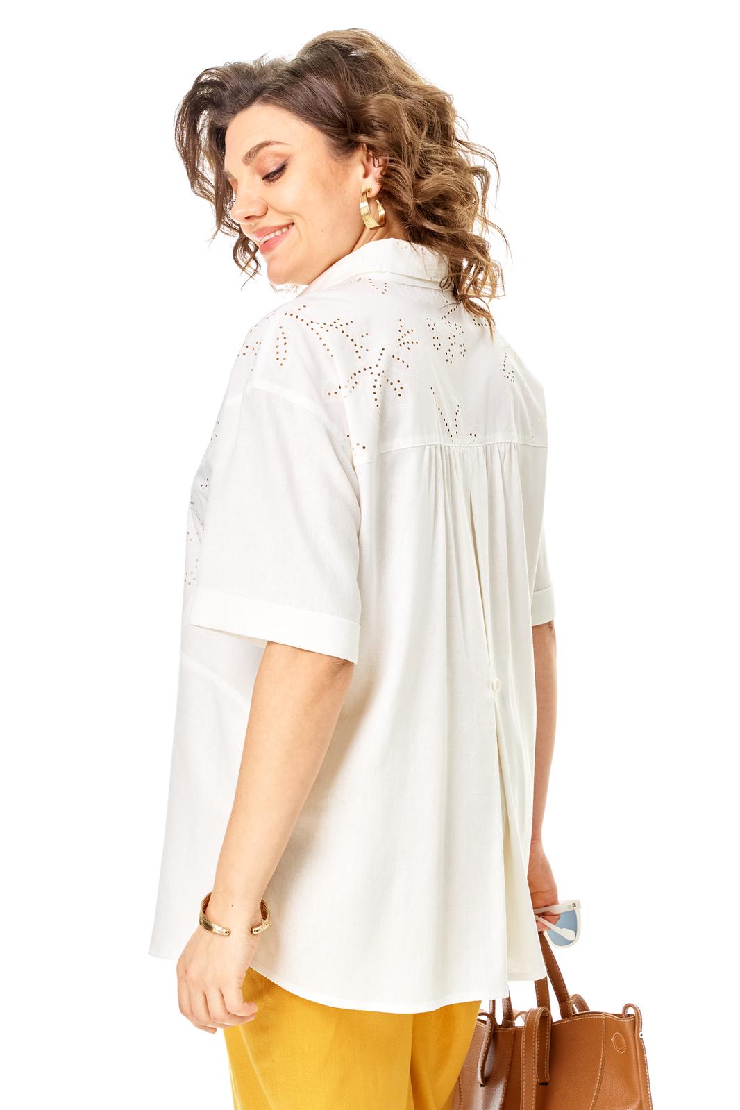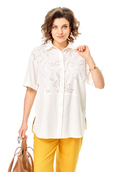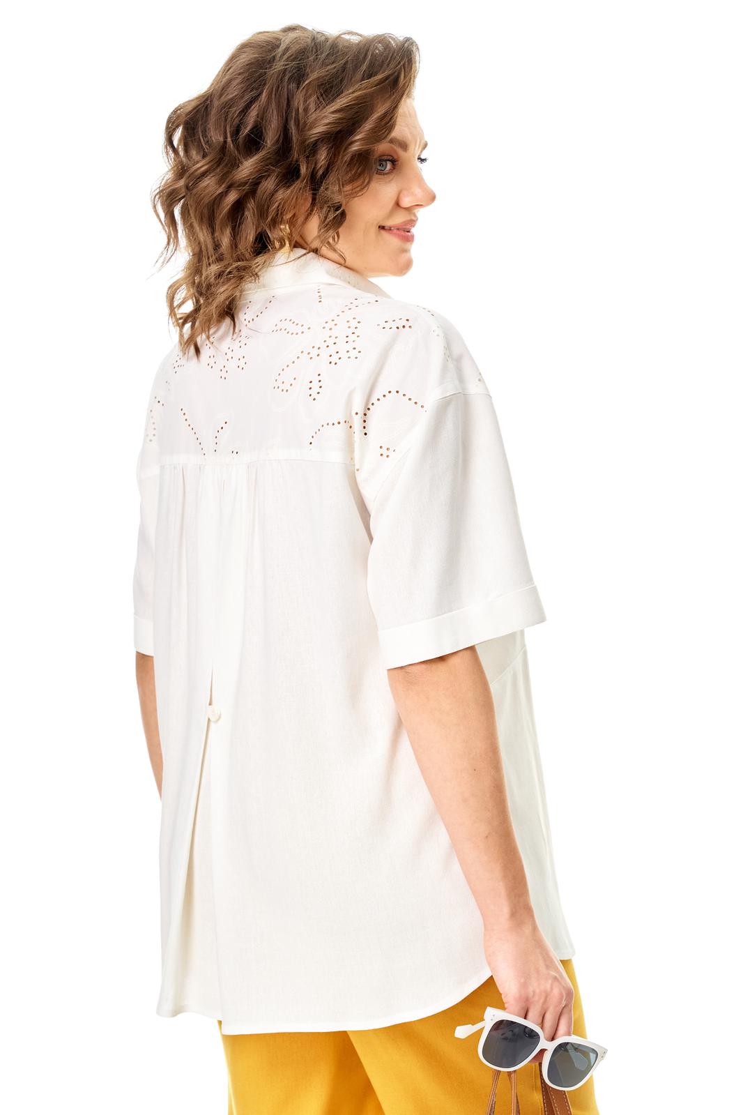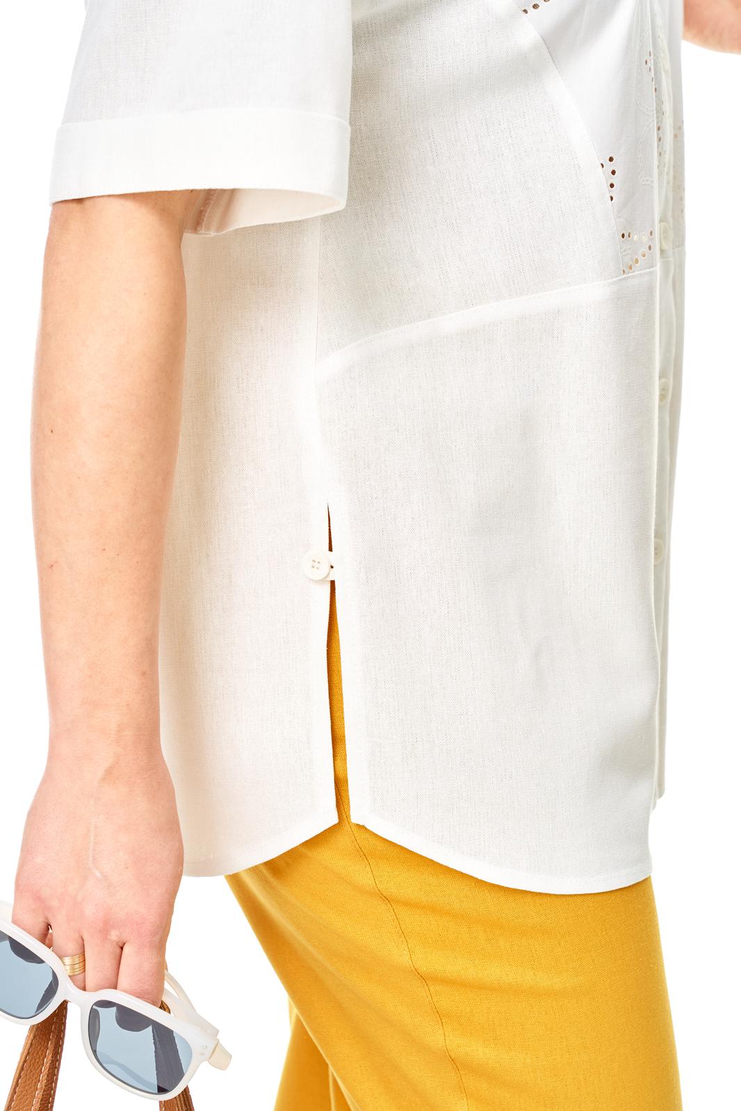 Рубашка свободного силуэта, линия плеча спущена. Воротник рубашечный. Застёжка классическая центральная на петли и пуговицы. В боковых швах разрезы с декоративной петелькой и пуговицой. Спинка с отрезной кокеткой из хлопка с перфорацией. Нижняя часть спинки с небольшой сборкой и встречной складкой, декоративная петелька с пуговицой.