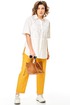 Брюки выполнены из льняного полотна. Очень мягкого и приятного, не колется. Силуэт брюк: прямые слегка зауженные к низу. Пояс притачной, частично на резинке. Застёжка классическая на пуговицу и молнию( гульфик). На передних половинах брюк карманы в области боковых швов. На задних половинках брюк отрезная кокетка