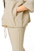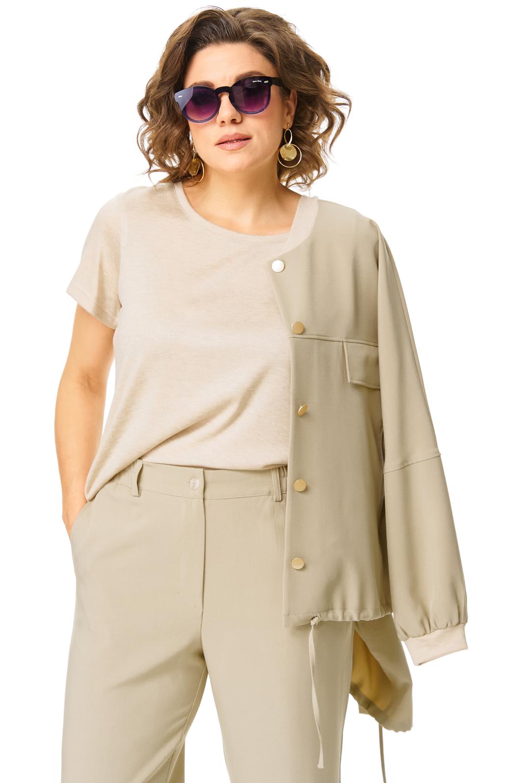 Бомбер свободного силуэта, линия плеча спущена. Застёжка центральная на петли и пуговицы. Горловина и низ рукава обработана трикотажной вставкой. По переду 2 кармана. По низу изделия кулиска. Спинка с горизонтальным подрезом в верхней части , отделка в виде металлической нашивки.