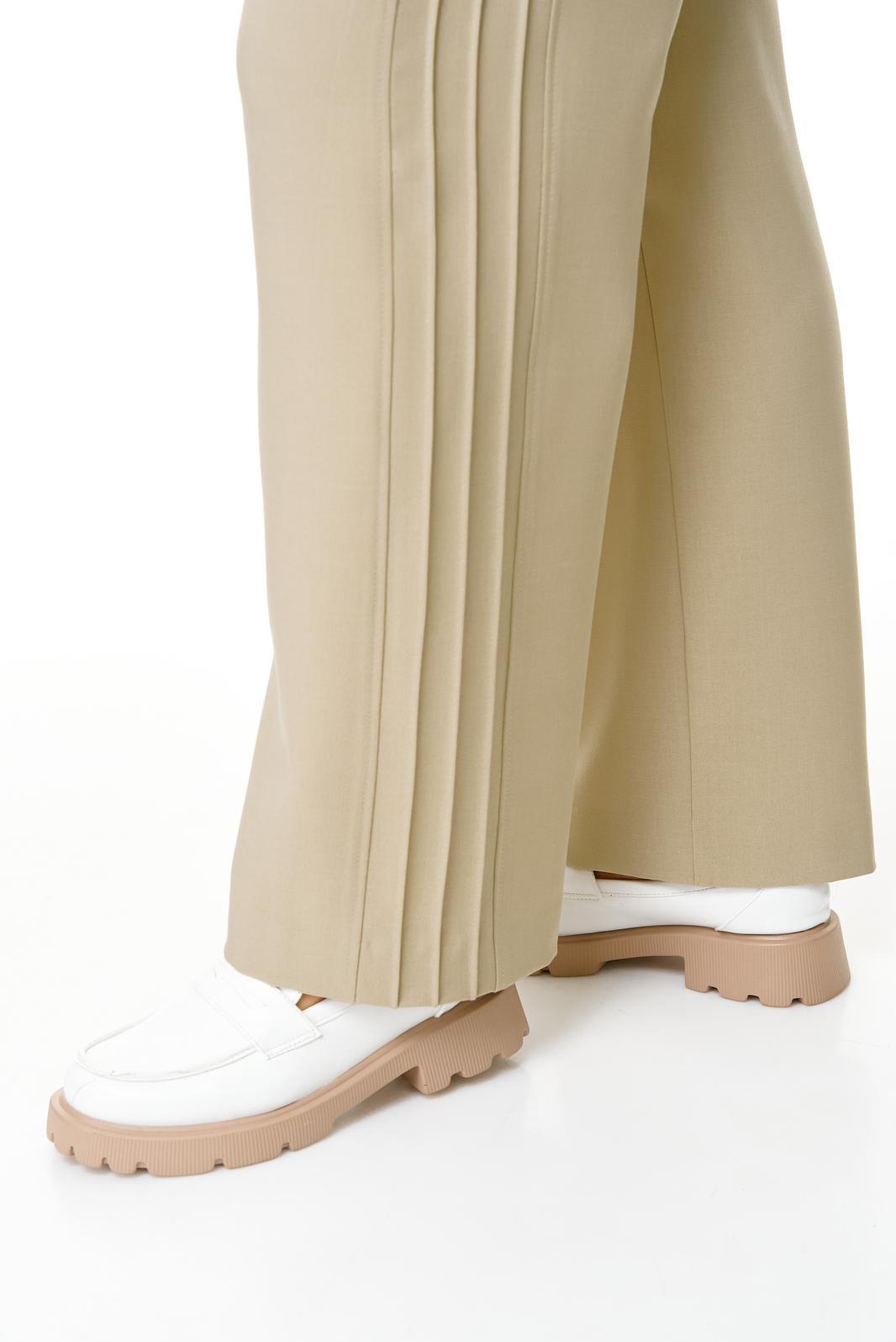 Брюки прямые. Пояс частично на резинке, застёжка классическая гульфик. В боковых швах карманы. По боковому шву отделка в виде застроченных защипов.