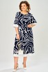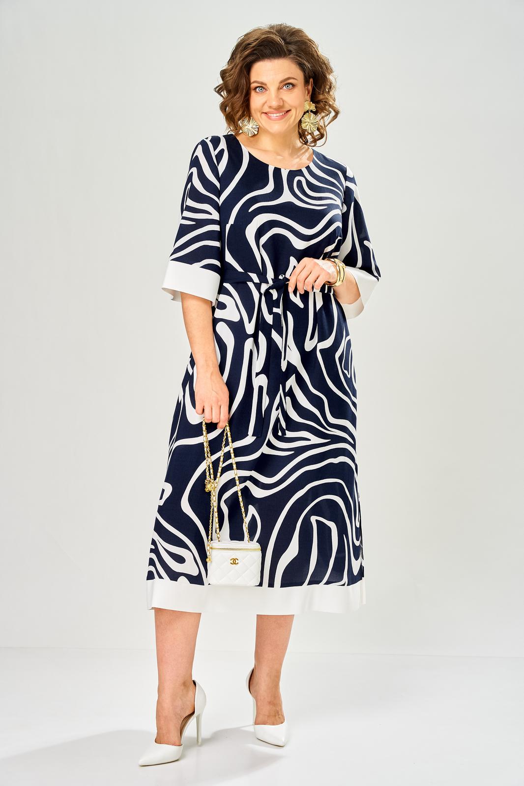 Платье из лёгкой вискозы. На тонкой подкладке. Силуэт прямой, к низу слегка расширен. Нагрудные вытачки. Горловина овальная. Рукав втачной, чуть расширен к низу. По низу рукава и платья отделка по низу однотонной светлой тканью. Платье без застёжки. Мягкий съёмный пояс из основного полотна.