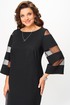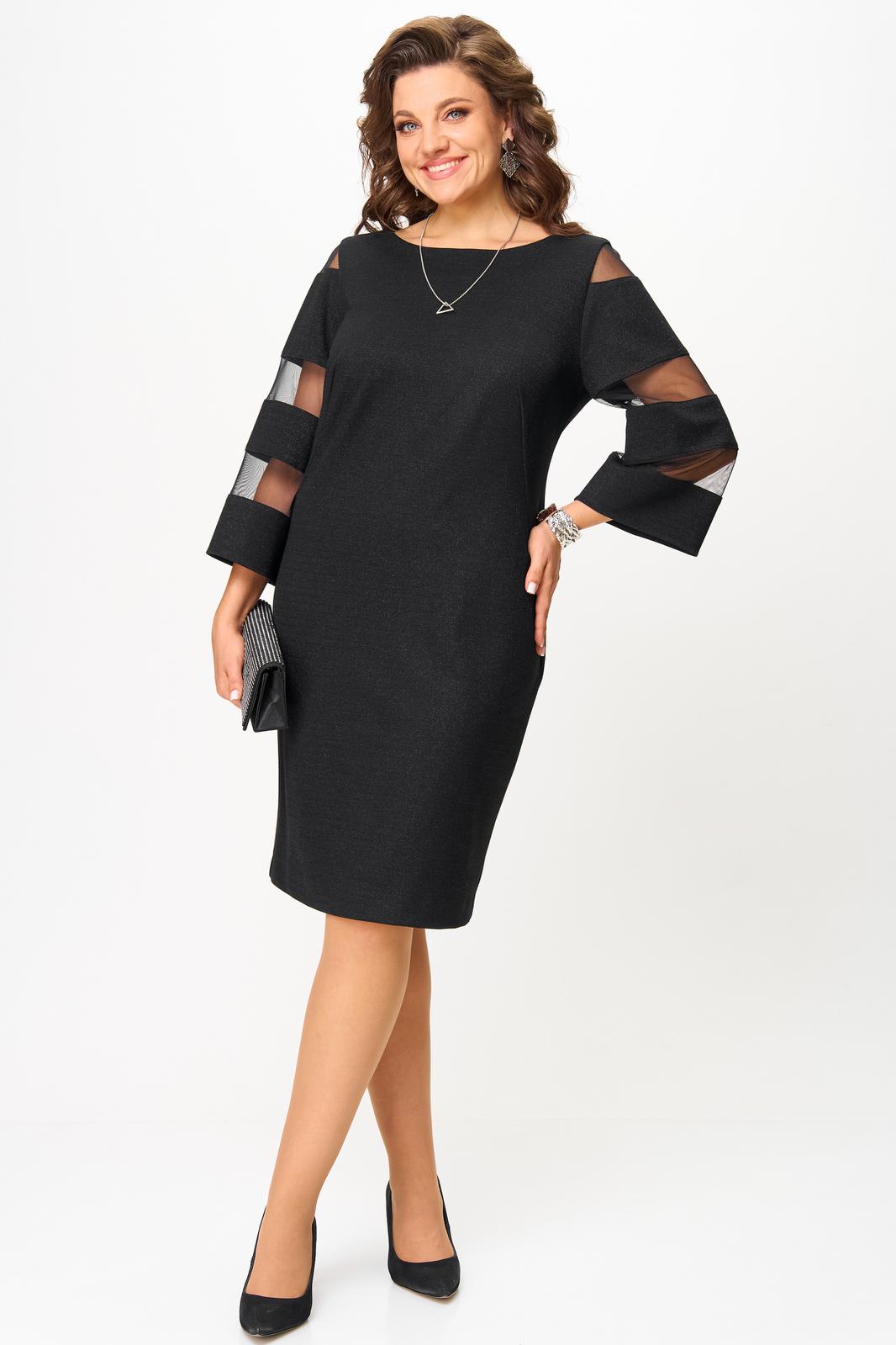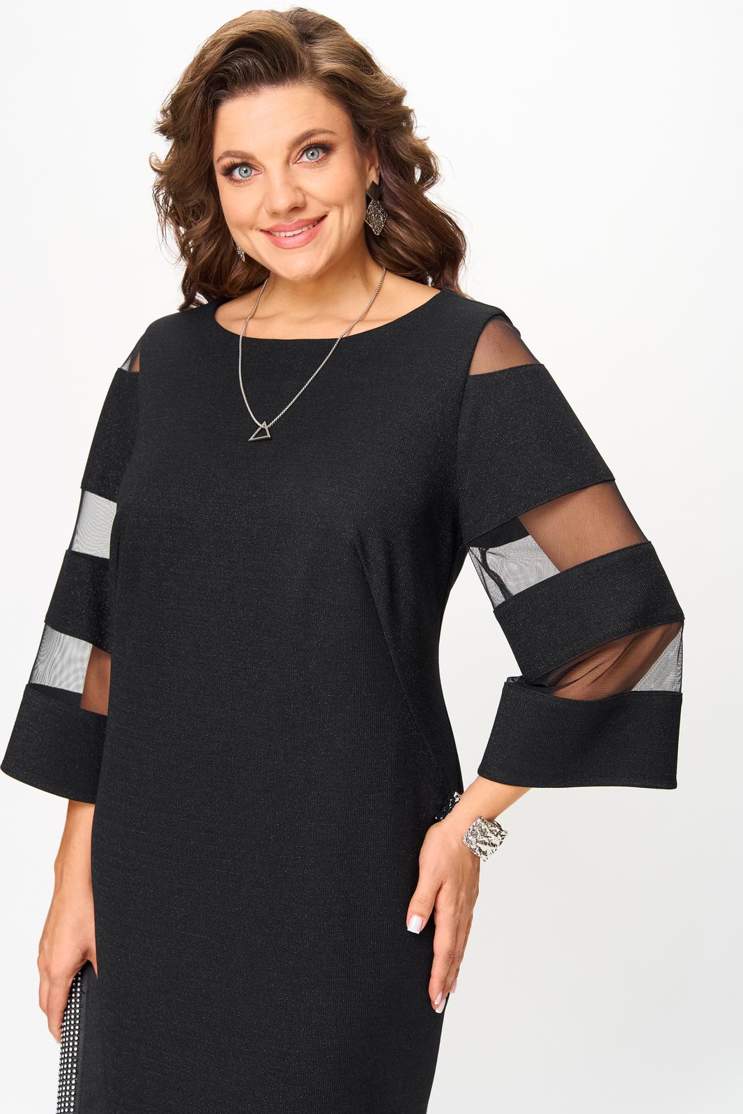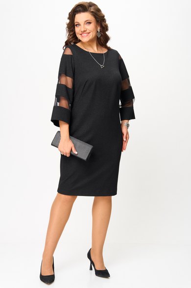 Силуэт прямой. Рукав втачной, слегка расширенный к низу. По рукаву вставлена сетка. Спинка со средним швом, шлица для хода. Платье без застёжки, без подкладки.