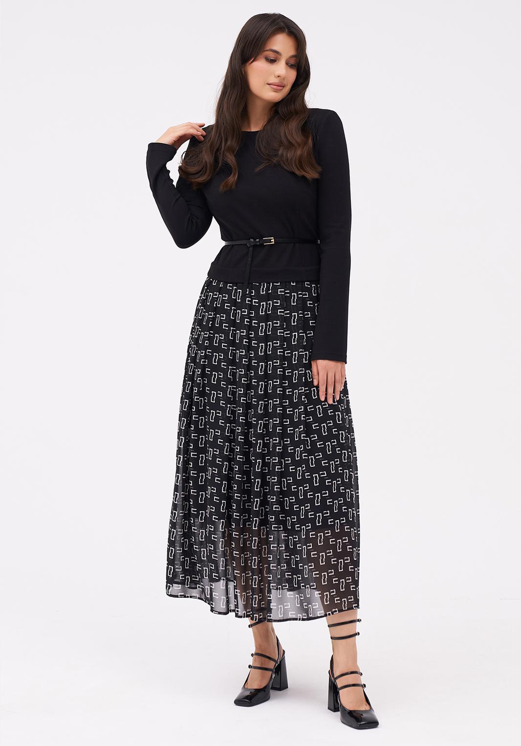 Платье с прилегающим лифом из трикотажного полотна и шифоновой юбкой со складками. По плечам плечевые накладки. Рукав полноценной длины. Юбка из шифона в контрастный принт на подкладке. Застёжка на потайную молнию в боковом шве. Комплектуется тонким ремнём.