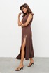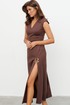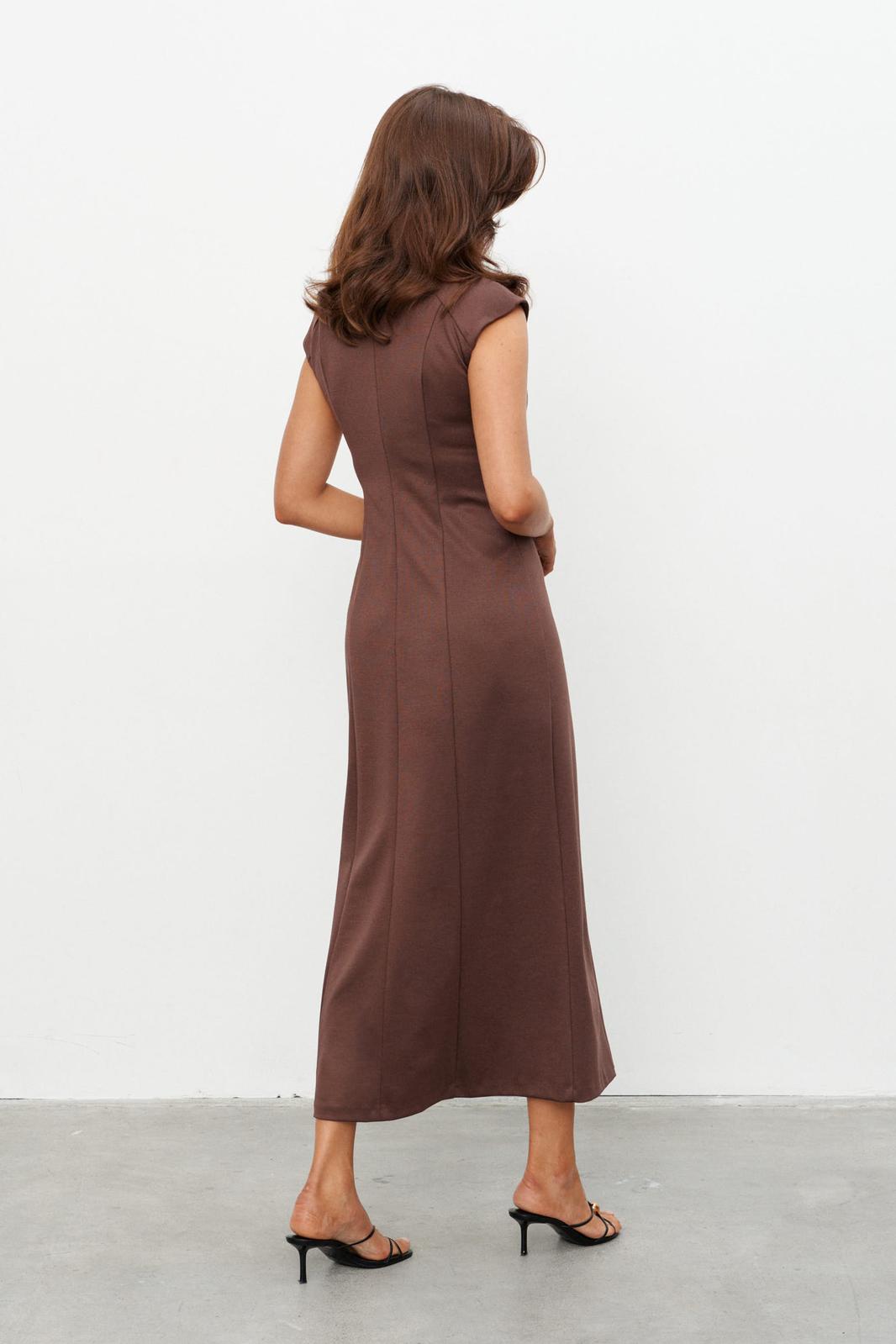 Платье из трикотажного полотна приталенного силуэта с расклешённой юбкой с высоким разрезом. Вырез горловины V-образный, По плечам - плечевые накладки. Верх разреза отделан люверсами и кольцами в качестве декора. Застёжка на потайную молнию сзади.