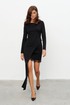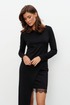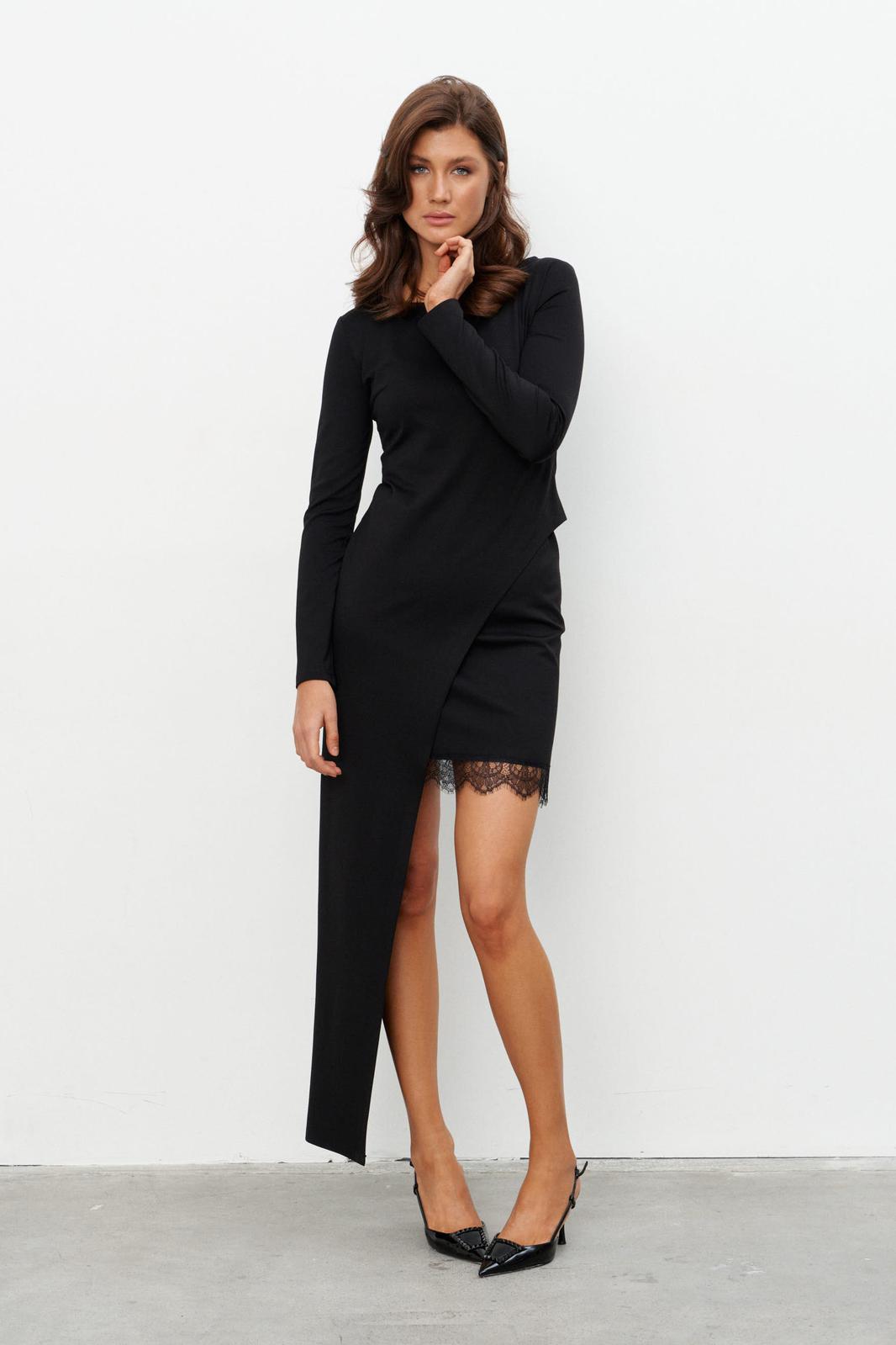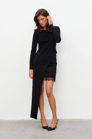 Комплект имитирующие платье из трикотажного полотна состоящий из джемпера с асимметричным низом и мини-юбки с кружевом. Джемпер прилегающего силуэта с длинным рукавом, вырез горловины - лодочка. Юбка на резинке по поясу. По низу настрочено тонкое кружево.