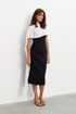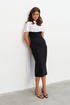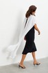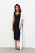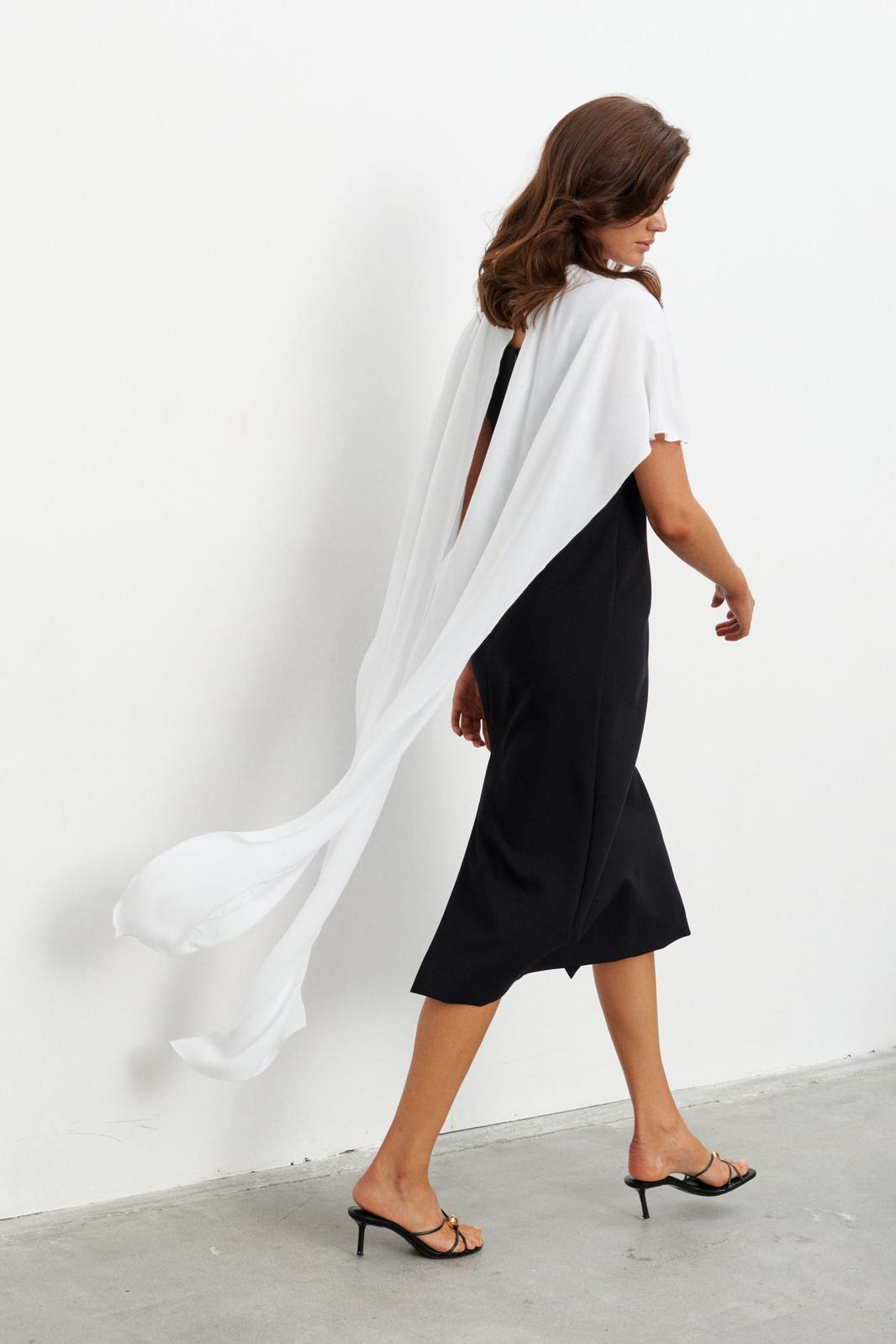 Комплект состоящий из плотного платья-футляра и струящейся, контрастной накидки. Платье прилегающего силуэта длиной миди. Вырез горловины - каре. Сзади шлица и застёжка на потайную молнию.