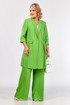 Брючный женский 3-х предметный комплект из облегченной крэшованой ткани с добавлением вискозы. Жакет свободного облегания, удлиненный, однобортный, воротник шалька, рукав 3/4 с отварачивающимся манжетом. По переду и спинке подрез на уровне талии, ниже подреза по переду две встречных складки и клапаны, по центру спинки ниже подреза встречная складка и хлястик с декоративными пуговицами. Брюки длинные, прямые, с карманами в боковых швах, гульфиком с застежкой на молнию и отрезным поясом с резинкой. Топ свободного облегания, без рукава, вырез горловины мягкое каре.