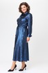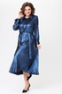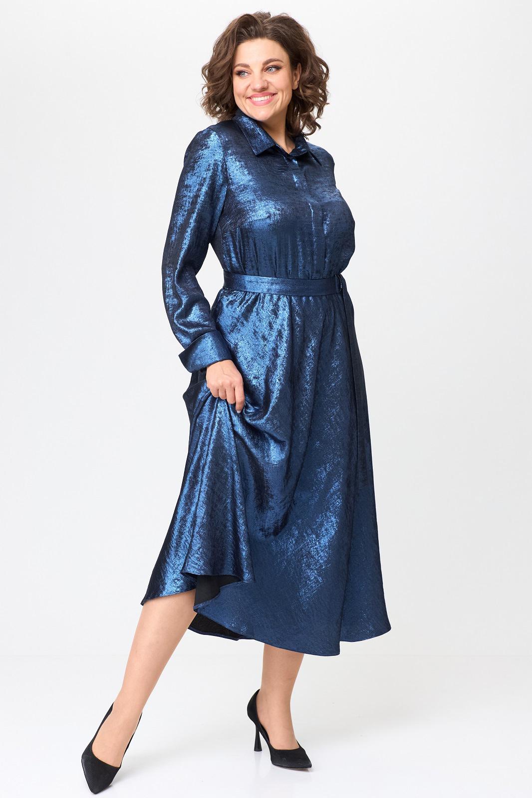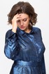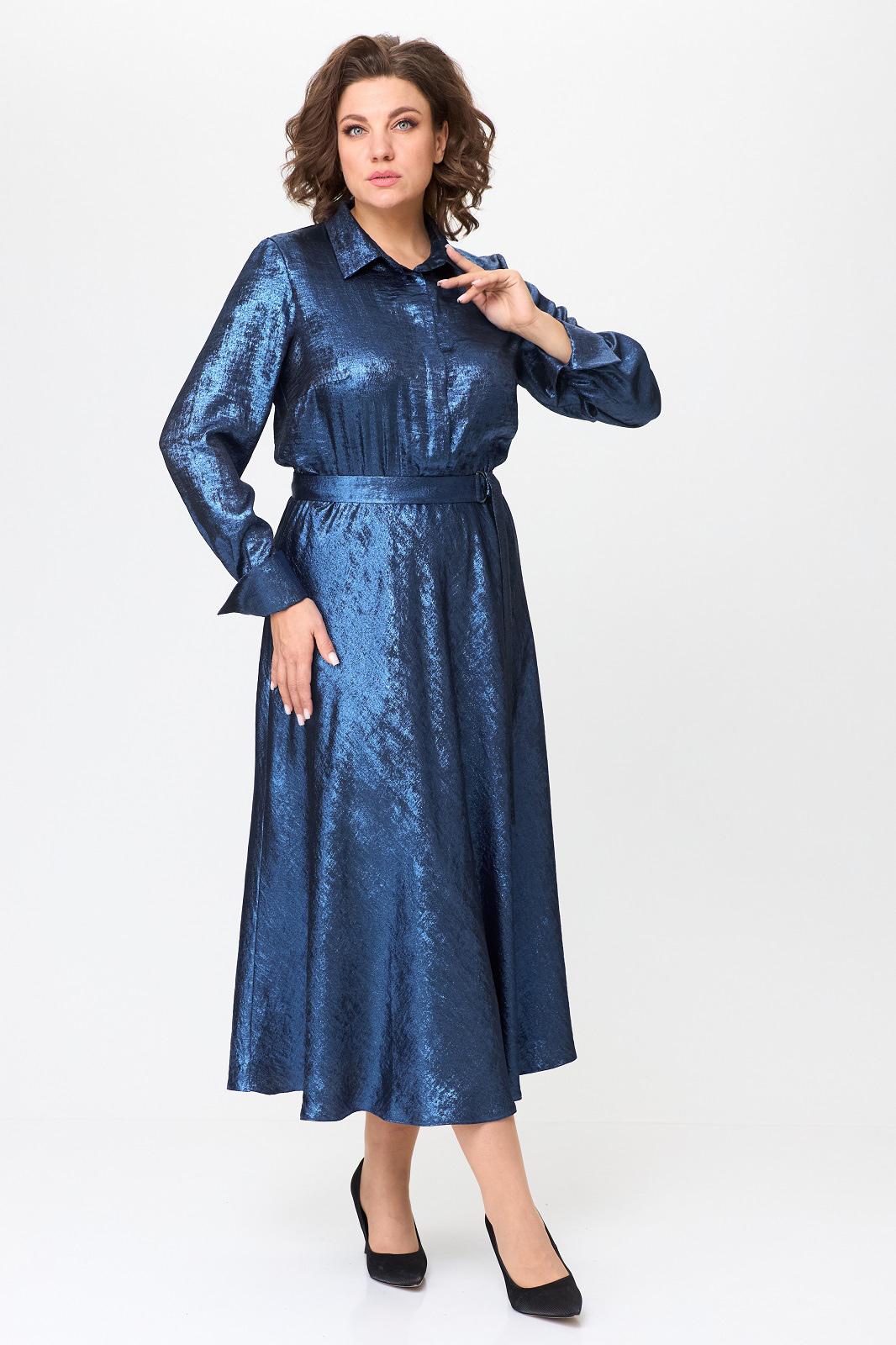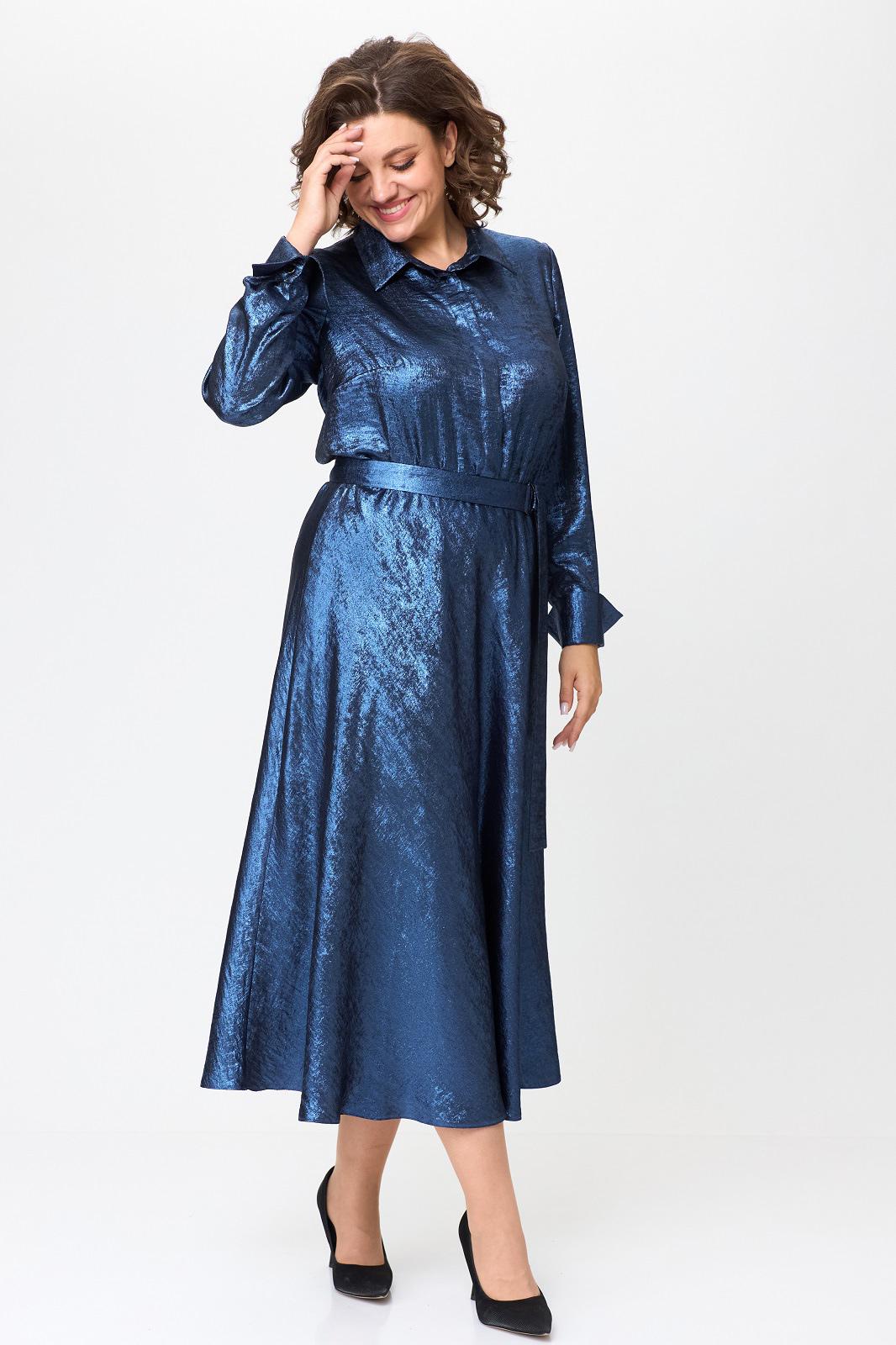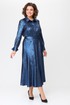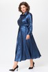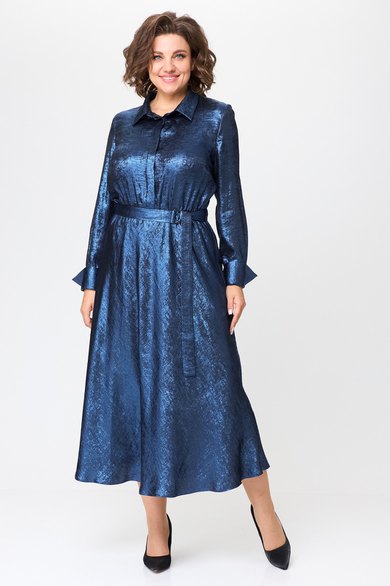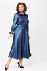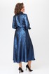 Нарядное женское платье из ткани с добавлением вискозы и шелка с блестящим эффектом. Отрезное по талии с небольшой сборкой на резинке и удлиненной юбкой на подкладке. Лиф свободного облегания с центральной потайной застежкой на пуговицы, воротник рубашечного типа, рукав длинный с отворачивающимся манжетом, пояс съемный на полукольцах.
