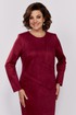 Нарядное женское платье из трикотажного полотна с эффектом замши. Силуэт полуприлегающий, длина чуть ниже колена, вырез горловины круглый с застежкой на петлю с пуговицей по спинке. По переду подрезы с имитацией отлетных деталей и декоративная брошь. По спинке в среднем шве разрез.