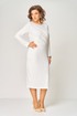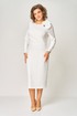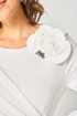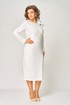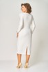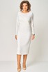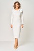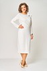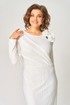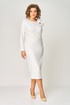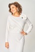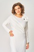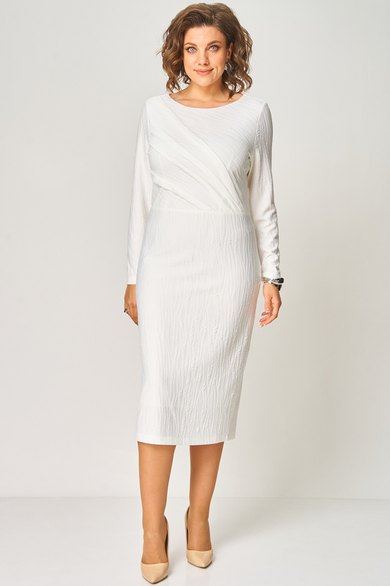 Нарядное женское платье из трикотажного полотна с добавлением вискозы, с оригинальной выпуклой фактурой с рисунком в тон. Силуэт полуприлегающий, по переду отрезное по линии талии, по лифу наклонные бантовые складки, вырез горловины круглый, рукав длинный, по спинке в среднем шве разрез. Съемный цветок украшен декоративными пуговицами-стразами.