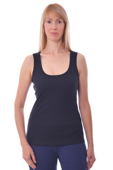 Майка женская полуприлегающего силуэта на бретелях. Верхние срезы заработаны бейкой. Низ изделия обработан швом вподгибку.