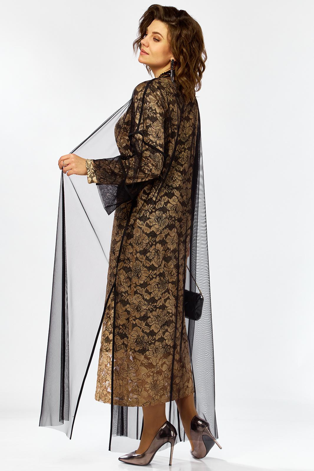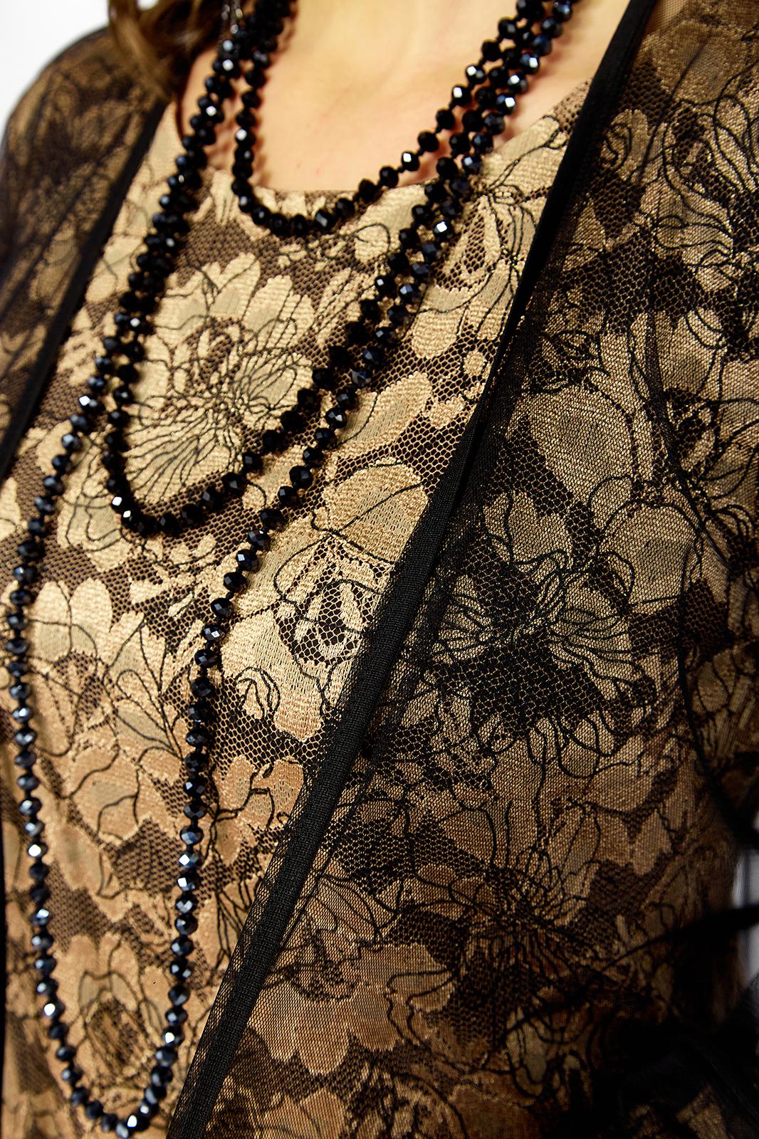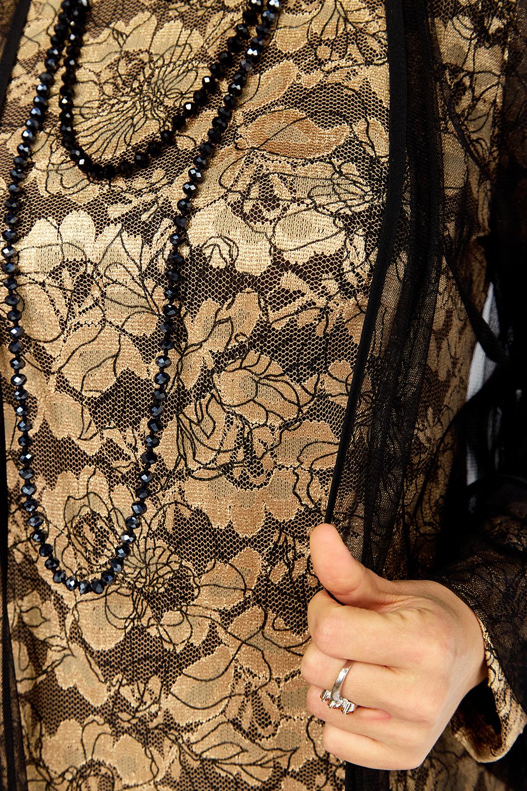 Элегантный и утонченный комплект созданный для особых случаев в основе платье полуприлегающего силуэта на трикотажной подкладке из кружевного гипюра с контрастным рисунком в цветочной тематике ,Сверху легкая накидка шазюбль из прозрачной сетки , она мягко драпируется , создавая воздушный легкий силуэт длинные рукава и свободный крой добавляют образу благородства и загадочности .