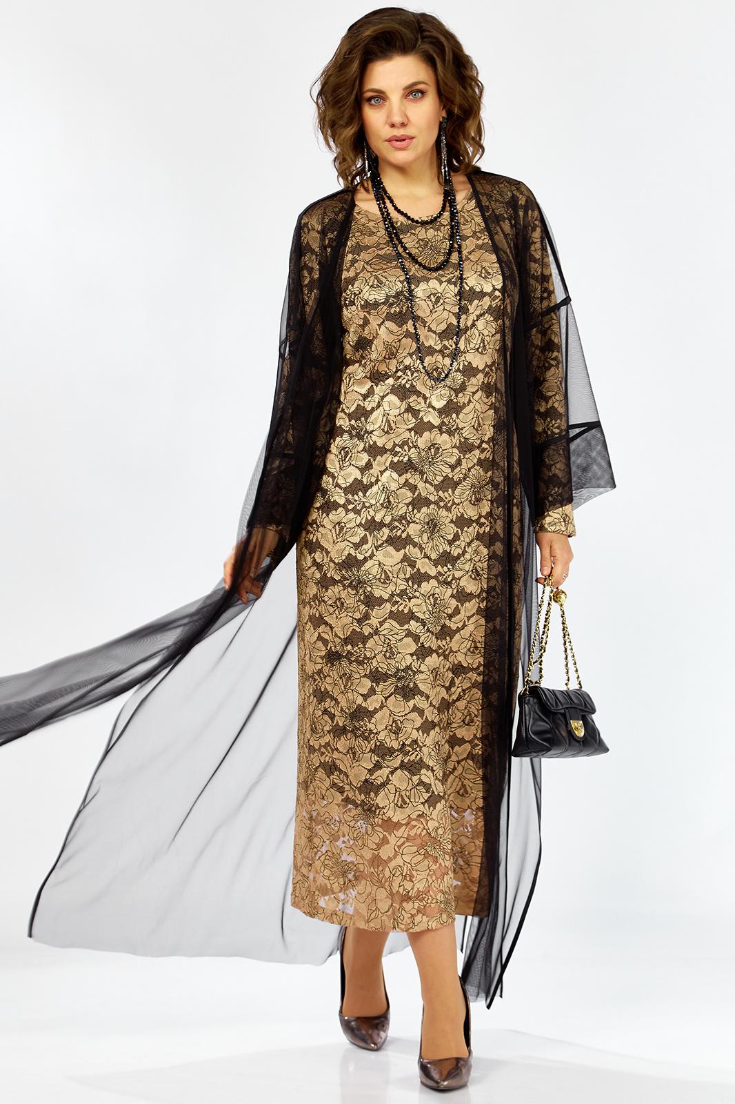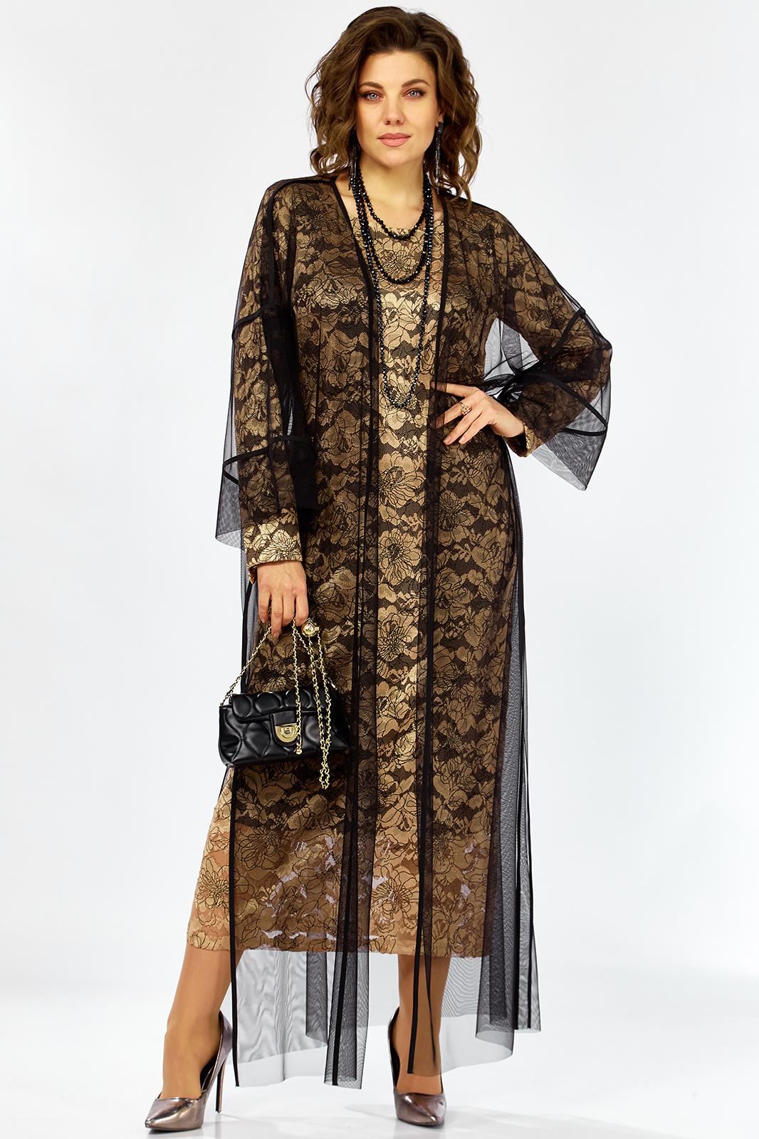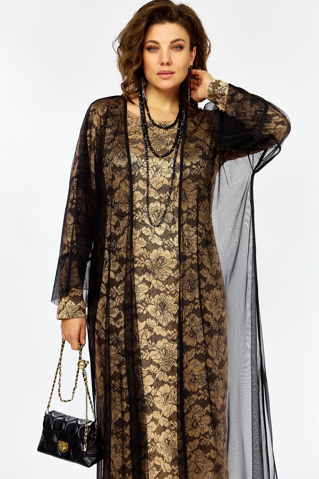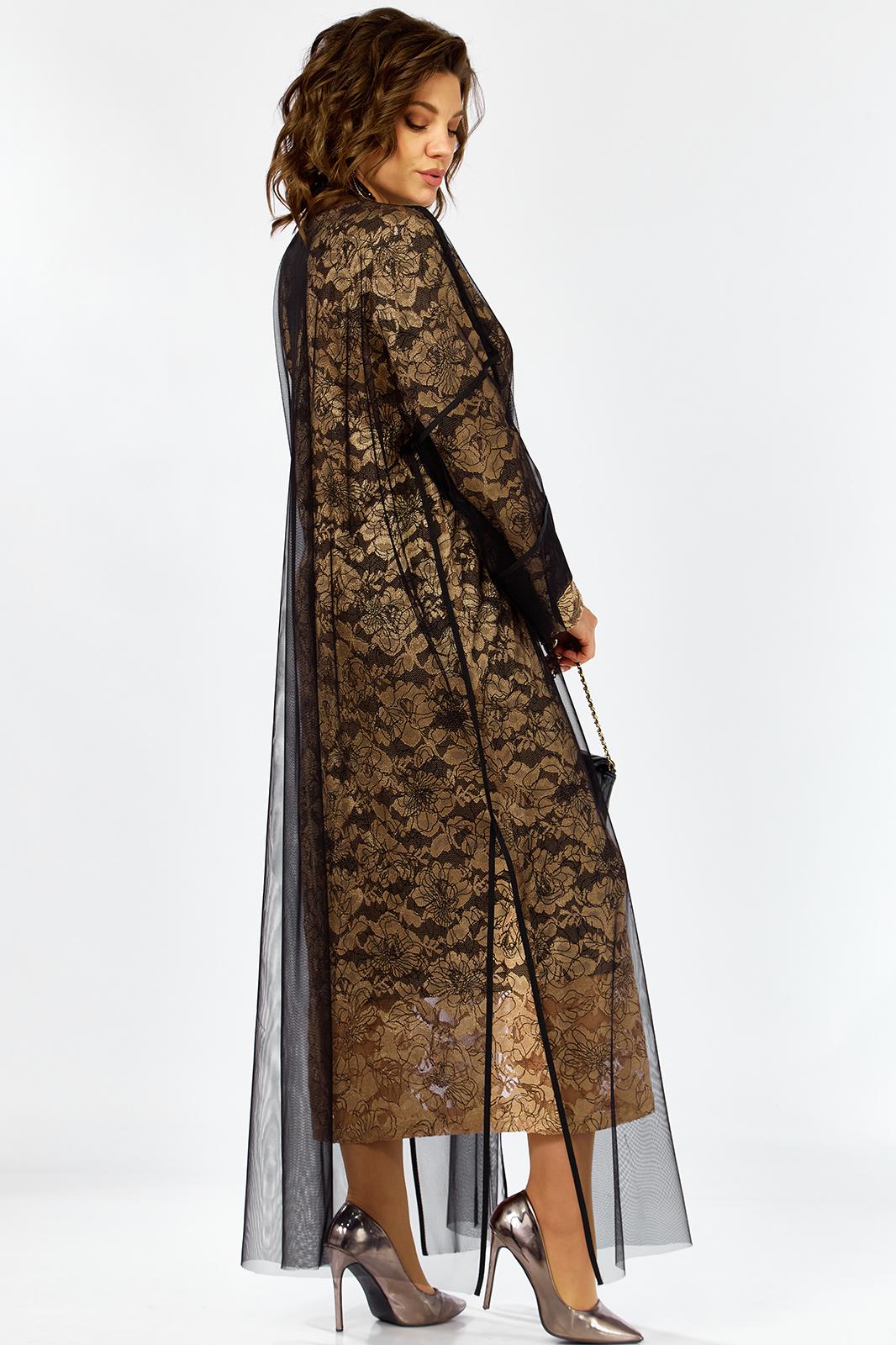 Элегантный и утонченный комплект созданный для особых случаев в основе платье полуприлегающего силуэта на трикотажной подкладке из кружевного гипюра с контрастным рисунком в цветочной тематике ,Сверху легкая накидка шазюбль из прозрачной сетки , она мягко драпируется , создавая воздушный легкий силуэт длинные рукава и свободный крой добавляют образу благородства и загадочности .