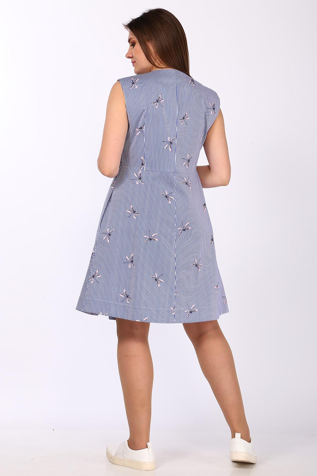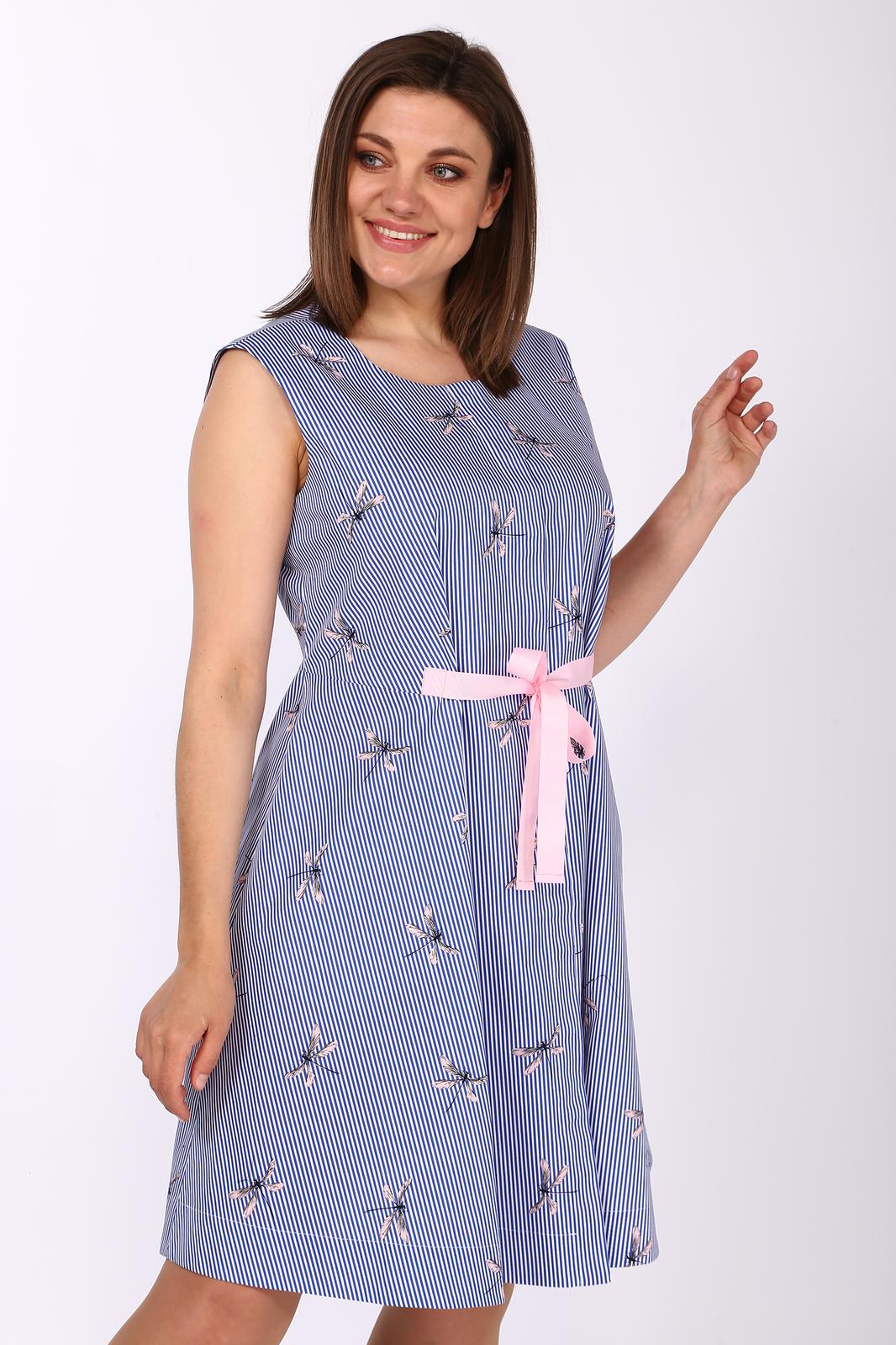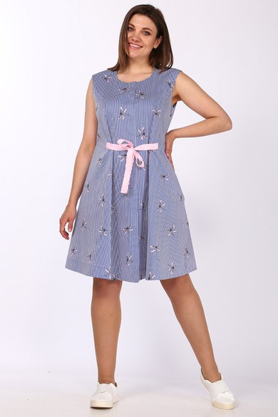 Платье А-образного силуэта,с круглым вырезом горловины, без рукавов. Перед с центральной бортовой застежкой на петли и пуговицы с потайной планкой. На линии талии вытачки и отделочная лента-завязка. Спинка со средним швом и талиевыми вытачками. Спинка отрезная по линии талии. В боковых швах платья обработаны карманы.Размеры 42-46: Длина изделия 90 см. Размеры 48-52: Длина изделия 95 см.