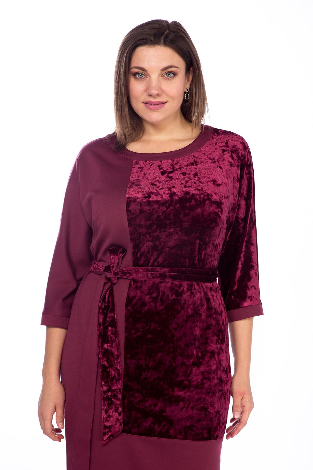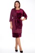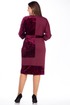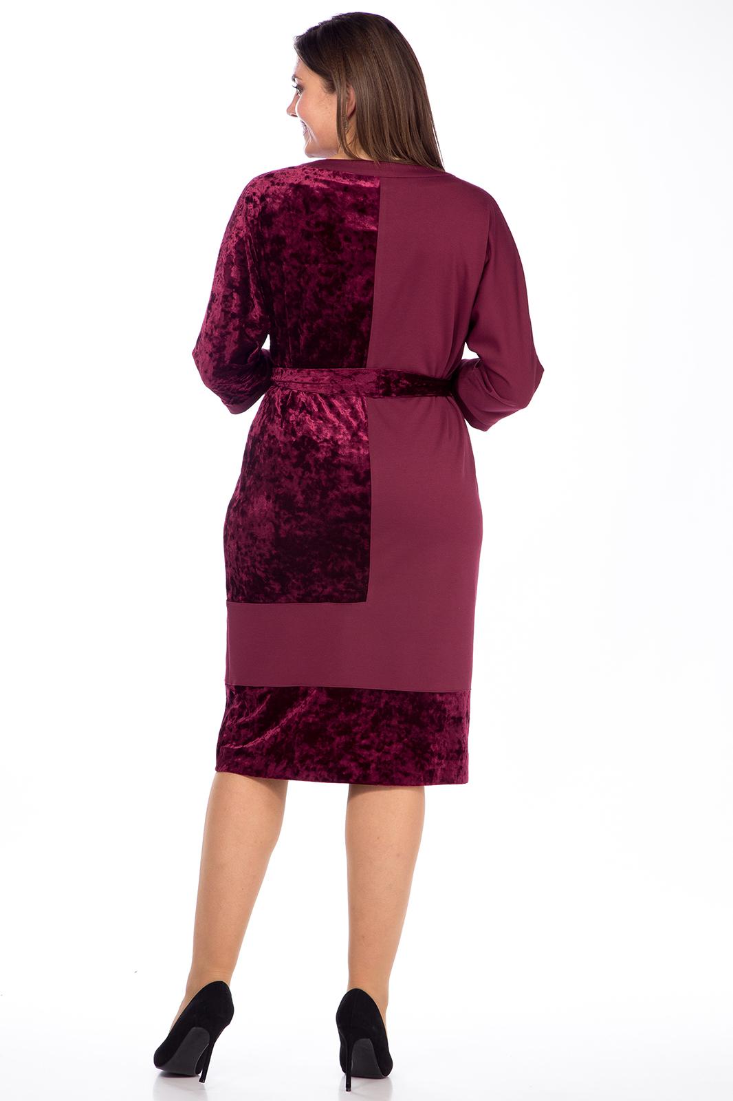Платье женское, прямого силуэта, с круглым вырезом горловины, обработанным отрезной деталью. С цельнокроенными рукавами, длиной 3/4. Низ рукавов с притачной деталью. Перед и спинка со вставкой из велюра. Низ платья с отделочной деталью. Платье комплектуется съемным двухсторонним поясом. Размеры 42-46: длина платья 100 см, длина рукава 47 см. Размеры 48-52: длина платья 103 см, длина рукава 48 см.