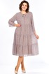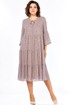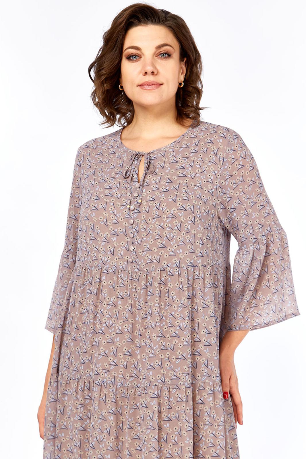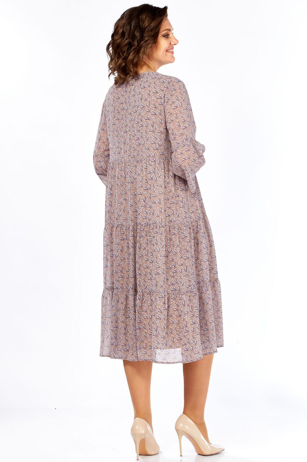 Платье А-силуэта, с круглым вырезом горловины,с завязками. Перед с нагрудными вытачками, пуговицами по среднему шву. Юбка платья состоит из 3-х воланов со сборками. Рукава втачные, одношовные, с воланами со сборкой, длиной 3/4. Платье на трикотажной подкладке.