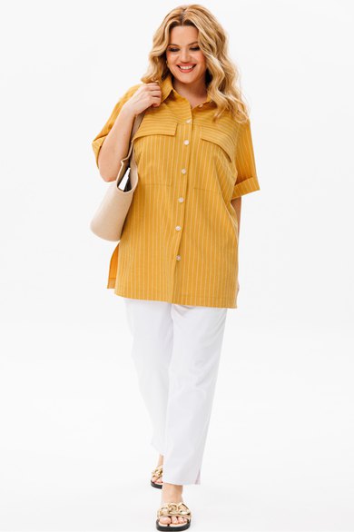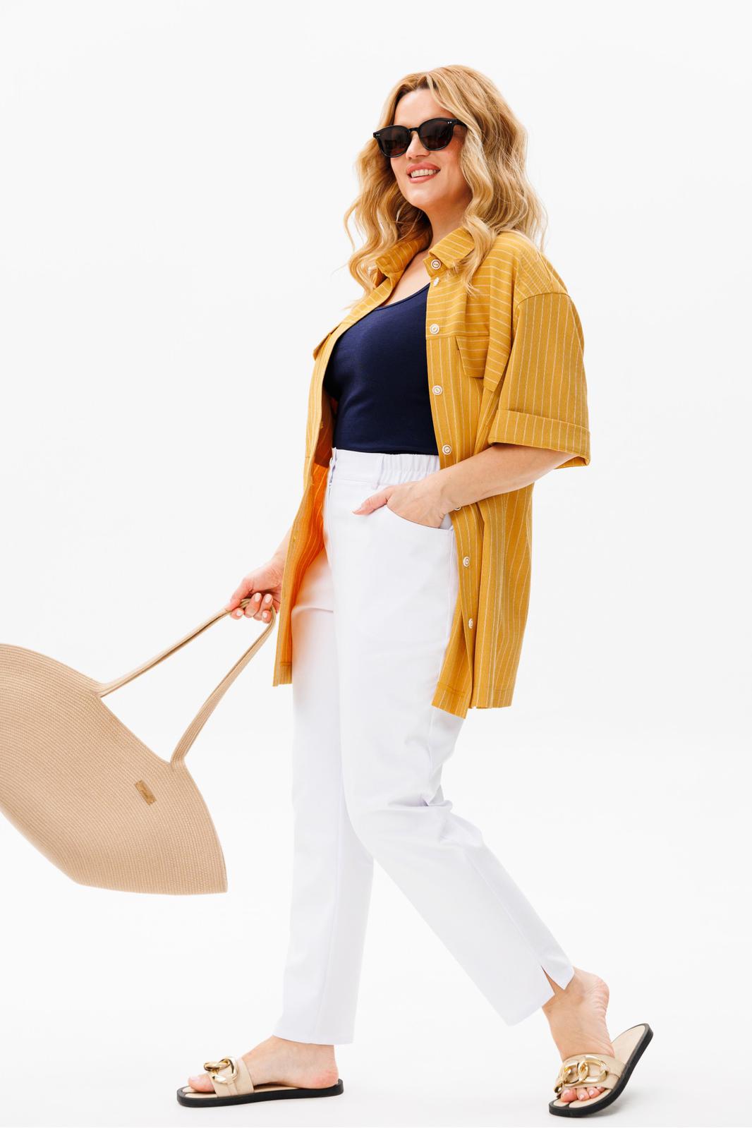Комплект женский (блузка и брюки). Блузка женская, свободного силуэта, длиной ниже линии бедер, со спущенной линией плеча, с втачными рукавами, с втачным воротником, с разрезами в боковых швах, с центральной сквозной застежкой на 7 петель и 7 пуговиц и 1 петлю и пуговицу на стойке воротника. Детали переда с цельнокроеными планками, с кокетками, нижняя часть с нагрудными вытачками, с клапанами, с накладными карманами. Спинка блузки с кокеткой, на нижней детали по шву притачивания обработана складка. Рукава втачные одношовные, короткие. Воротник сорочечный с отрезной стойкой. Брюки на бедрах, плотно облегающие вверху и зауженные к низу, с притачным поясом, в который частично вставлена эластичная тесьма. Застежка на тесьму- молнию и 1 петлю и пуговицу-«болт». На передних половинках в боковых швах обработаны карманы фигурной формы. На задних частях брюк расположены кокетки и накладные карманы на каждой половинке. В боковых швах по низу брюк обработаны разрезы. На поясе прикреплены 5 шлёвок. Блузка: длина спинки – 78см. Брюки: длина по боковому шву – 97см.