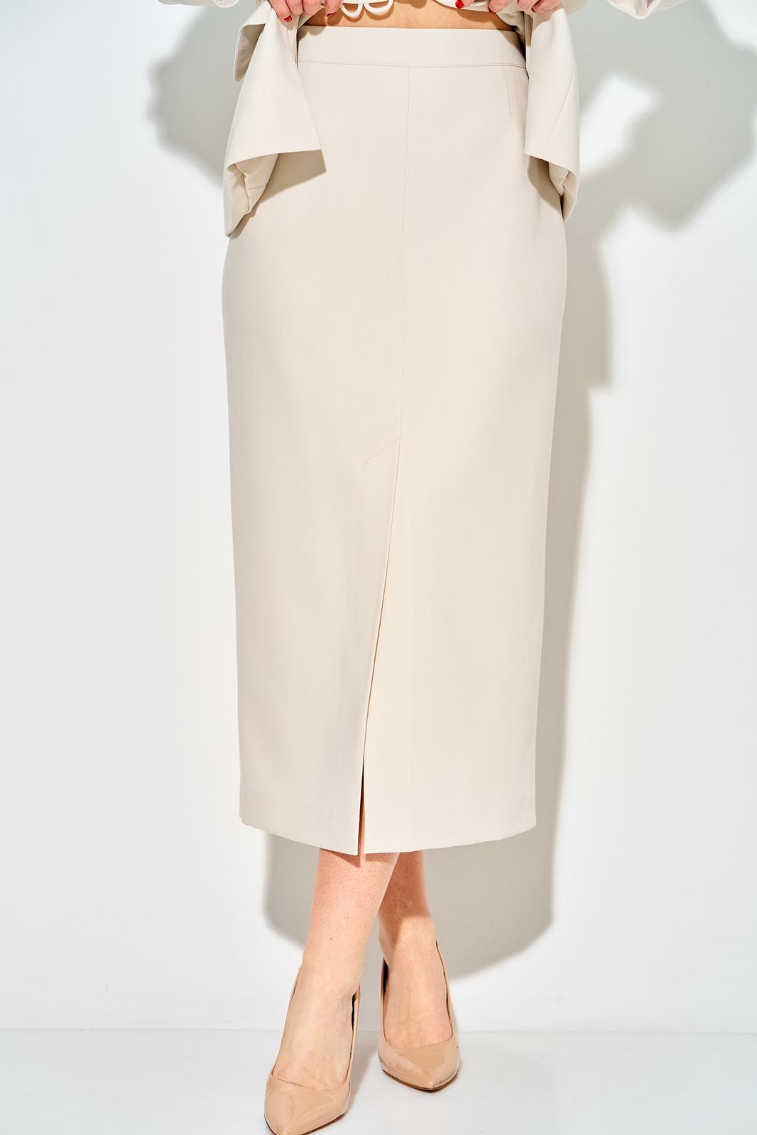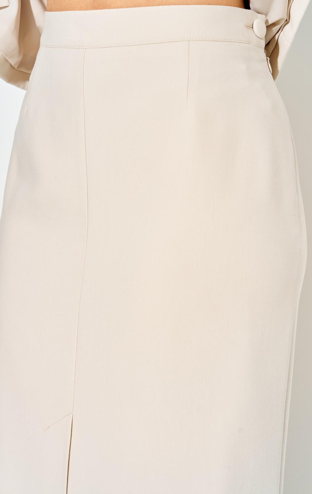 Юбка облегающая вверху и прямая к низу, с притачным поясом и потайной молнией в левом боковом шве. Переднее полотнище с вытачками и шлицей обеспечивает свободу движений, а заднее полотнище с четырьмя вытачками создаёт идеальный силуэт.