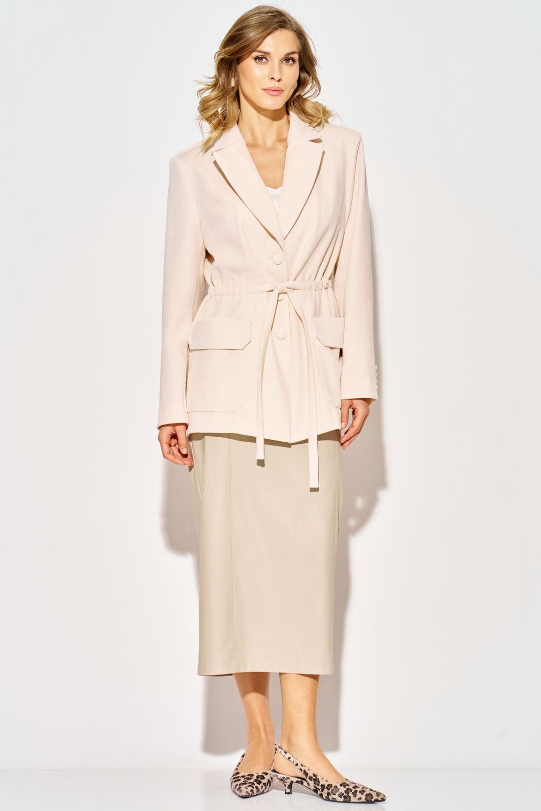 С центральной застёжкой на три пуговицы и оригинальной кулисой на уровне талии, жакет позволяет подчеркнуть вашу фигуру, добавляя изюминку в любой образ. Эластичная тесьма с поясом создаёт возможность регулировки, обеспечивая удобство и стиль.