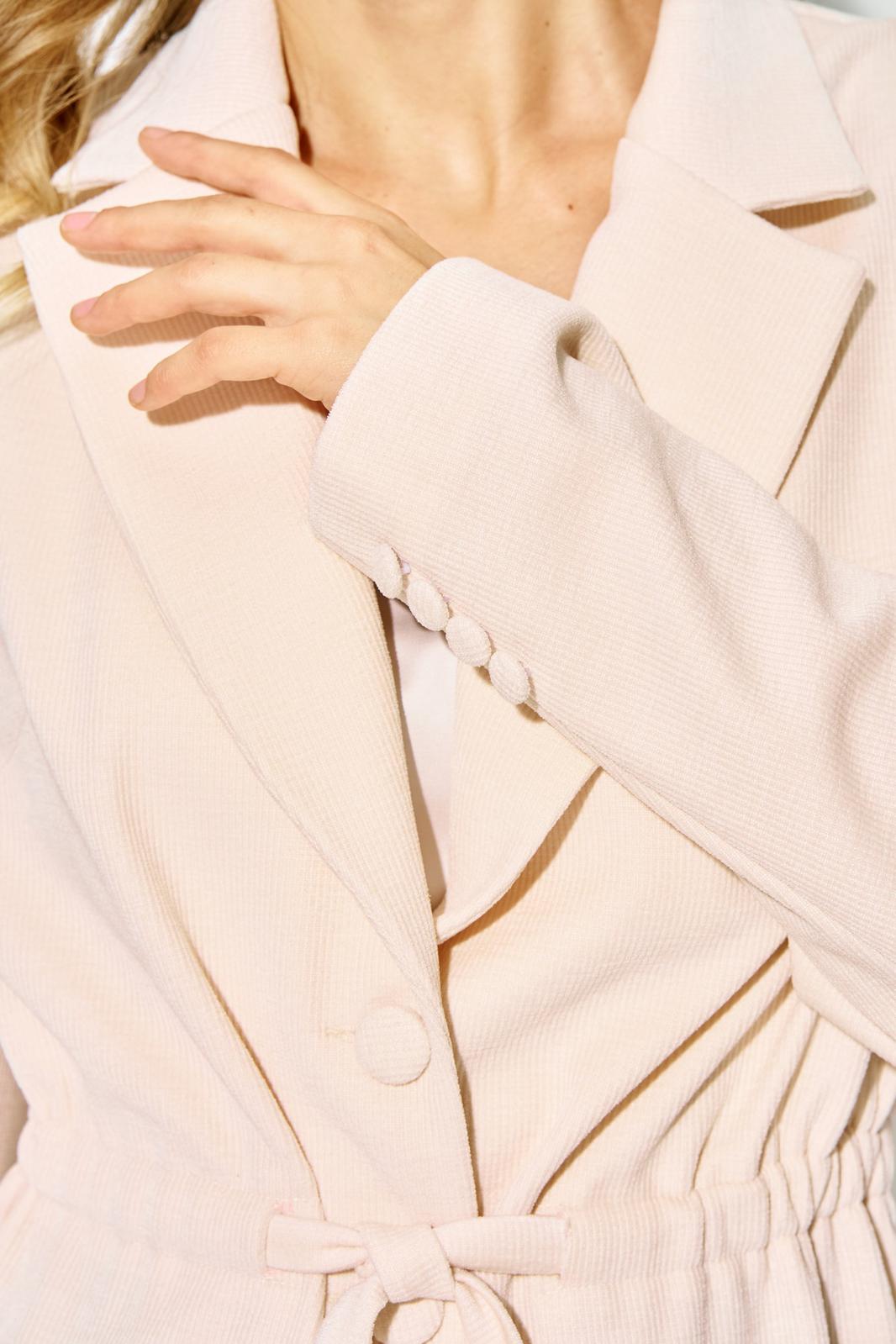 Рукава завершаются изящными пуговицами, добавляя нотку sophistication. Воротник пиджачного типа с прямыми углами и аккуратно обработанными краями завершает этот стильный образ.