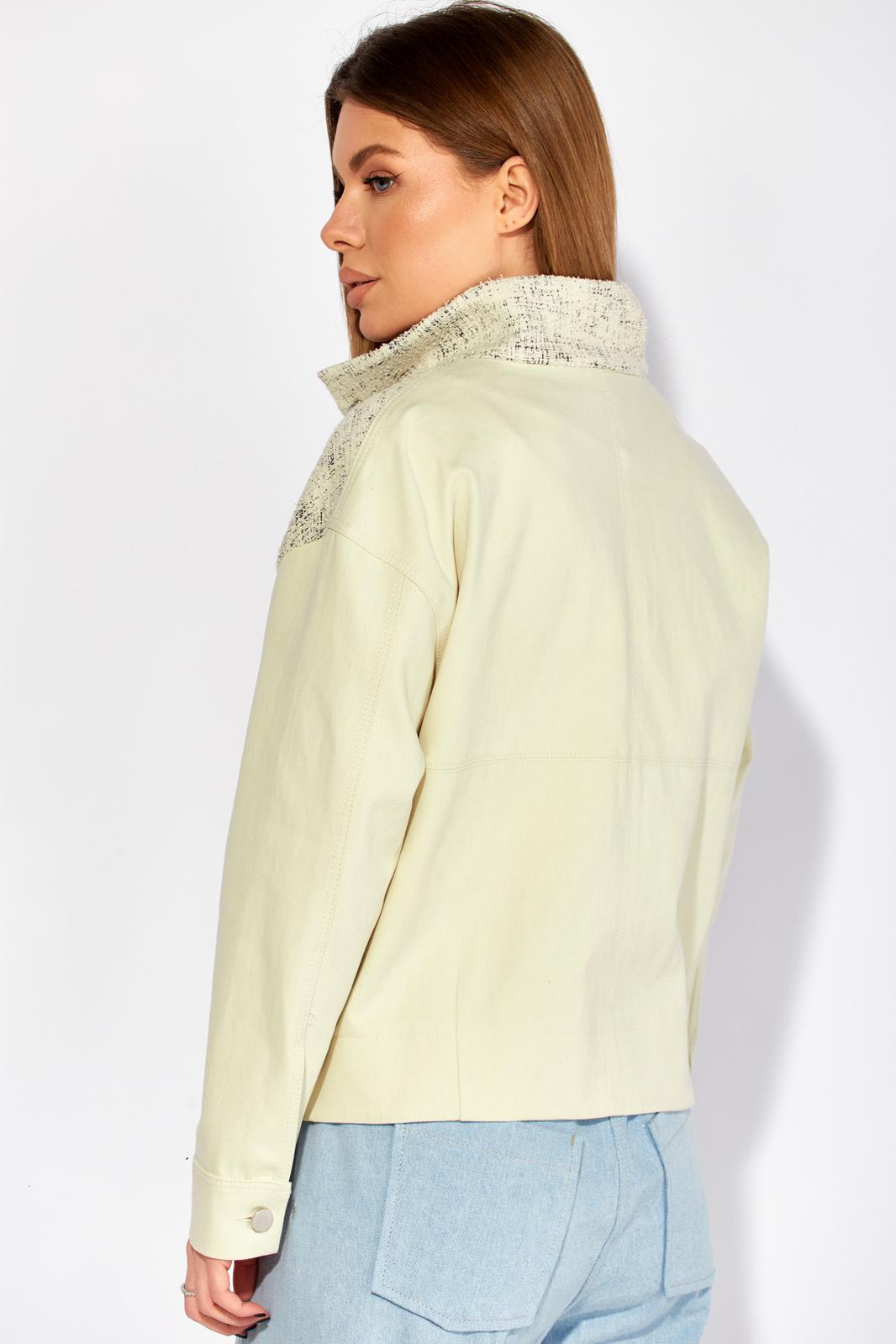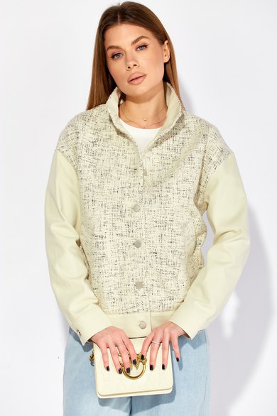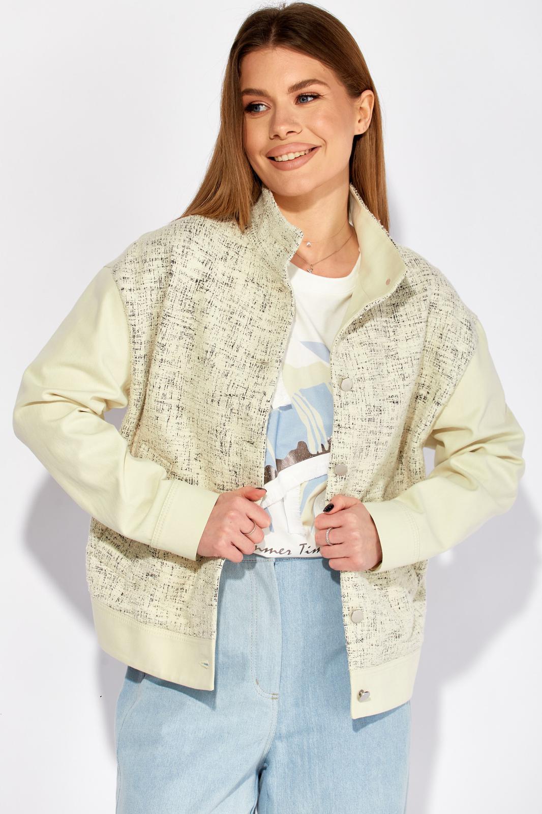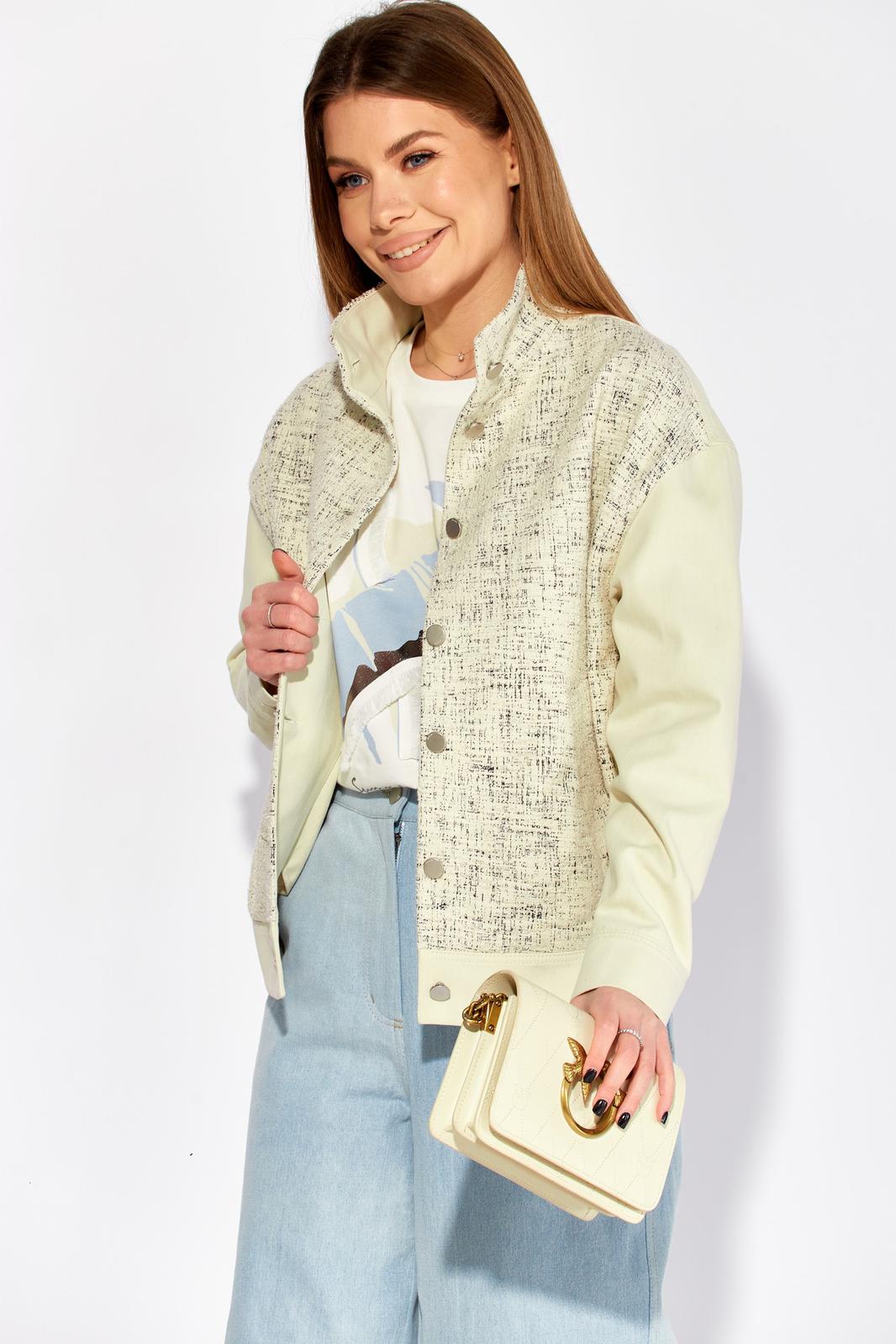 Полочка жакета выполнена из трикотажа, рукава и спинка из джинса, жакет без подкладки. Декор может отличаться от представленного на фотографии.