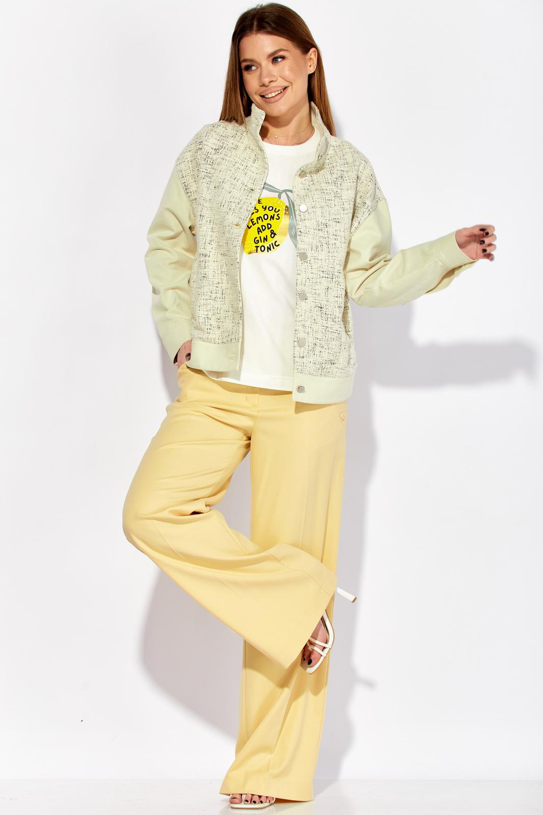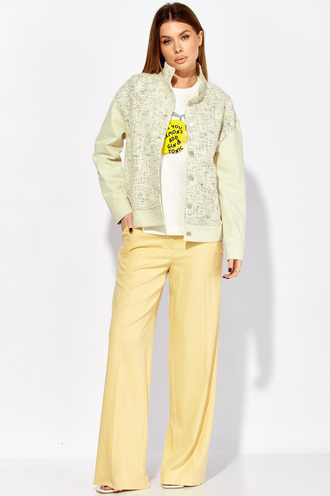 Жакет свободного силуэта длиной до линии бедер идеально сочетает в себе стиль и комфорт. Вырез горловины «под горло» с втачной стойкой. Спущенная линия плеча придает ему расслабленный вид. Центральная застежка на 7 пуговиц, удобные наклонные прорезные карманы с листочками придают жакету практичность и стильный штрих. Детали спинки с горизонтальным подрезом и вытачками внизу обеспечивают идеальную посадку и подчеркивают вашу фигуру. Рукава втачные с притачными манжетами и разрезами в локтевом шве создают дополнительный комфорт и свободу движений.
