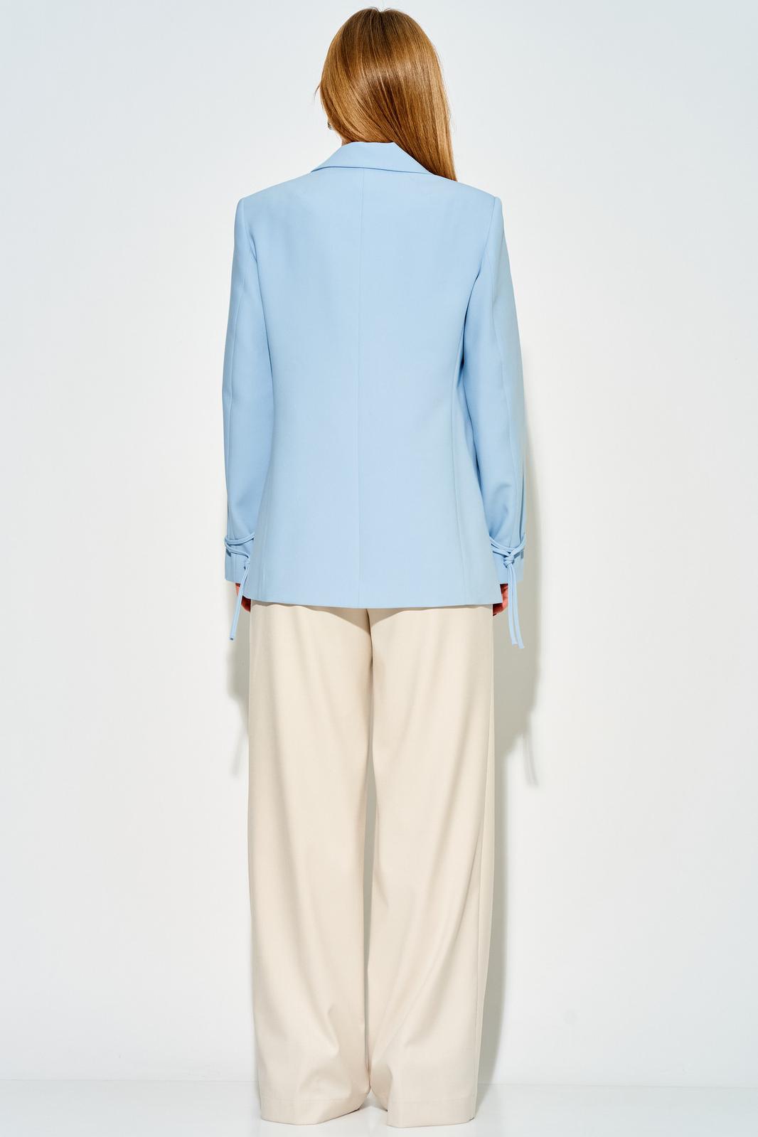 Застежка центральная на 1 петлю и пуговицу, воротник отложной пиджачного типа. Детали переда с рельефными швами, которые заканчиваются разрезами, центральные части с горизонтально расположенными боковыми прорезными рамками и талиевыми вытачками. В левом боковом шве на уровне линии талии вставлена навесная петля для протяжки шнура. Спинка жакета с плечевыми вытачками, со средним и рельефными швами. Рукава втачные двухшовные, внизу передних швов вставлены по две навесные петли для протяжки шнура.