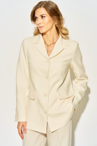 Застежка центральная на петли и пуговицы, воротник отложной пиджачного типа. Детали переда с кокетками и отрезными бочками, в которых обработаны карманы, на уровне линии талии расположены декоративные клапаны. Спинка жакета с кокеткой, нижняя часть с рельефными швами и средним швом, который заканчивается шлицей. Рукава втачные одношовные, по центру вертикальный подрез, внизу шва декоративно прикреплены по 4 пуговицы.