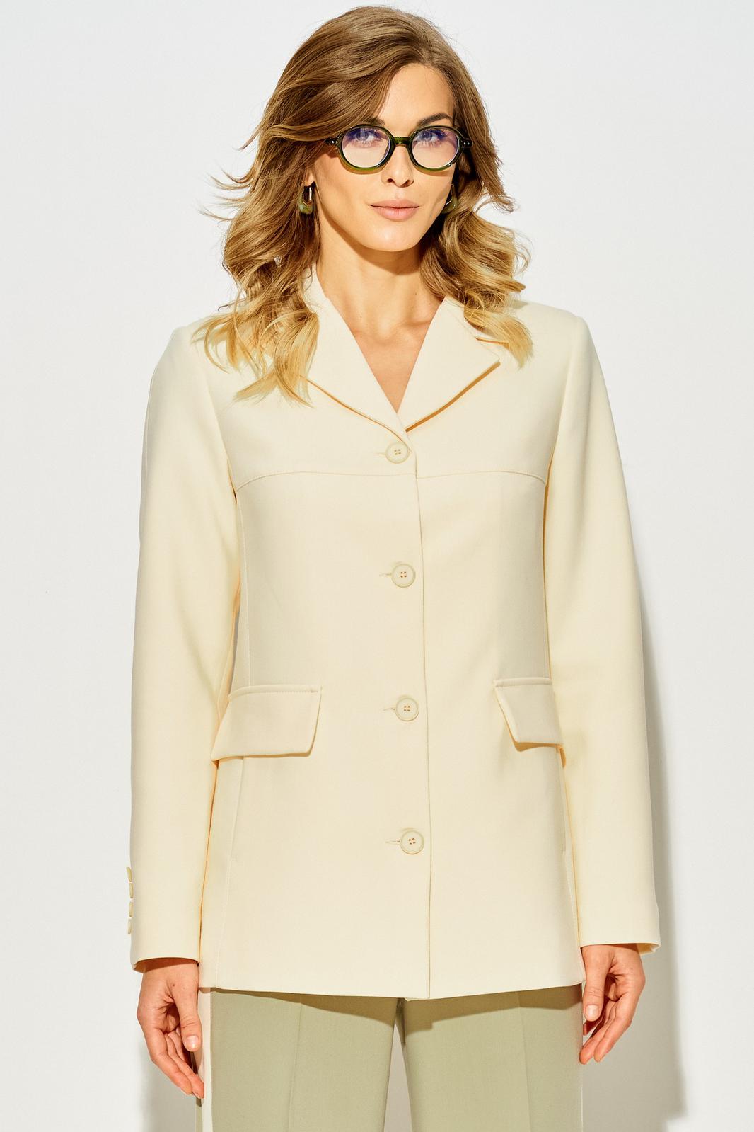 Застежка центральная на петли и пуговицы, воротник отложной пиджачного типа. Детали переда с кокетками и отрезными бочками, в которых обработаны карманы, на уровне линии талии расположены декоративные клапаны. Спинка жакета с кокеткой, нижняя часть с рельефными швами и средним швом, который заканчивается шлицей. Рукава втачные одношовные, по центру вертикальный подрез, внизу шва декоративно прикреплены по 4 пуговицы.