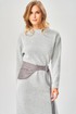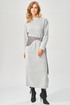 Вырез горловины округлой формы с втачной бейкой. Перед и спинка цельные. Рукава втачные одношовные длинные, линия плеча спущена. В левом боковом шве обработан разрез. В комплекте съемный пояс с застежкой на пряжку. На съемном поясе обработан карман с листочкой с втачными концами.