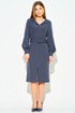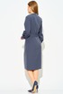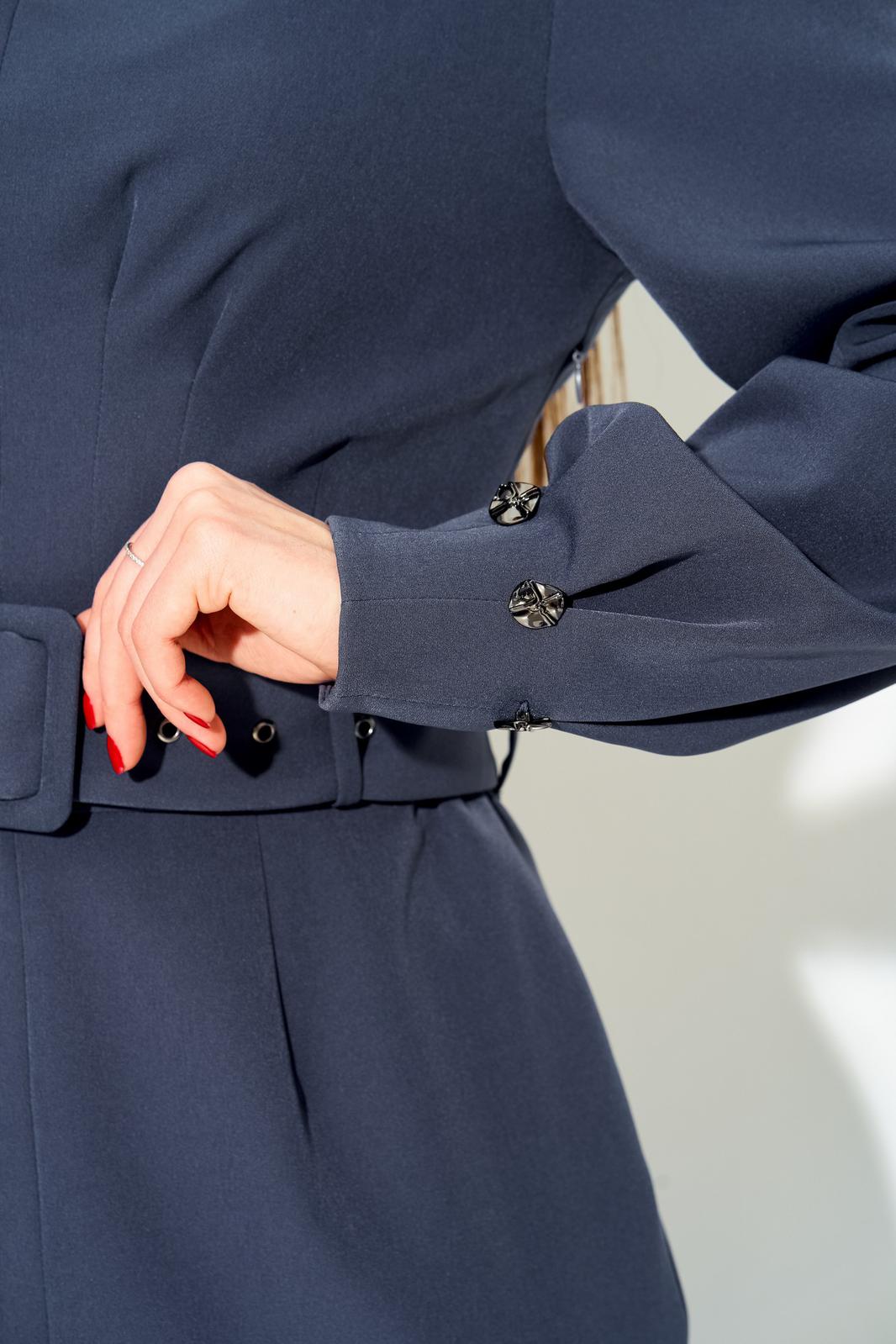 Вырез «V-образной» формы, обработан обтачкой. Перед и спинка платья отрезные по линии талии. Перед со средним швом, который заканчивается разрезом, и декоративными талиевыми вытачками. Рукава втачные одношовные, по низу обработаны по 3 складки, на которых декоративно прикреплены по 3 пуговицы. Низ рукавов обработан обтачкой. На уровне талии расположены шлевки.