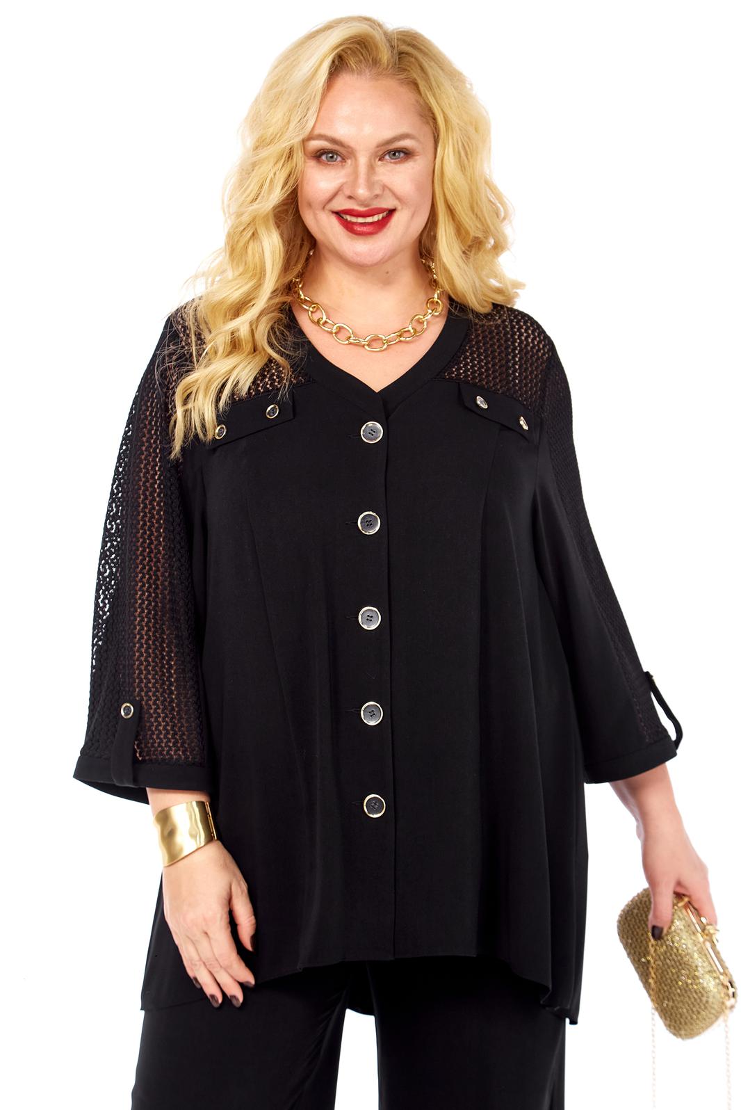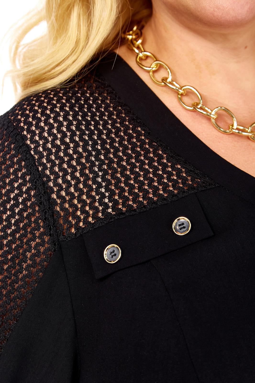 Свободная туника из пластичной струящейся ткани. Горловина V-образная, оформлена бейкой. Впереди кокетка из кружевной ткани, застежка на пуговицы. У кокеток клапаны с декоративными пуговицами. Рукав 3/4. Верхняя часть рукава выполнена из кружева. Низ оформлен бейкой с патой на пуговице.