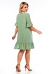Платье А-силуэта, средней длины, на подкладке "Гранд". Овальный вырез горловины. Вытачки у выреза и нагрудные. Впереди вертикальными линиями вставлена тесьма, зрительно удлиняющая фигуру, по спинке шов и застежка "молния". Внизу платье оформлено воланом с легкой сборкой. Рукав пикрываент локоть, по внешнему шву - декор тесьмой, низ рукава оформлен воланом со сборкой.