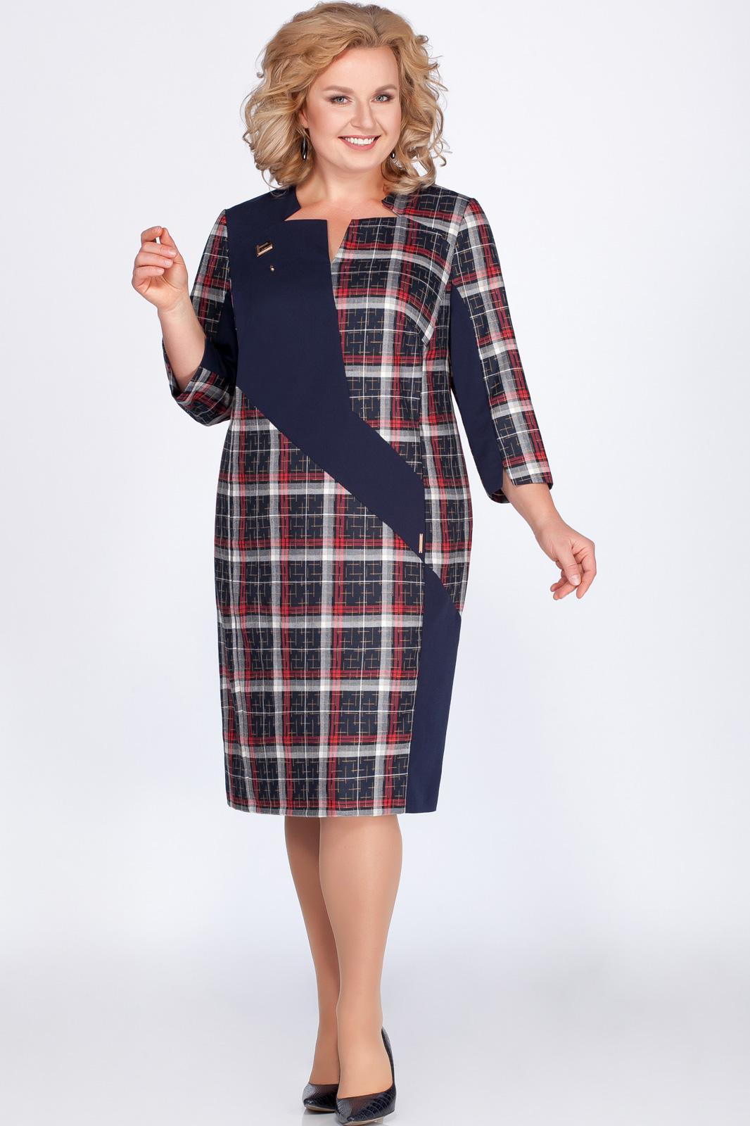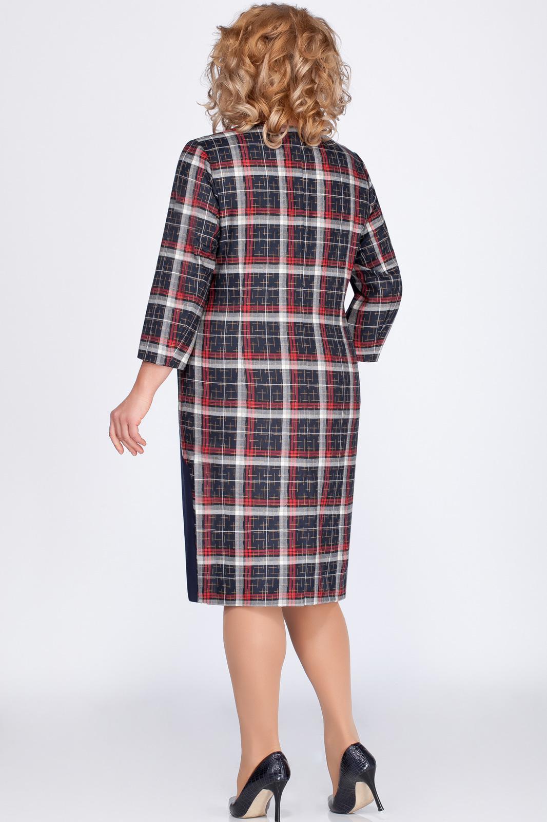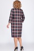 Платье средней длины полуприлегающего силуэта, выполнено на сочетании ткани в клетку и однотона. Вырез горловины в виде звездочки. С правой стороны вставка из однотонной ткани, проходящей наискосок по центральной детали платья и заканчивающейся на боковой детали. Справа декоративная булавка, слева – лейба. Рельеф от проймы + нагрудные вытачки. По спинке центральный шов, шлица и талиевые вытачки. В боковом шве молния. Рукав ¾ двухшовный, нижняя деталь из однотонной ткани, по внутреннему шву разрез. Состав ткани: 65% полиэстер, 32% вискоза, 3% спандекс. Длина платья сзади по спинке от плечевого шва 104 см, длина рукава 48 см.
