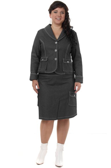 Комплект женский из джинса. Полочка и спинка жакета с двумя рельефами, на полочке два объемных кармана и клапана. Рукав длинный на манжете с 1 пуговицей. Жакет застегивается на 3 пуговицы, на карманах по 2 пуговицы. Юбка на запах с двумя объемными карманами. Молния в боковом шве. На карманах юбки по 1 пуговице. Длина жакета – 58 см (в 54-м р-ре). Длина рукава - 59 см (в 54-м р-ре). Длина юбки – 60 см (в 54-м р-ре).