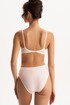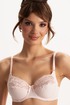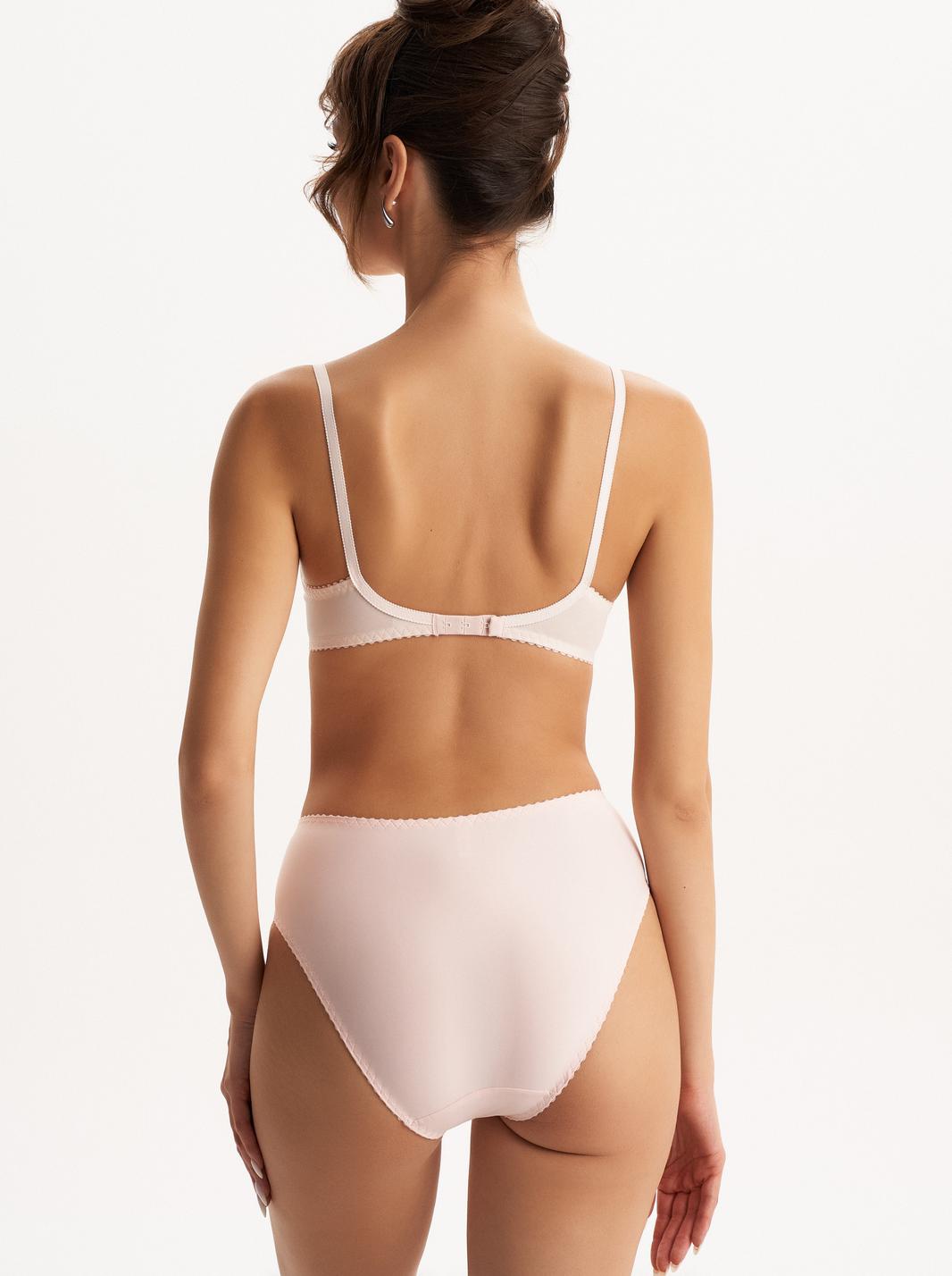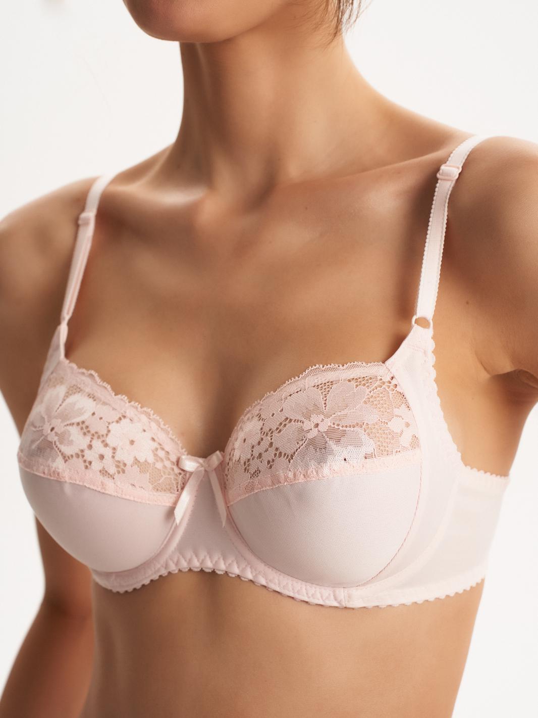Бюстгальтер с мягкой чашкой, выполненный из эластичного трикотажного полотна и декорированный эластичным кружевом в верхней части чашки. Есть боковая поддерживающая деталь, обеспечивающая дополнительное приподнимание груди. В модели присутствуют каркасы (косточки). Бретели регулируются по длине. Ширина бретелей увеличивается пропорционально увеличению размера (1,0 см, 1,5 см, 2,0 см, 2,5 см). В самых маленьких размерах застежка на 1 крючок из двух позиций, в большинстве размеров застежка на 2 крючка из трех позиций; в больших размерах на 3 крючка с выбором из трех позиций.